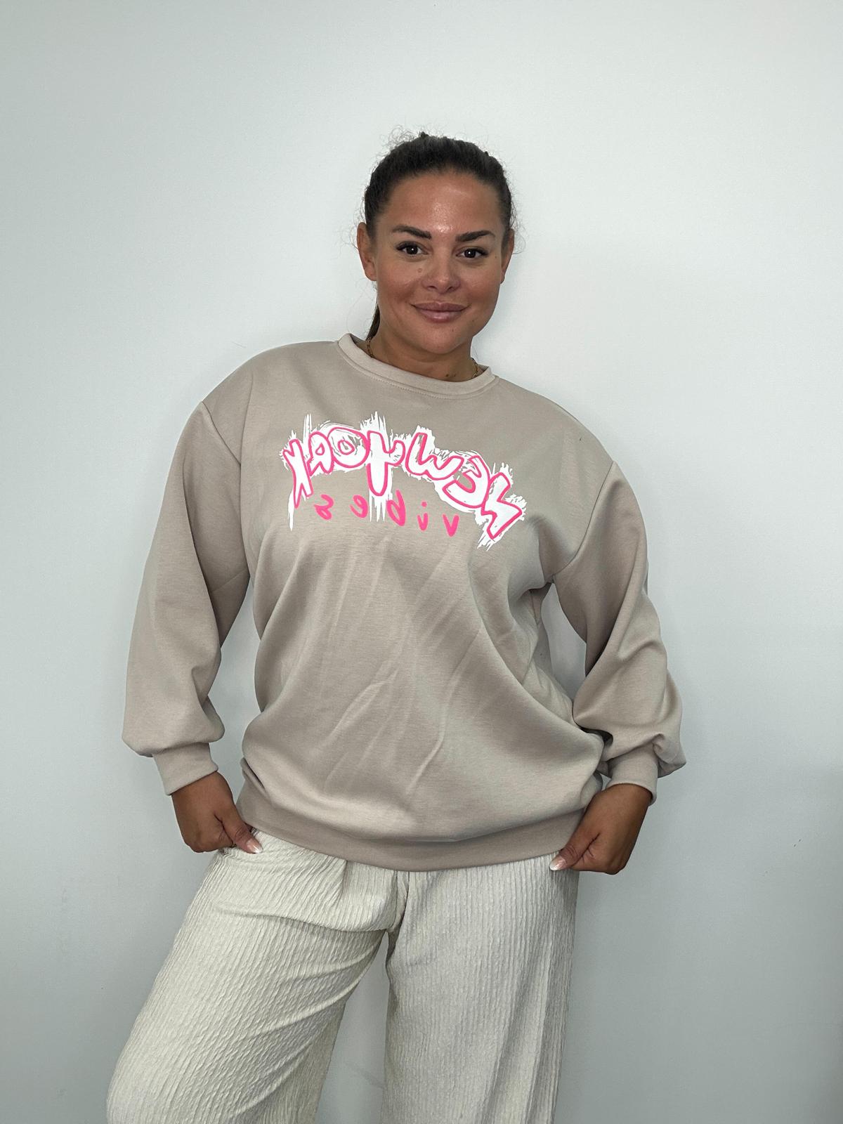This Plus Size Sweatshirt with New York Vibe slogan print. Designed in a relaxed fit with long sleeves and elasticated cuffs, it combines comfort with trend led styling. The soft fabric ensures all day wearability, while the neutral beige base keeps it versatile for layering. A perfect wholesale option for retailers seeking fashionable plus size sweatshirts with standout details.