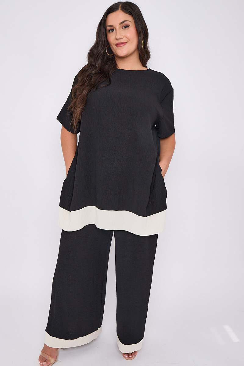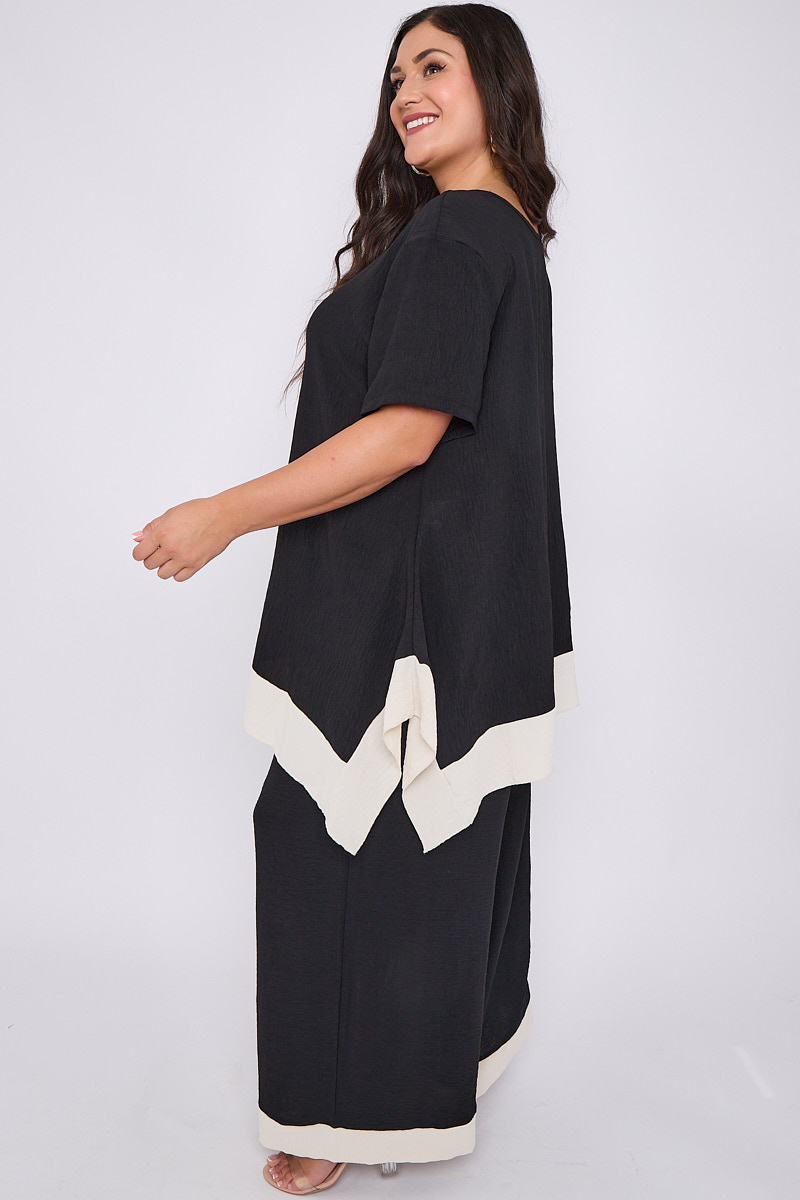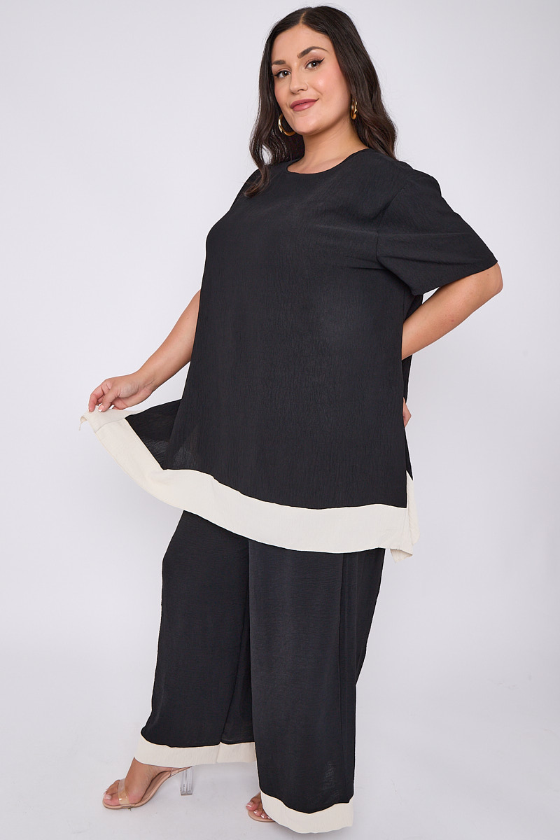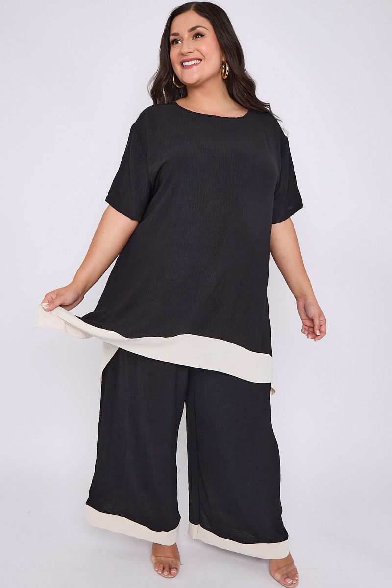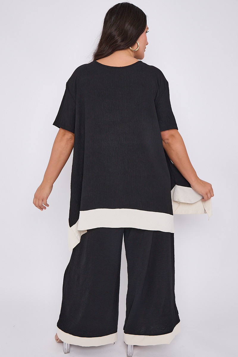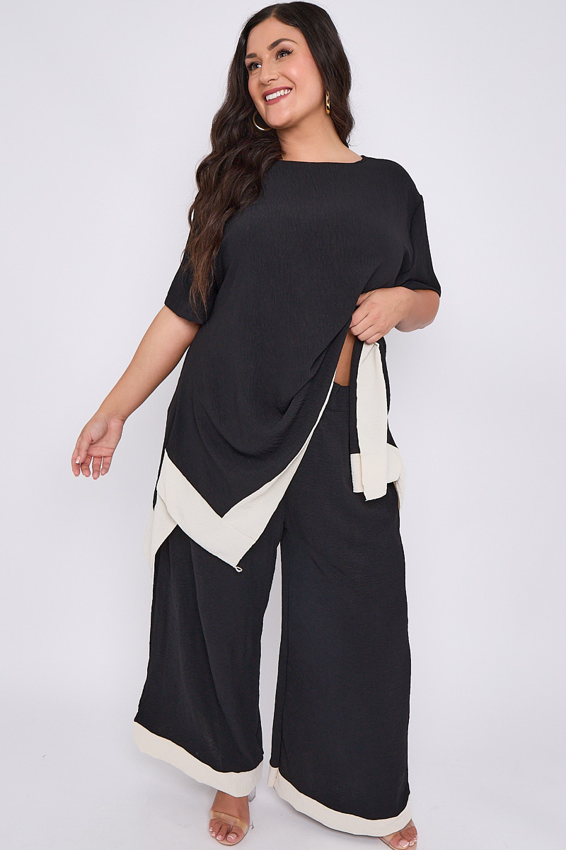 Plus Size Black 2 Piece Contrast Trim Co Ord Set With Asymmetric Top & Wide Leg Trousers x 5