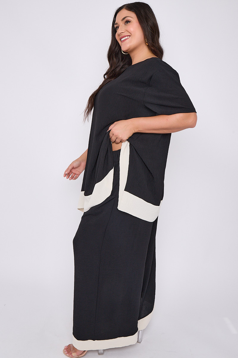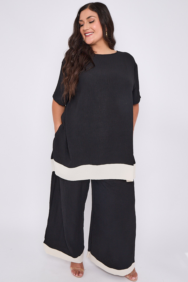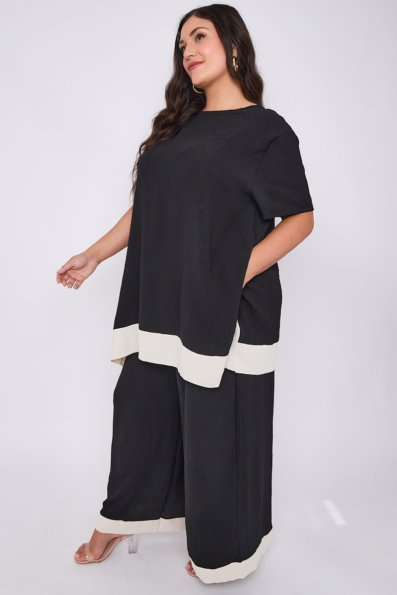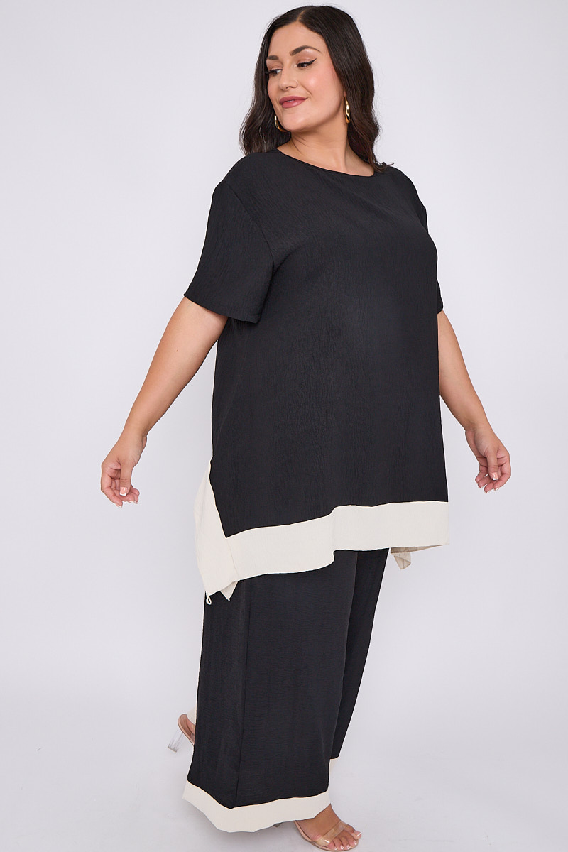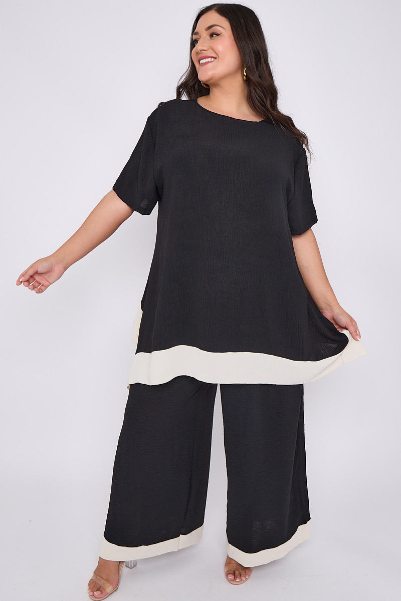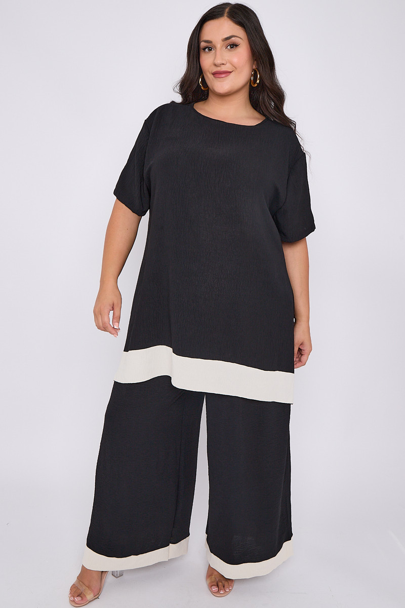 Plus Size Black 2 Piece Contrast Trim Co Ord Set With Asymmetric Top & Wide Leg Trousers x 5