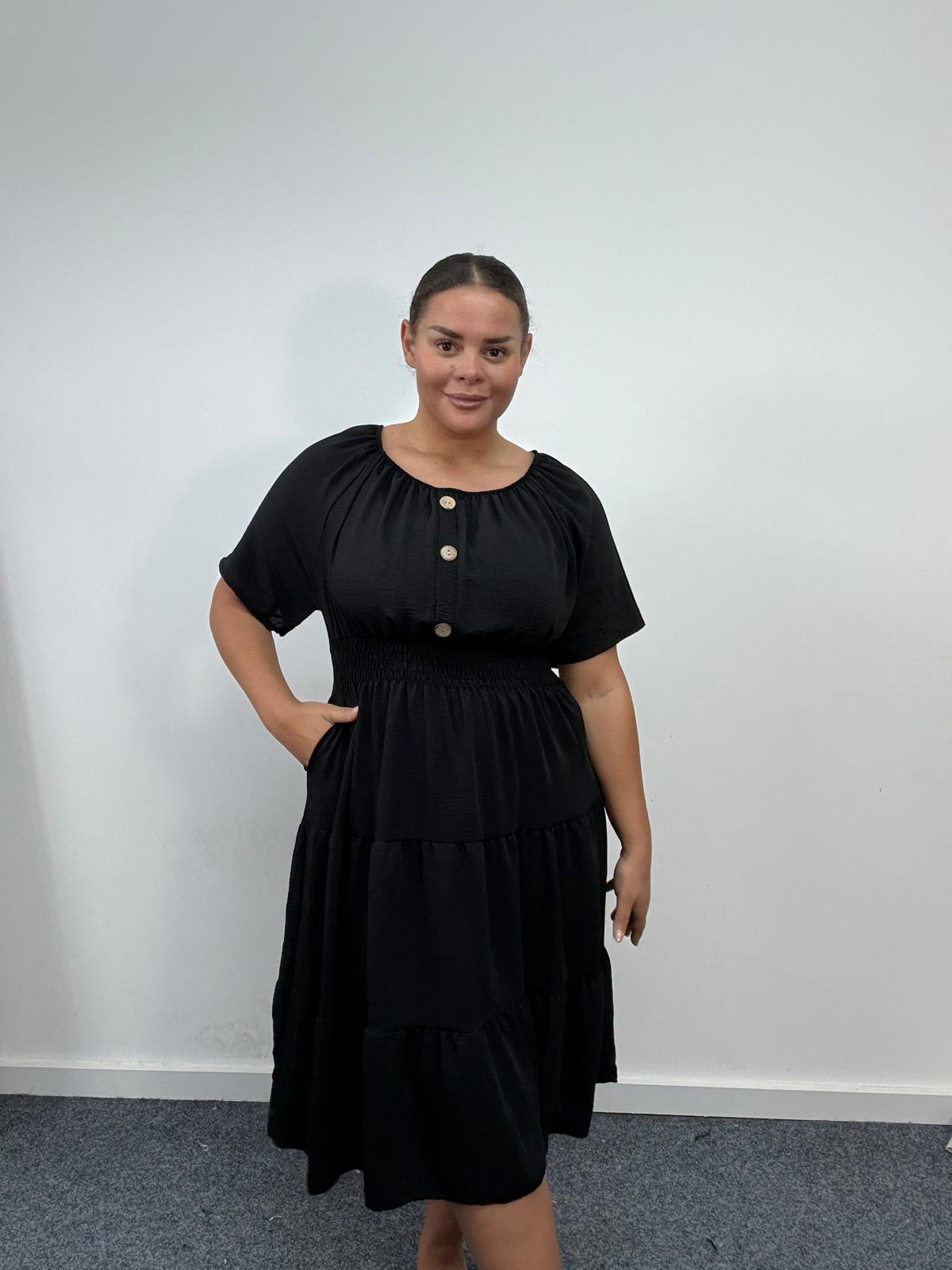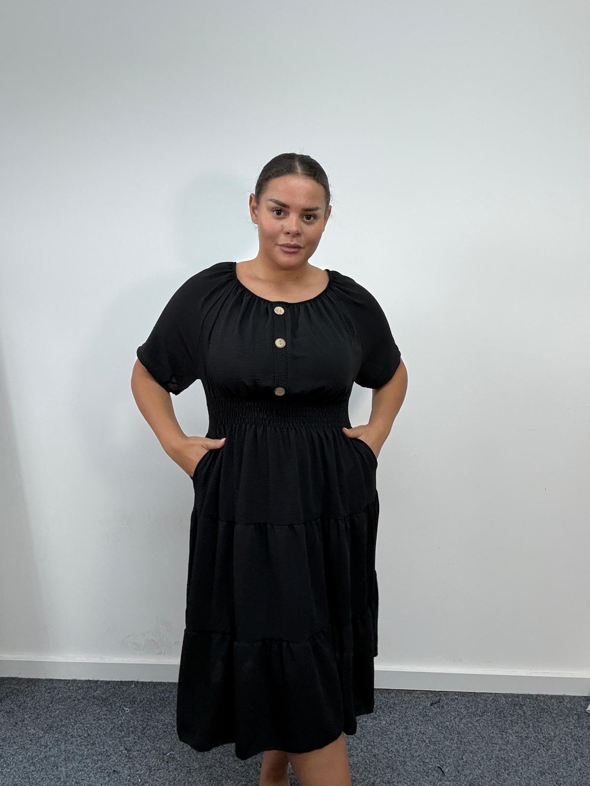 Plus Size Black Button Detail Tiered Midi Dress with Pockets x 2, 3 & 5 Pack Options