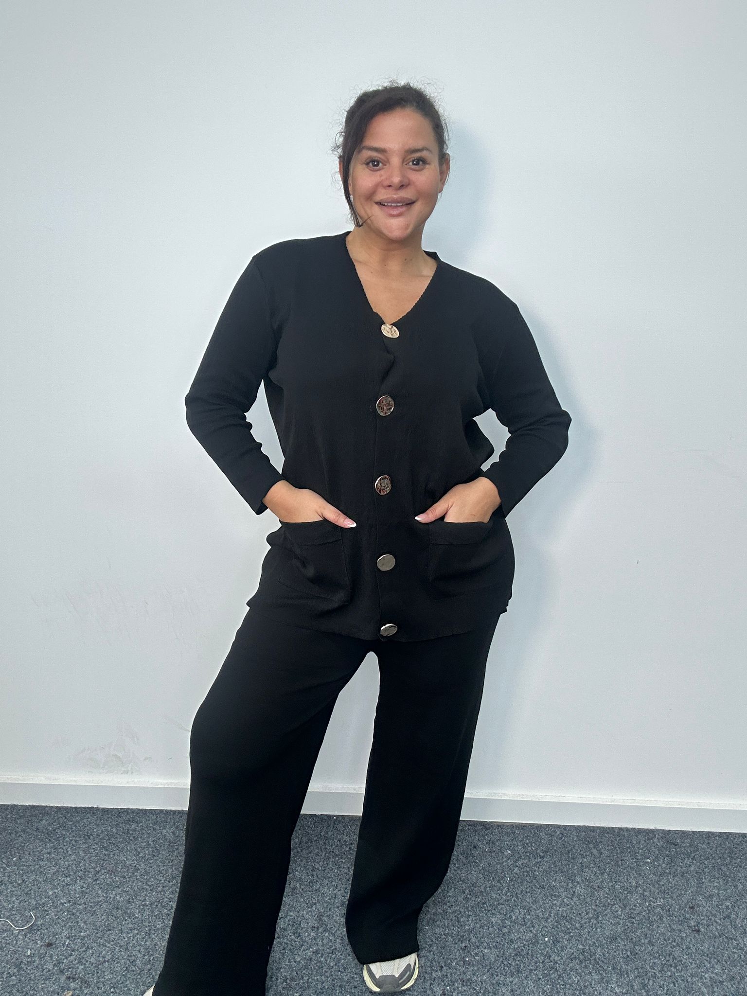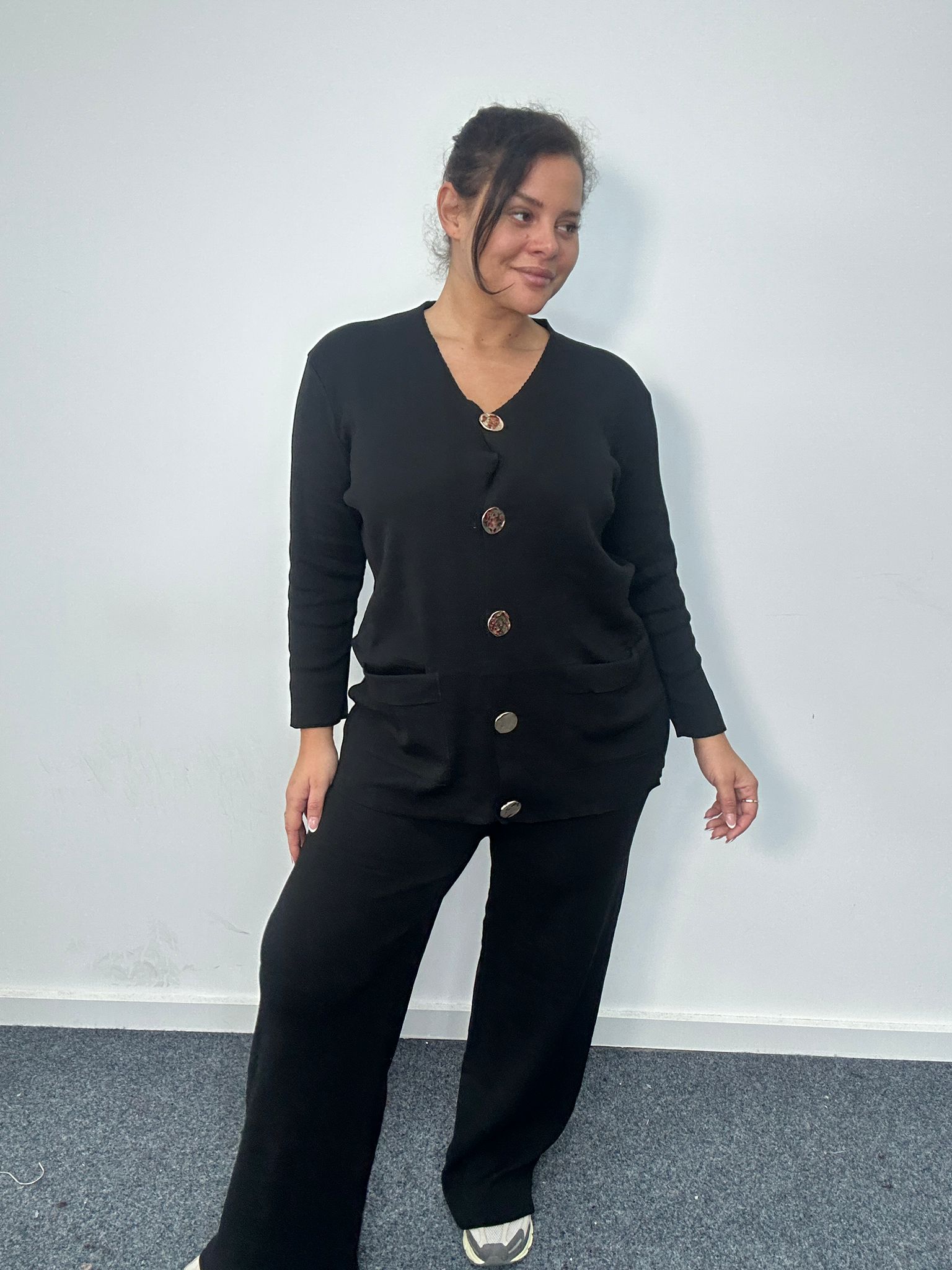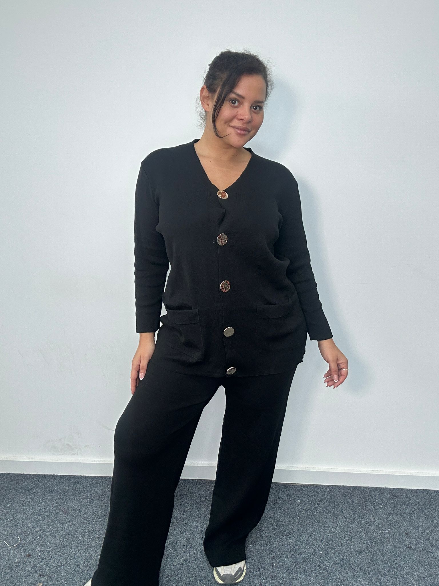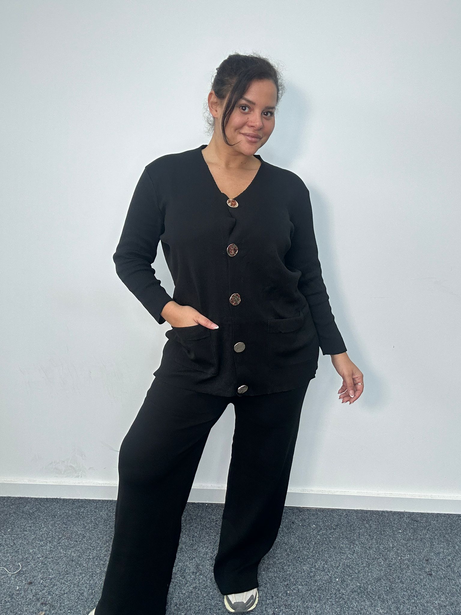 Upgrade your loungewear offering with this chic and comfortable two-piece set, designed for effortless everyday wear. Crafted from a soft, lightweight fabric, this set includes a relaxed long-sleeve top with oversized buttons and matching wide-leg trousers for a coordinated, modern look. Ideal for boutiques, online retailers, and lifestyle stores looking to expand their plus-size casualwear range.