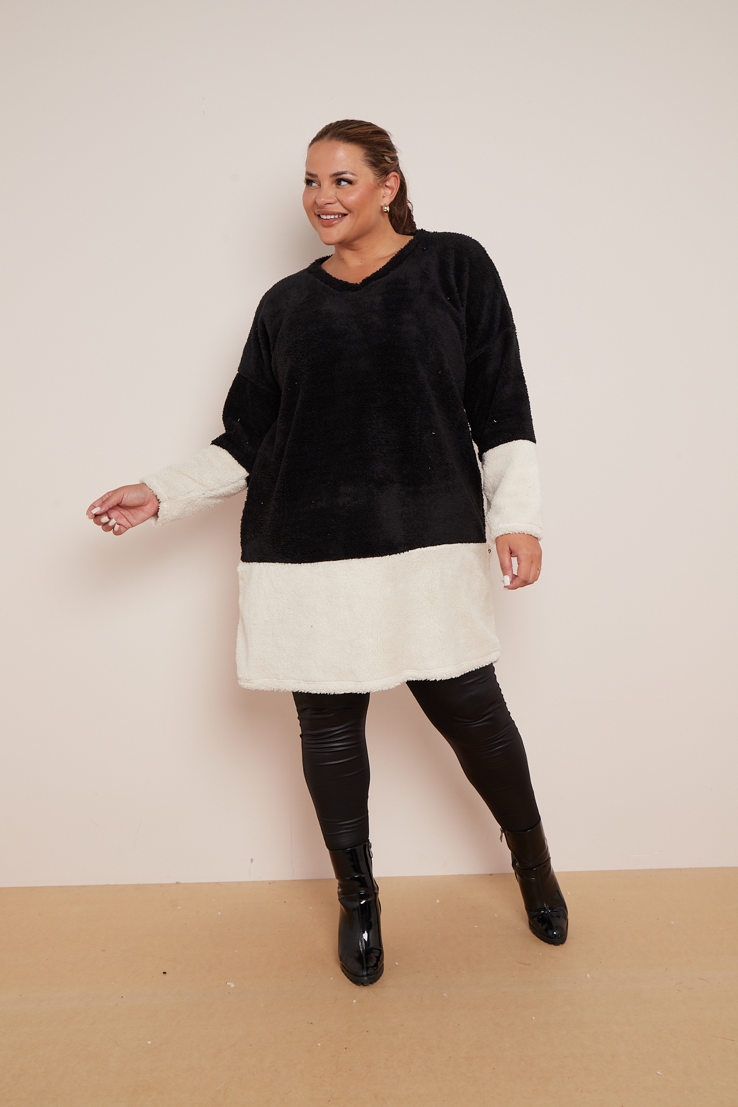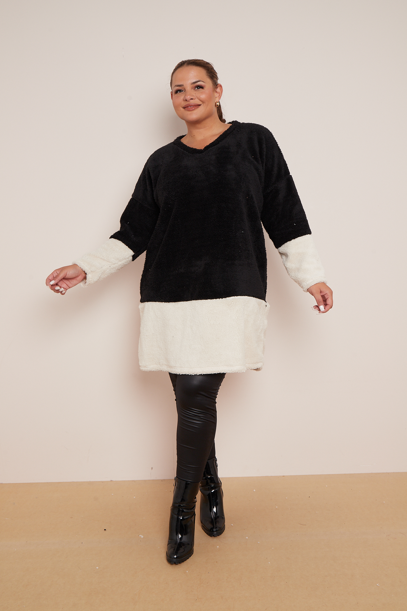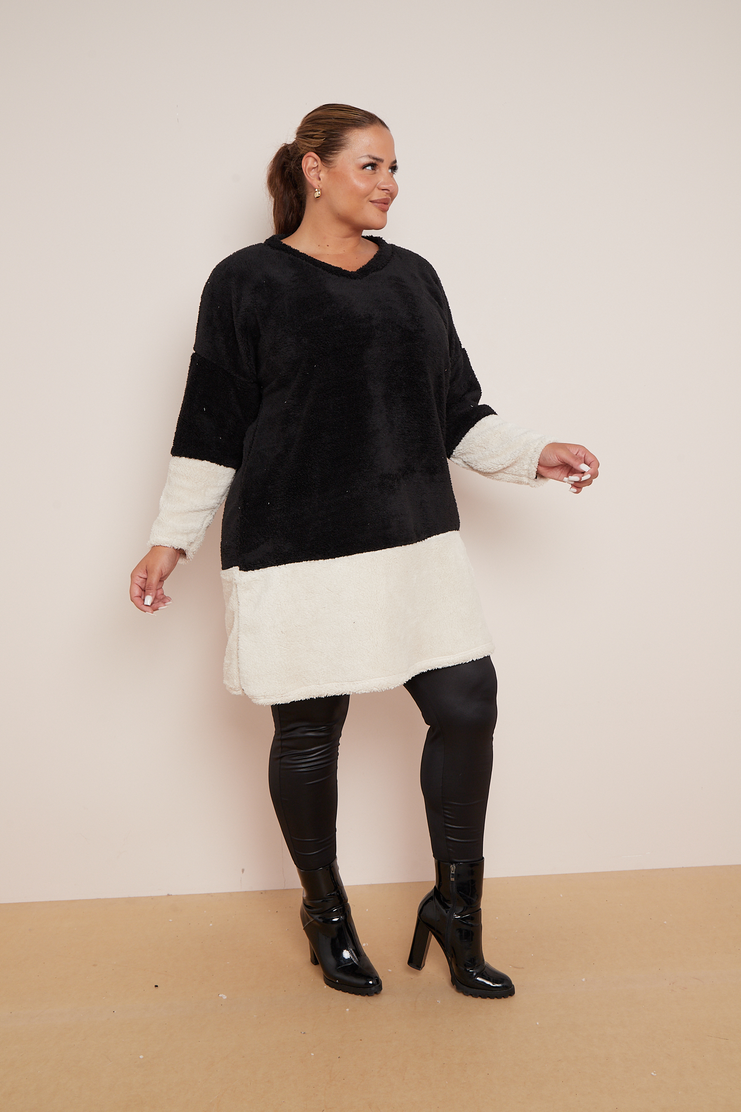 Plus Size Black Contrast Fabric Teddy Long Sleeve Mid Length Top x 5