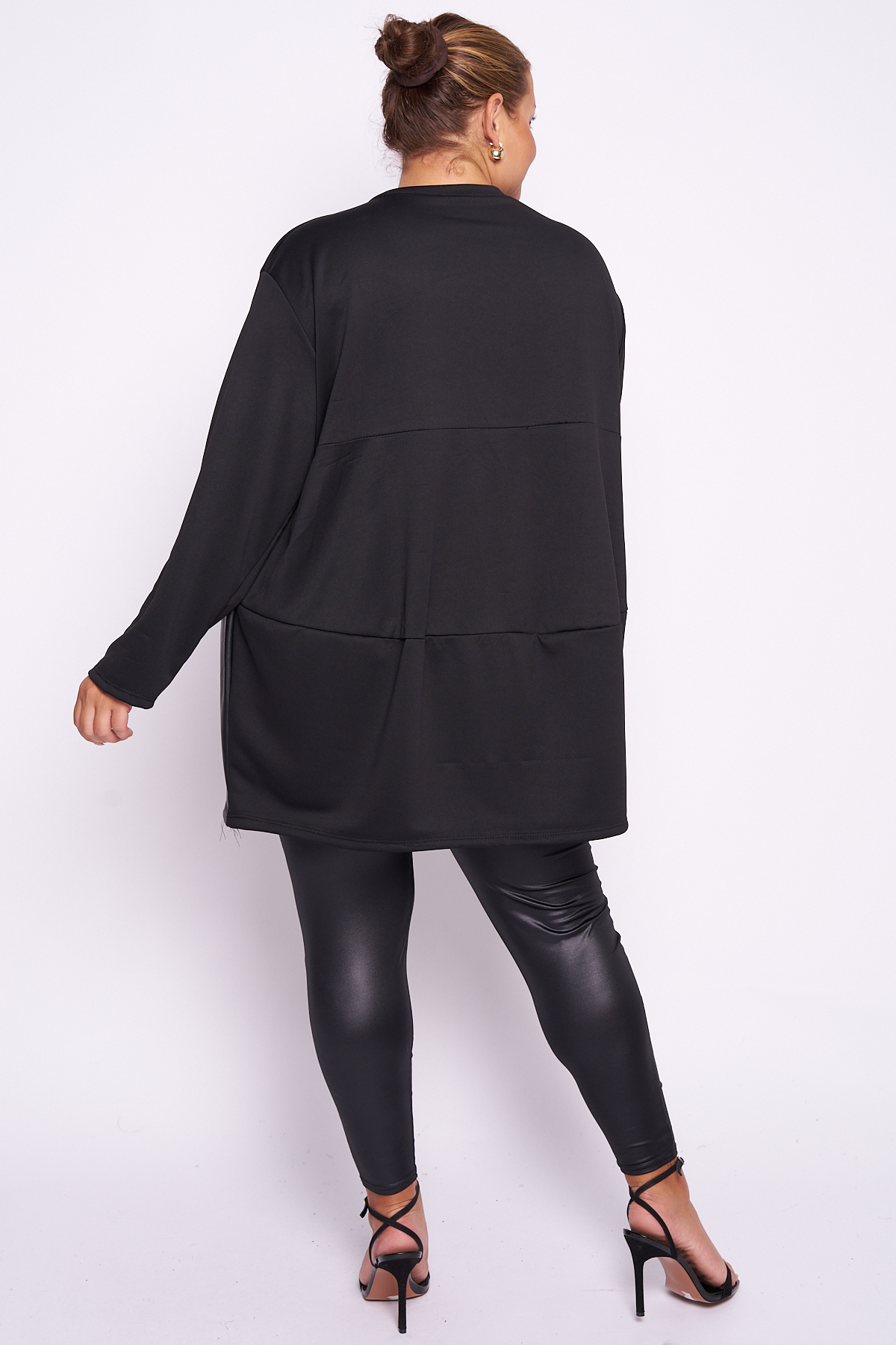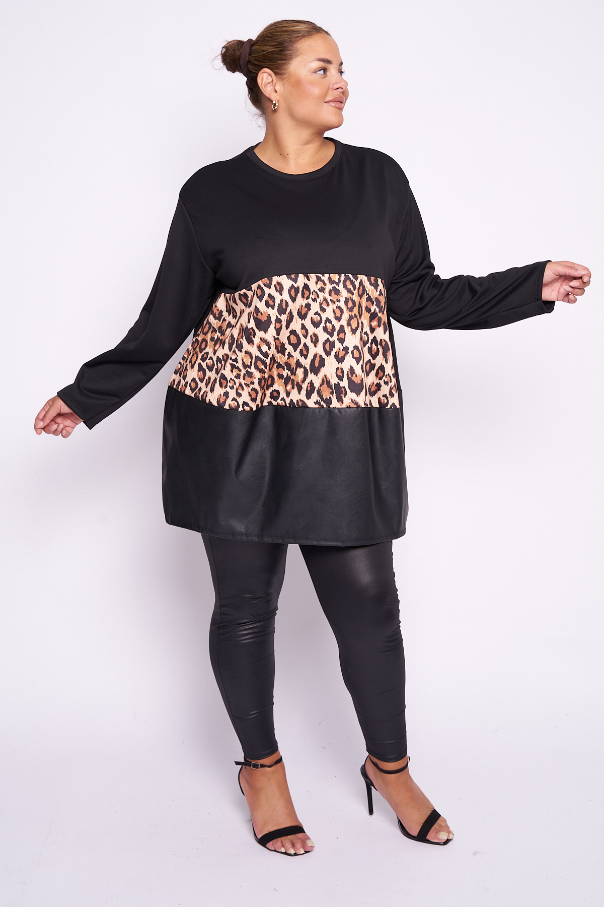 Plus Size Black Contrast leopard Print PU Leather Look Long Sleeve Top x 5