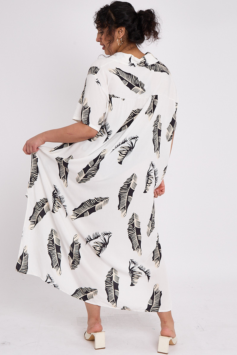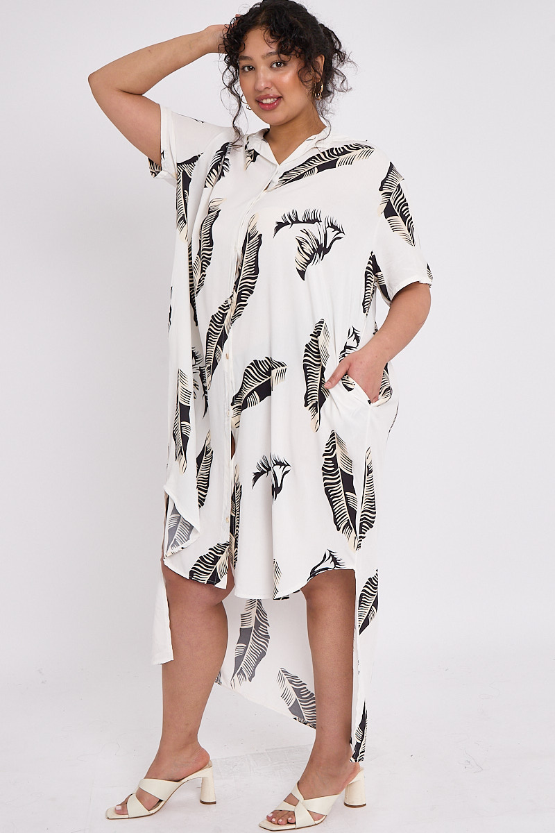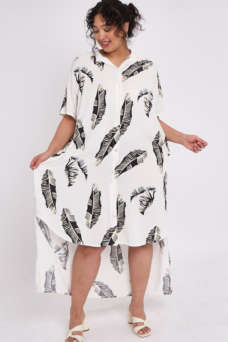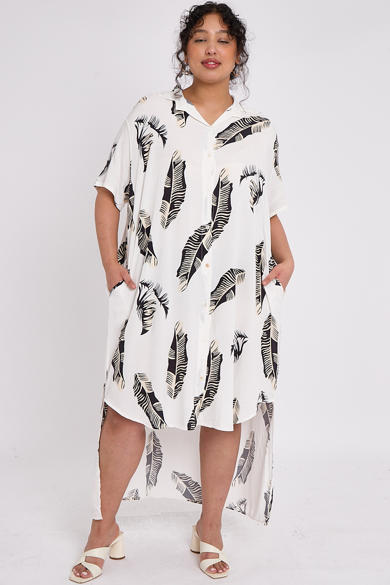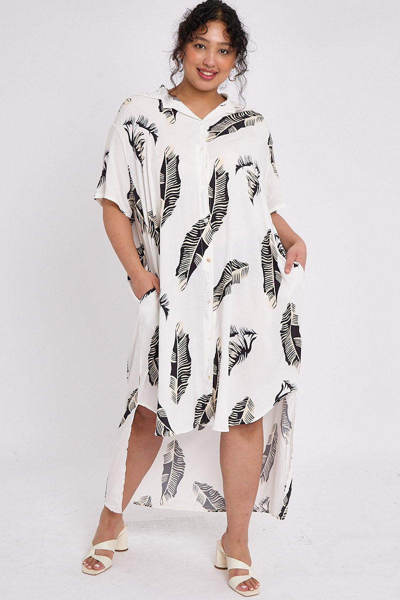Plus Size Black Leaf Print Dip Longline Hem Button Through Shirt Style Dress With Pockets x 5