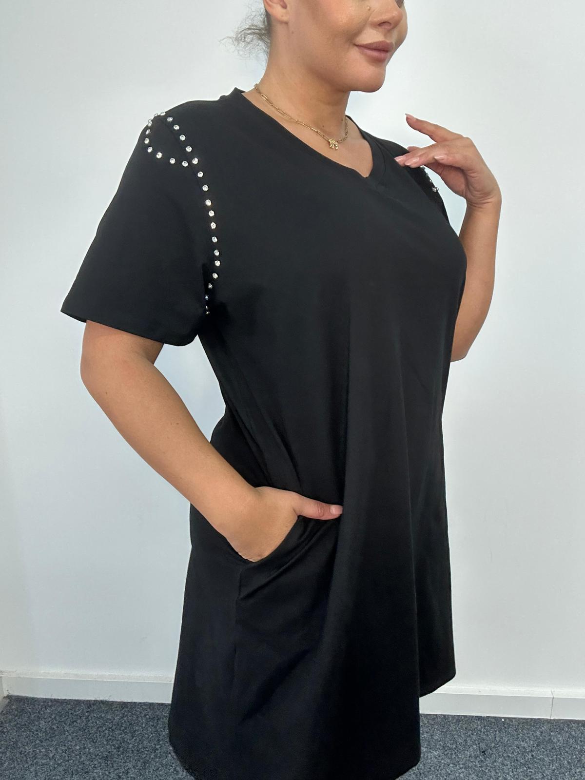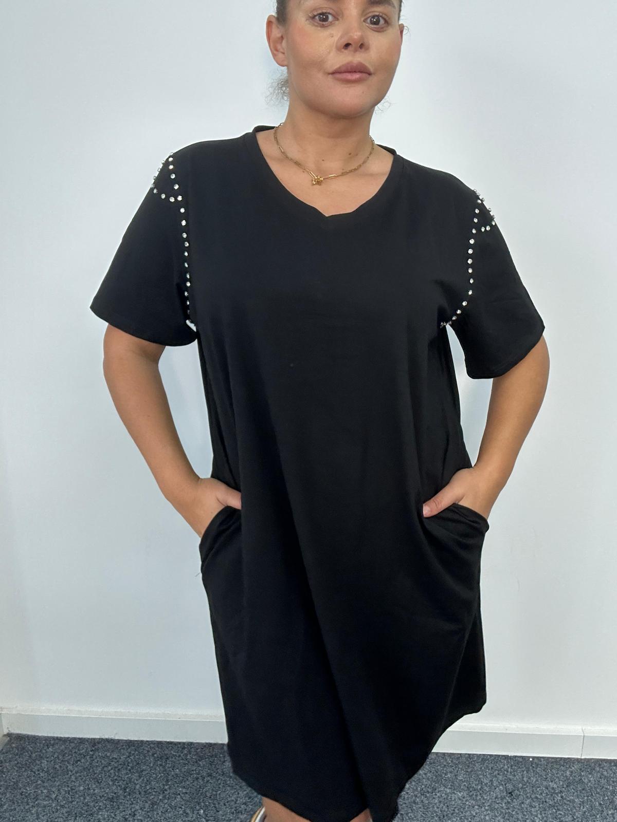 Elevate your casualwear collection with this chic Plus Size Pearl Shoulder T-Shirt Dress. Designed for comfort and effortless style, this dress features short sleeves, a flattering v-neck, and pearl embellishment detailing across the shoulders for a touch of glam. A boutique bestseller that combines versatility, comfort, and on-trend detailing.