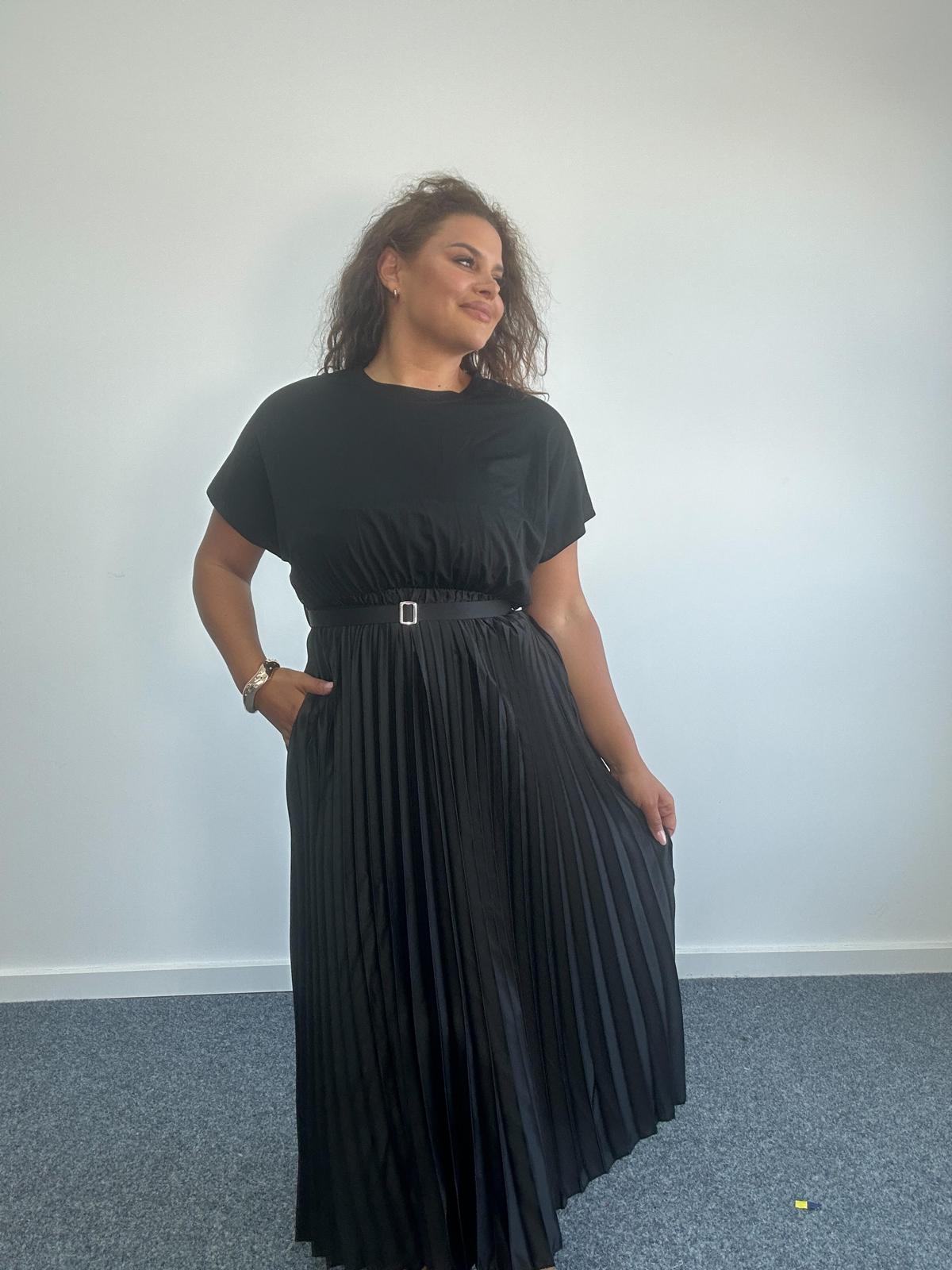 Inject sophisticated movementinto your plus size collection with this stunning Pleated Belted Midi Dress. This dress features a soft jersey-style bodice with a high neckline, gently draped short sleeves, and a sharply pleated satin-look skirt that flows beautifully with every step. A matching belt cinches the waist to accentuate curves, creating a silhouette that’s both refined and comfortable. Finished with hidden pockets for practical elegance, it’s ideal for eventwear, brunches, or transitional day-to-night styling.