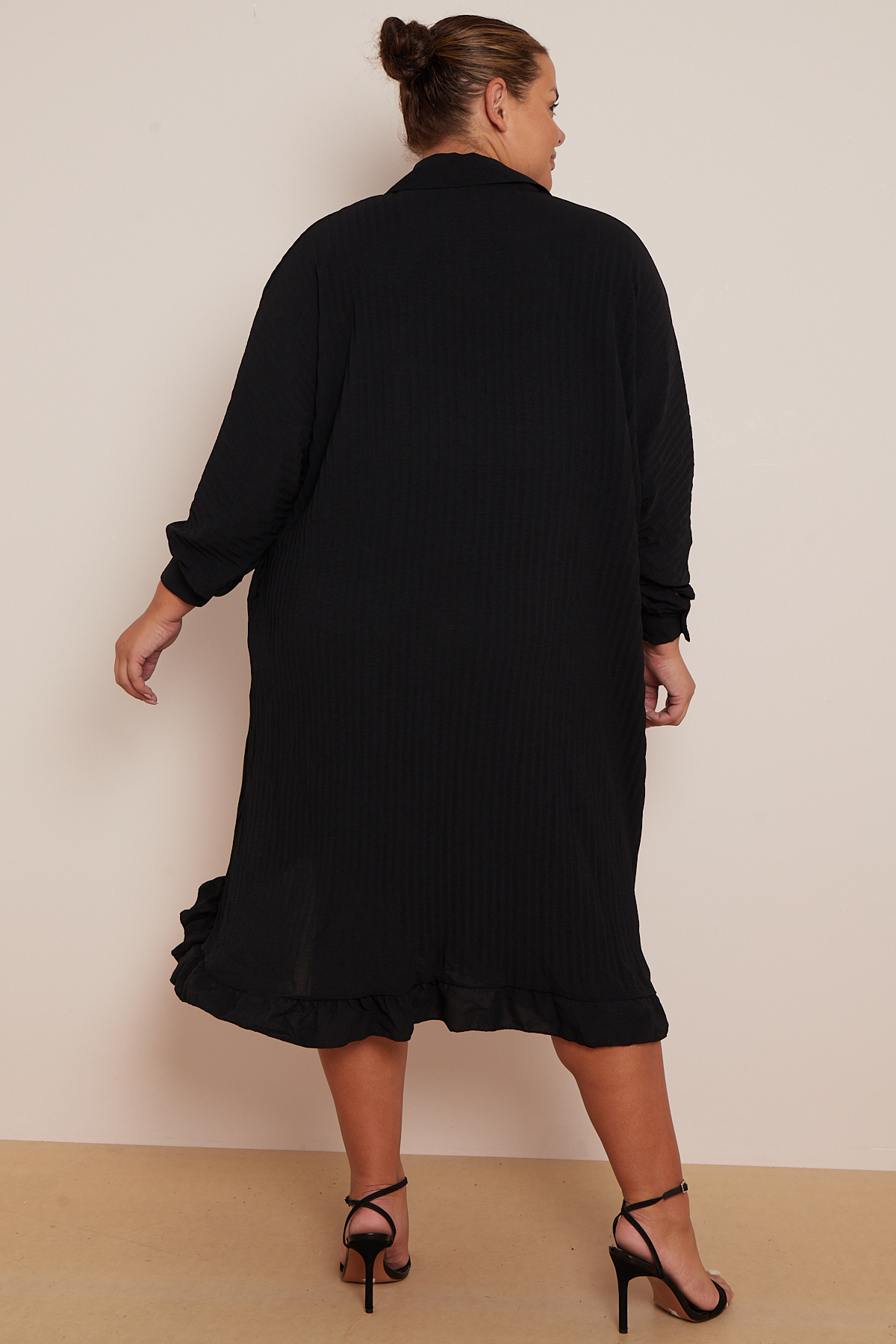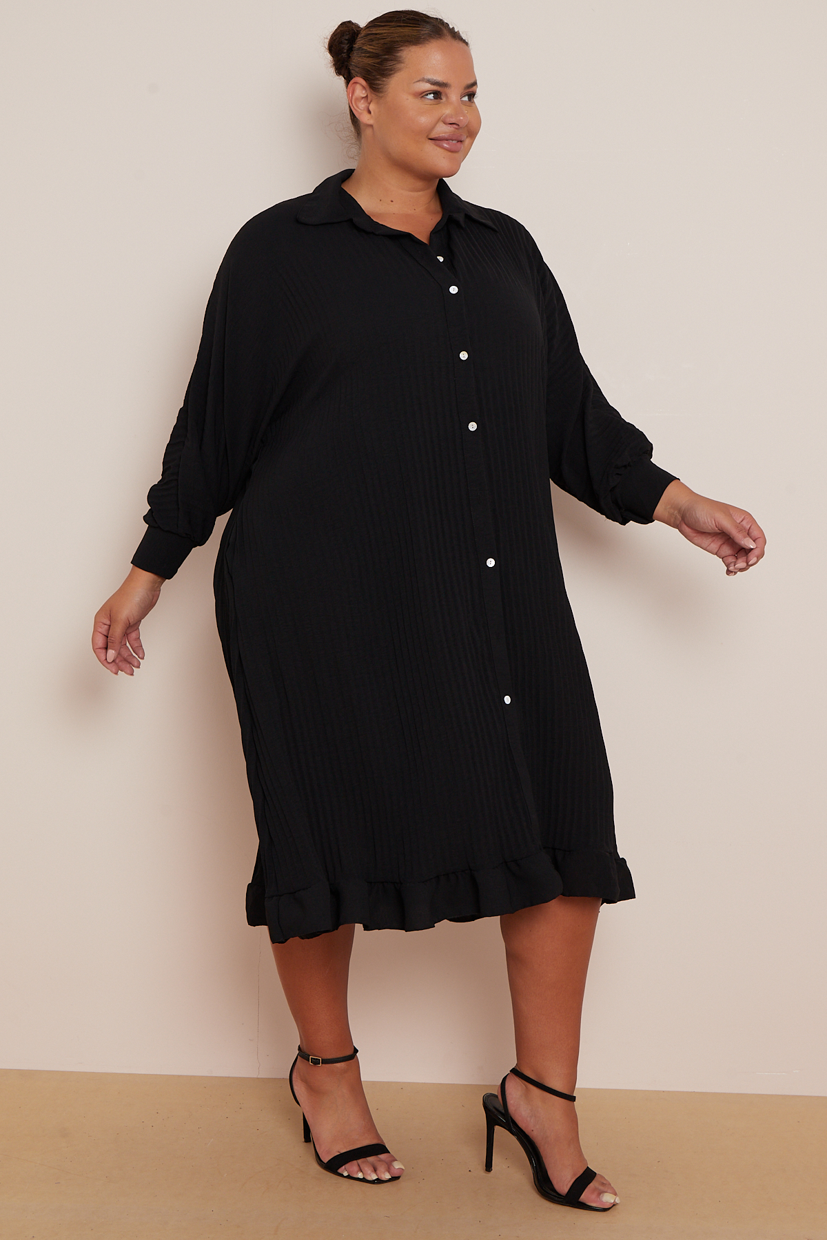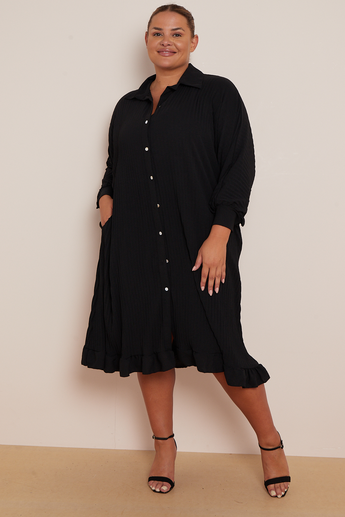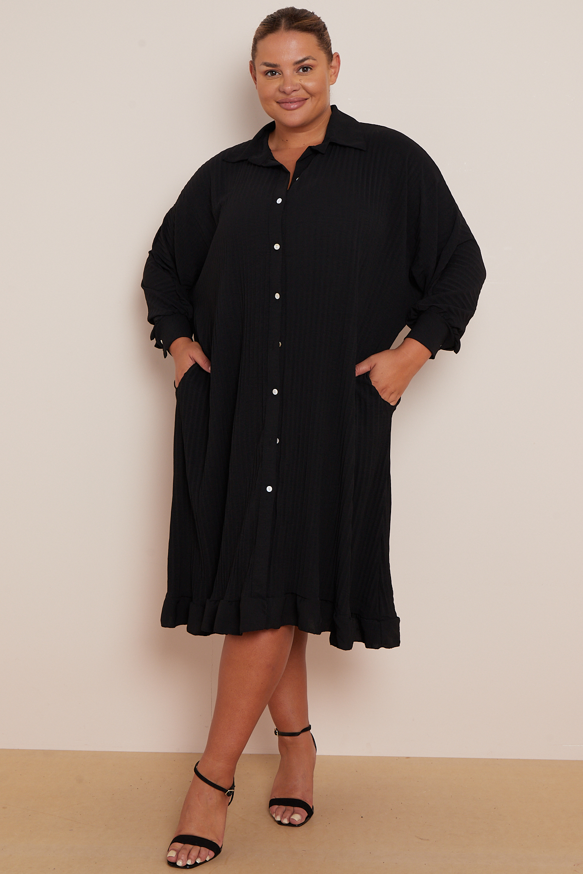 Plus Size Black Pleated Shirt Style Button Through Frill Hem Dress With Pockets x 5