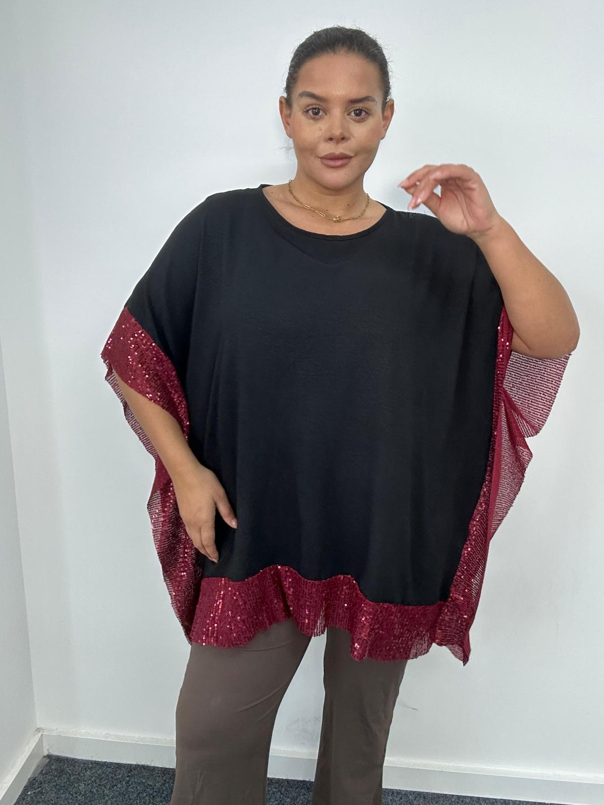 Bring bold elegance to your boutique collection with this Plus Size Poncho Top with Sequin Trim. Crafted for a flowing, flattering fit, this statement top features a soft black body with a dramatic sequin border along the hem and sleeves, adding instant glamour to any outfit. Designed for comfort and style, the loose poncho silhouette drapes beautifully over all body shapes, making it ideal for evening looks, festive collections, or special occasions. A standout wholesale piece for boutiques and online retailers seeking chic, easy-to-wear sparkle.