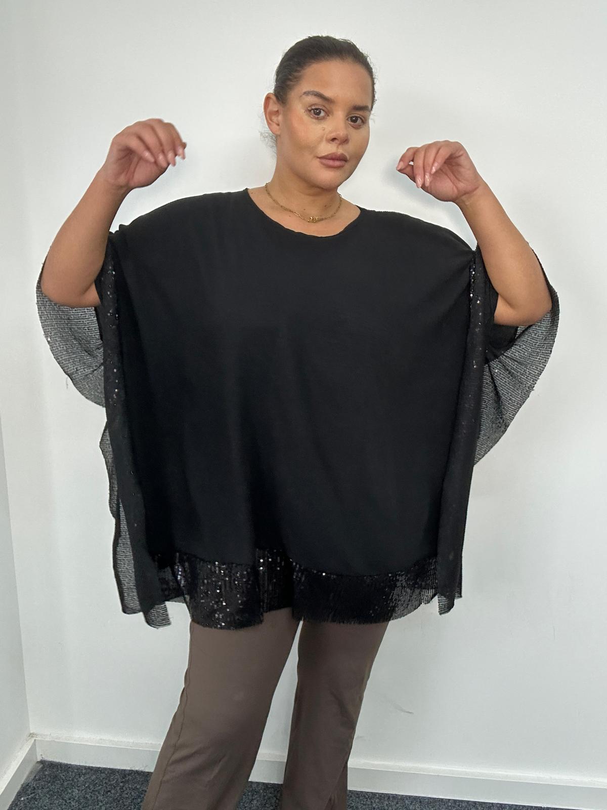 Bring bold elegance to your boutique collection with this Plus Size Poncho Top with Sequin Trim. Crafted for a flowing, flattering fit, this statement top features a soft black body with a dramatic sequin border along the hem and sleeves, adding instant glamour to any outfit. Designed for comfort and style, the loose poncho silhouette drapes beautifully over all body shapes, making it ideal for evening looks, festive collections, or special occasions. A standout wholesale piece for boutiques and online retailers seeking chic, easy-to-wear sparkle.