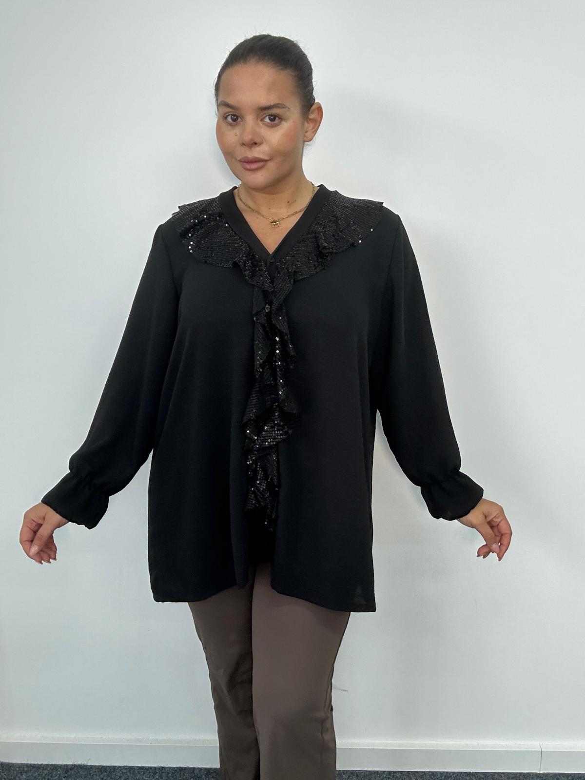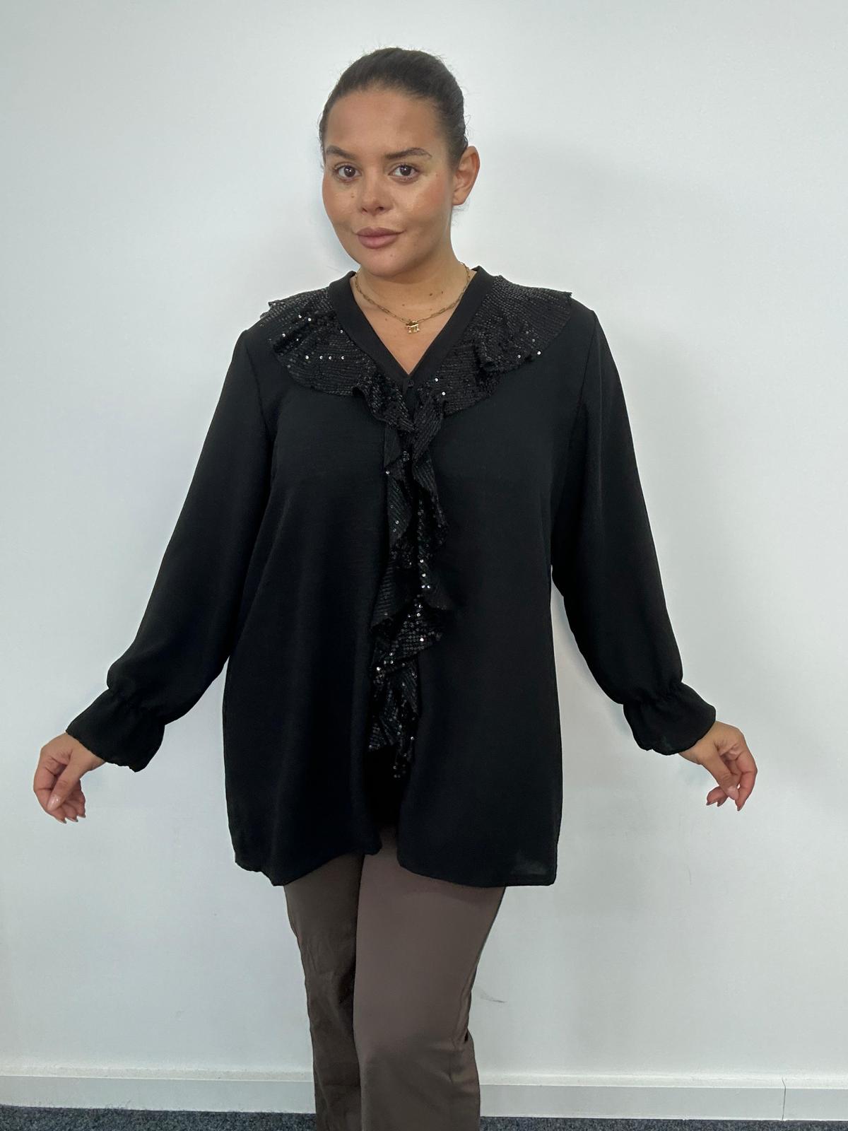 Plus Size Black Sequin Ruffle Long Sleeve Tunic Top x 2, 3 & 5 Pack Options