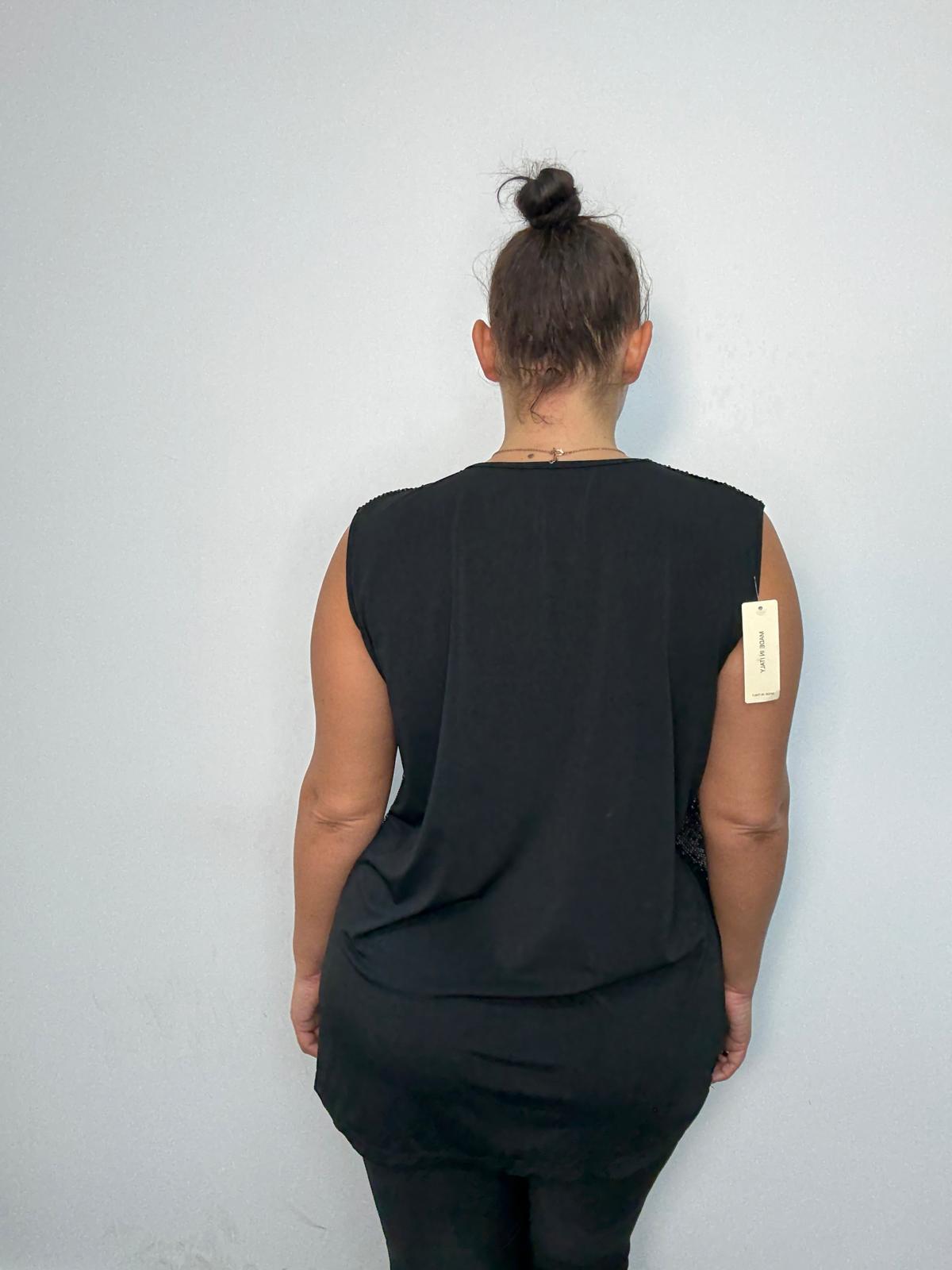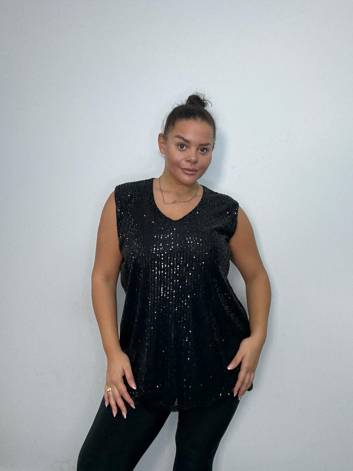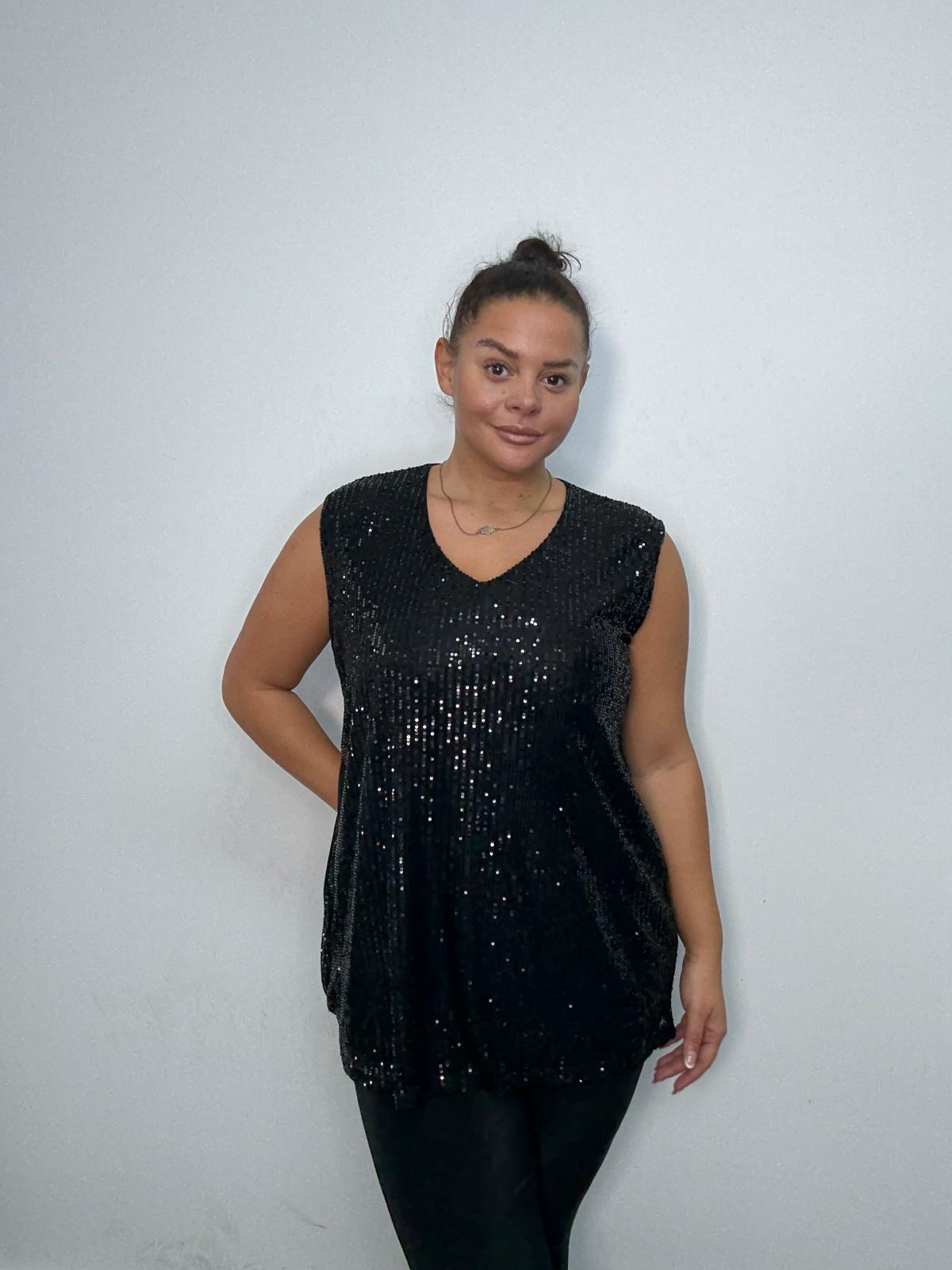 Bring effortless glamour to your partywear line with this stunning plus-size sleeveless sequin tunic top. Featuring a flattering v-neck and an elegant longline silhouette, this piece offers both sparkle and comfort. Fully embellished in shimmering sequins, it’s perfect for festive edits, evening outfits, and special occasions. Designed to drape beautifully over the body, this tunic pairs easily with leggings, trousers, or faux leather pieces, making it a must-have style for retailers looking to elevate their plus-size occasionwear offering.