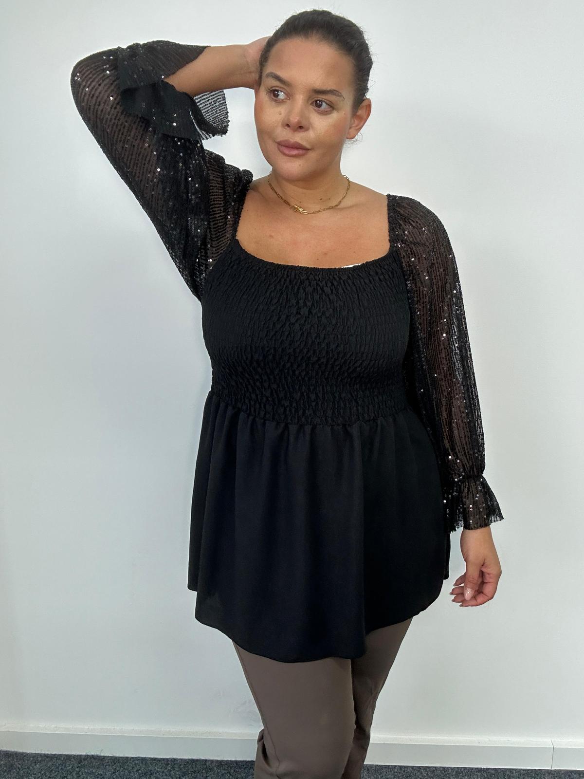 Plus Size Black Smocked Top with Sequin Balloon Sleeves x 2, 3 & 5 Pack Options