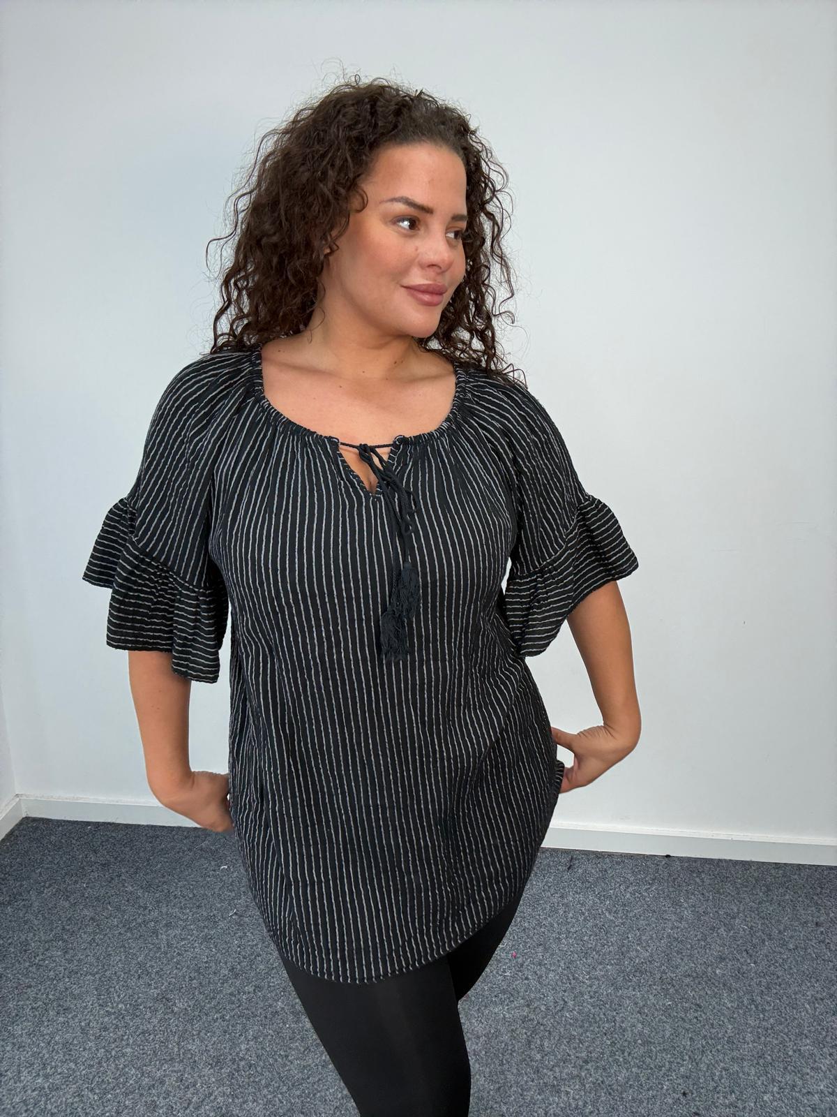 Elevate your plus size collection with this effortlessly stylish striped blouse, designed exclusively for curve customers. Featuring a flattering relaxed fit, soft textured fabric and statement flared sleeves, this top offers both comfort and on-trend appeal. The tassel tie neckline adds a subtle boho touch, making it perfect for casual daywear, holiday edits or easy weekend styling. The lightweight, breathable fabric ensures all-day comfort, while the vertical stripe detail creates a lengthening silhouette that complements fuller figures. Pair with leggings, jeans or jeggings for a versatile look your customers will love season after season. An essential wholesale addition for retailers catering to modern curve fashion.