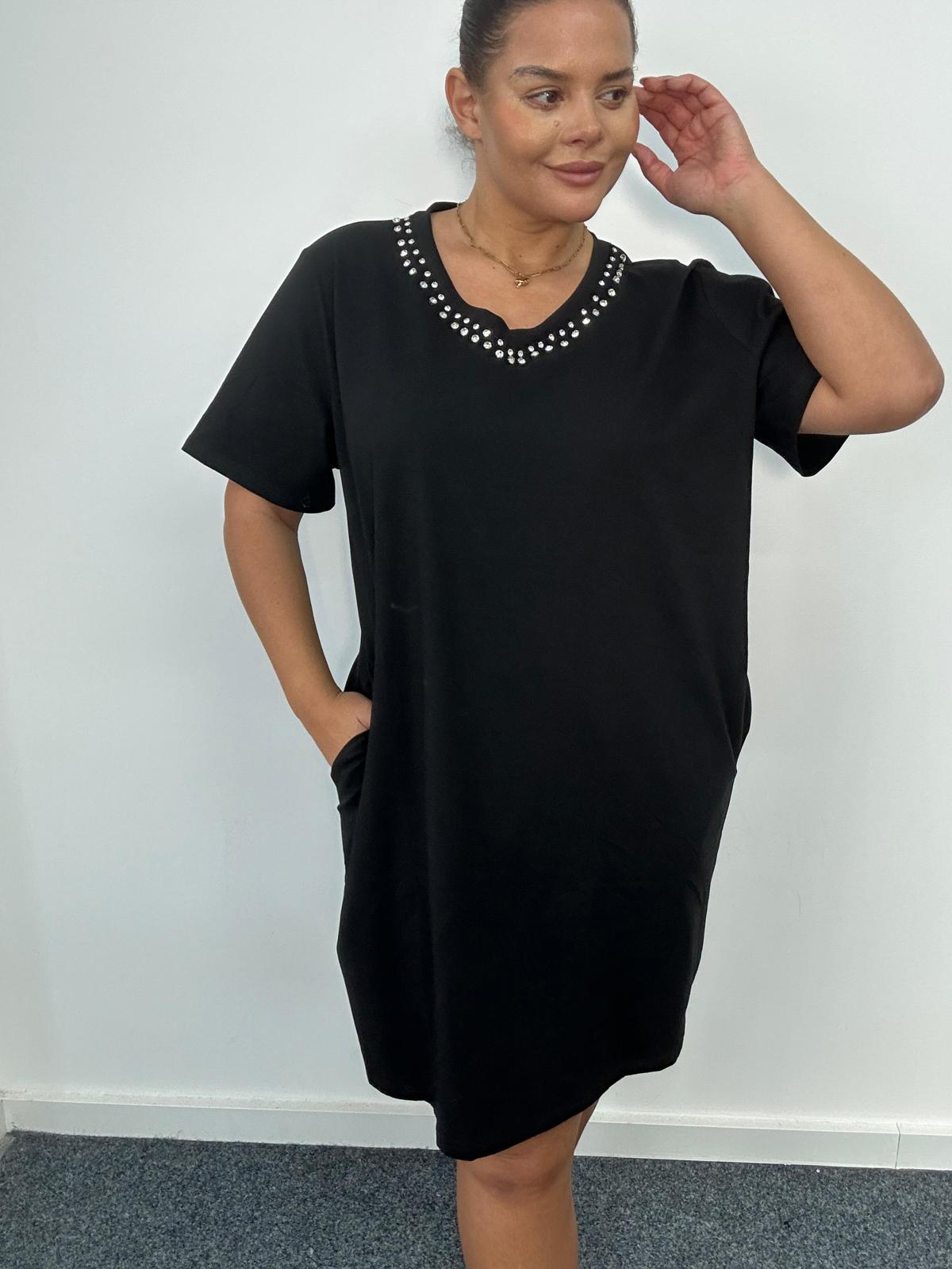 Plus Size Black Studded Neckline T-Shirt Dress with Pockets x 2, 3 & 5 Pack Options