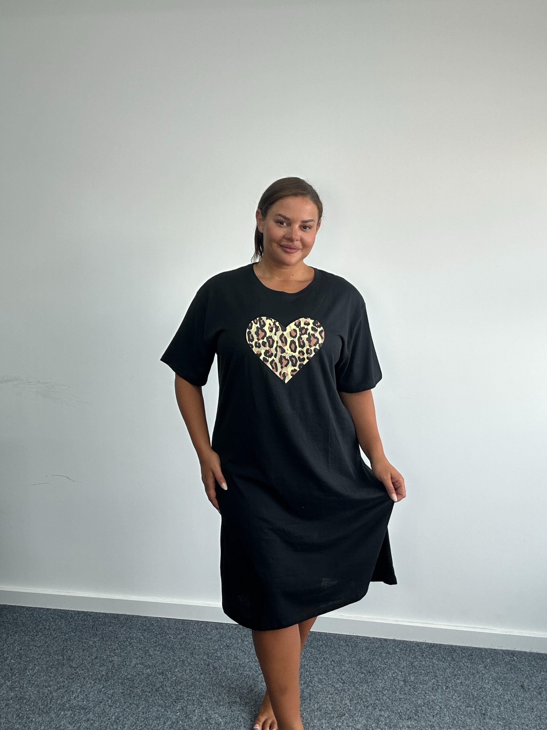 Bring cosy-chic style to your boutique sleepwear collection with this Plus Size Leopard Heart Cotton Sleep Dress. Made from a soft, breathable cotton-blend fabric, this nightdress combines comfort with a touch of trend featuring a leopard-print heart motif on the front for a fun, fashionable twist. The relaxed t-shirt silhouette and short sleeves offer easy movement and all-night comfort, making it perfect for lounging or sleeping. A must-have for plus-size customers who want stylish, comfortable sleepwear that feels as good as it looks.