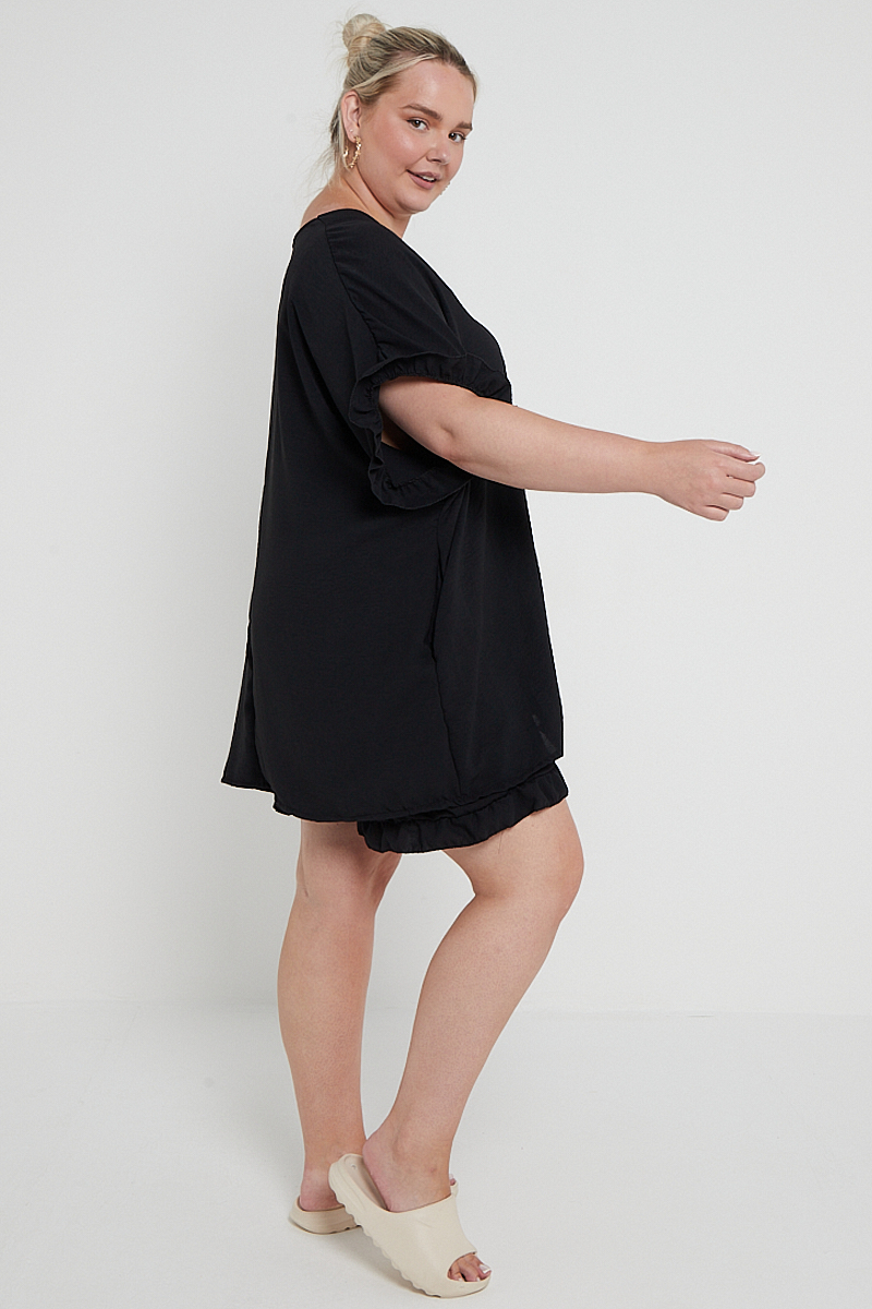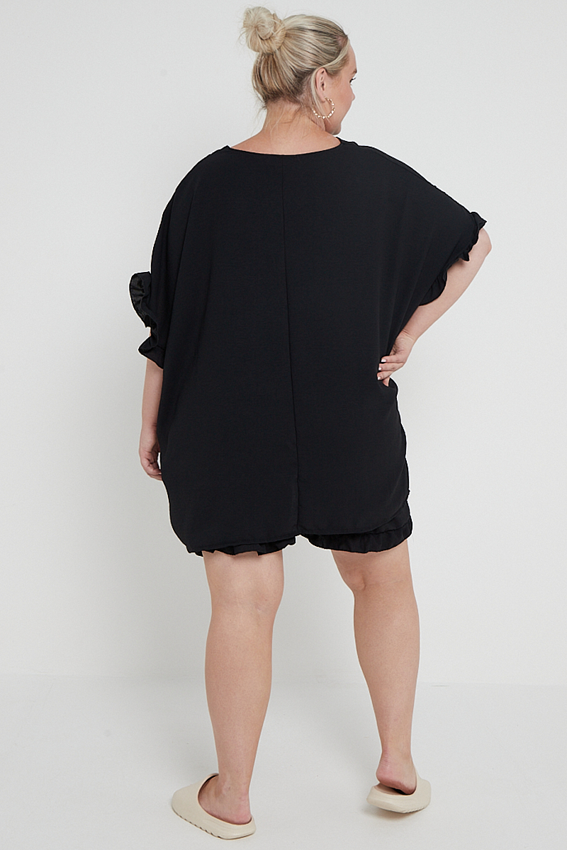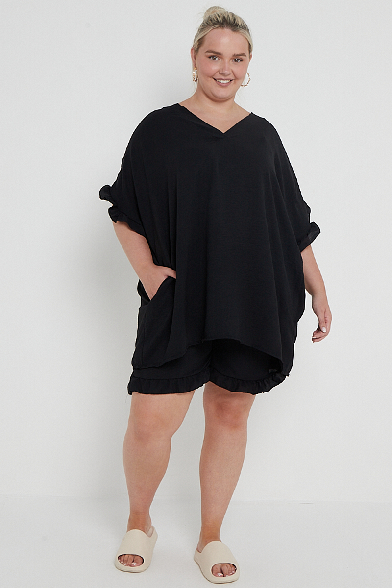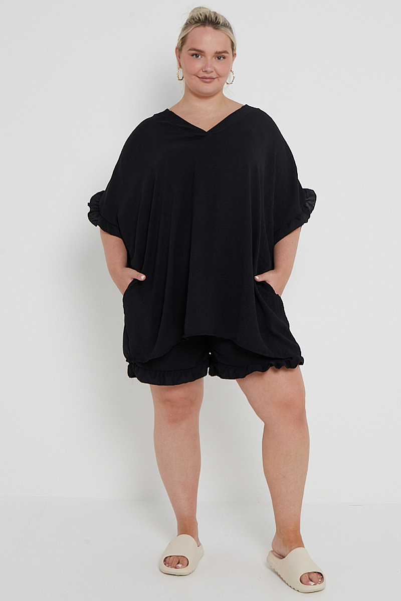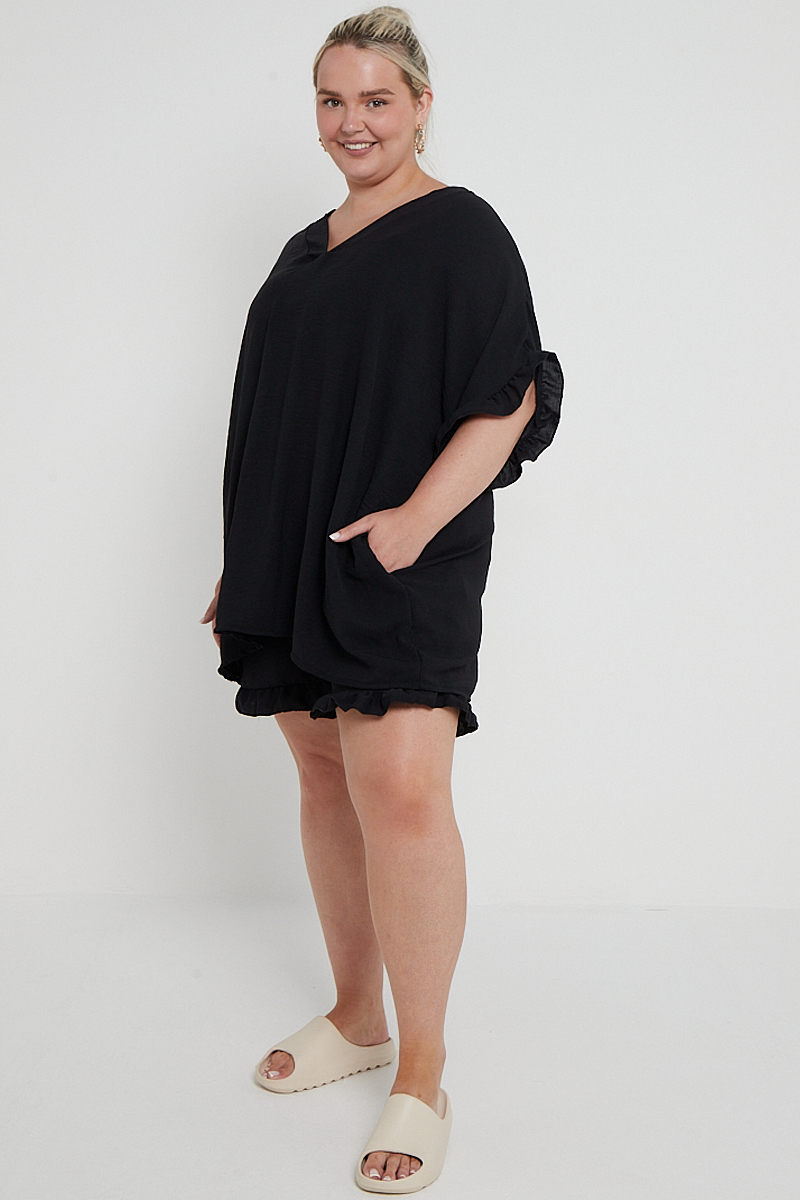 Plus Size Black Two Piece Co Ord Set Ruffle Detail Top With Pockets & Matching Shorts x 5