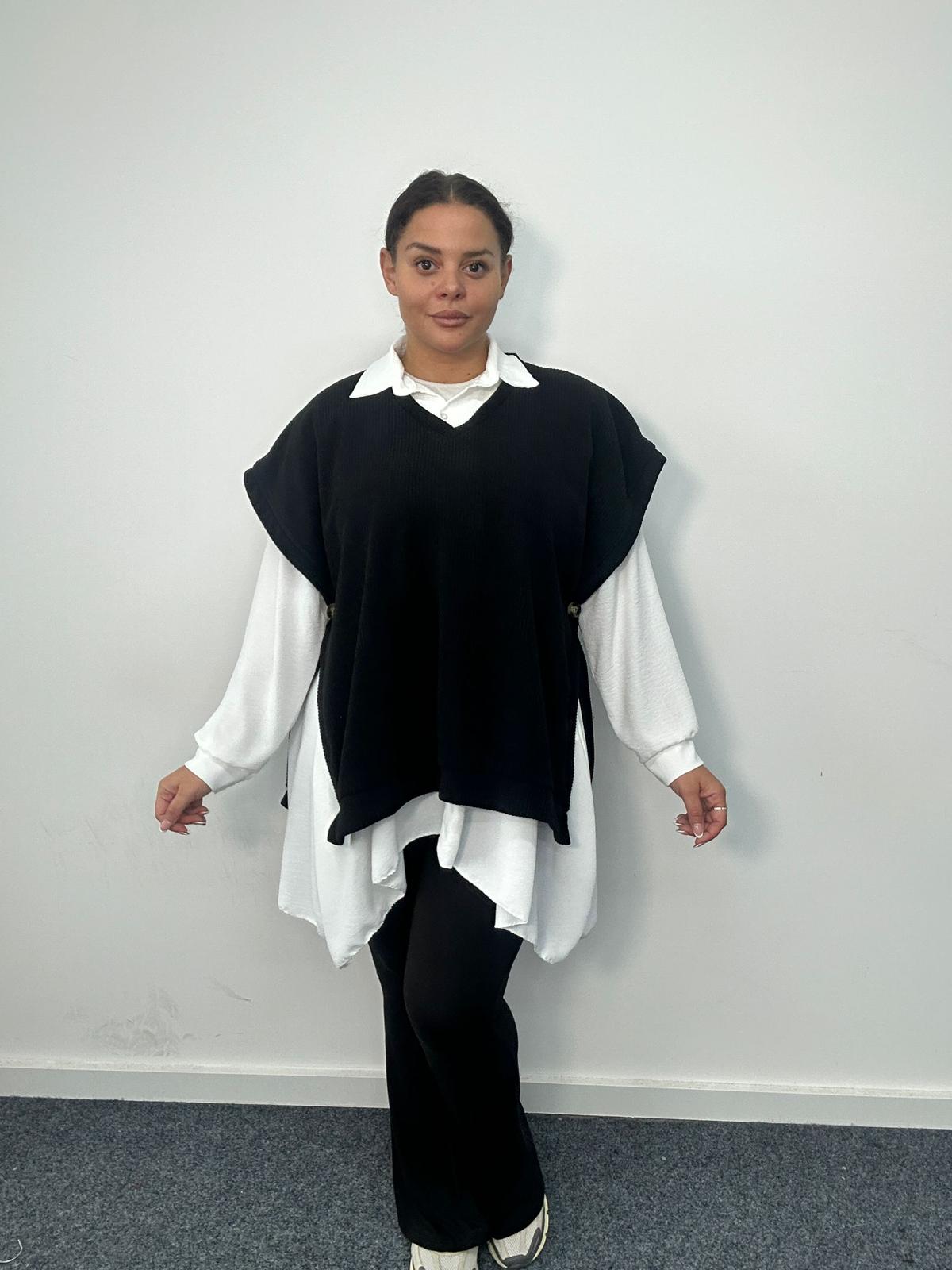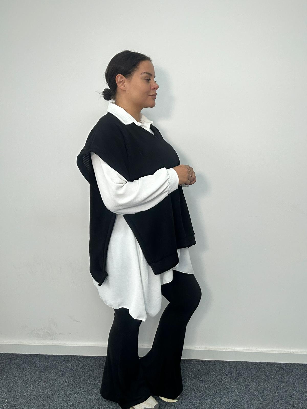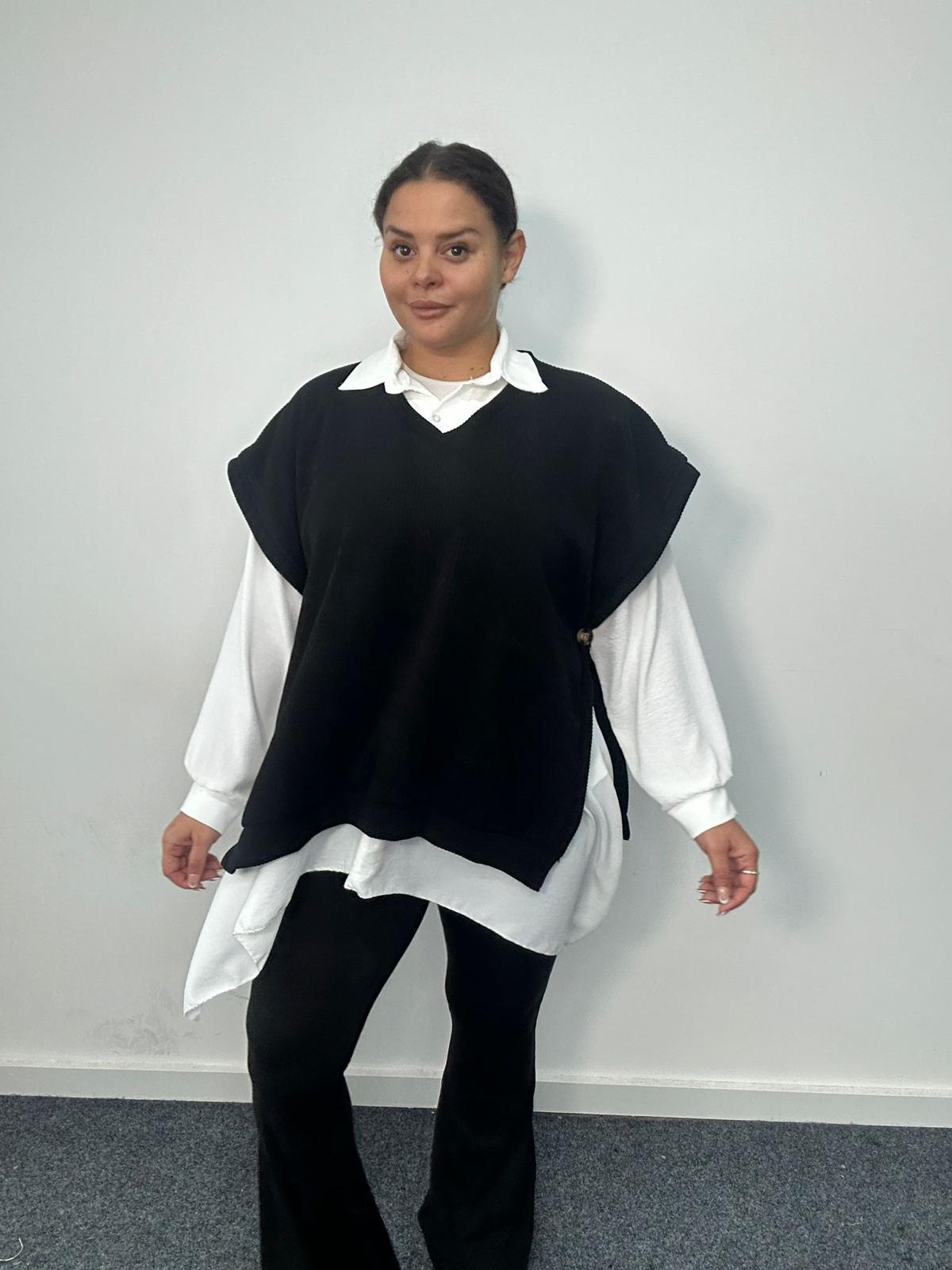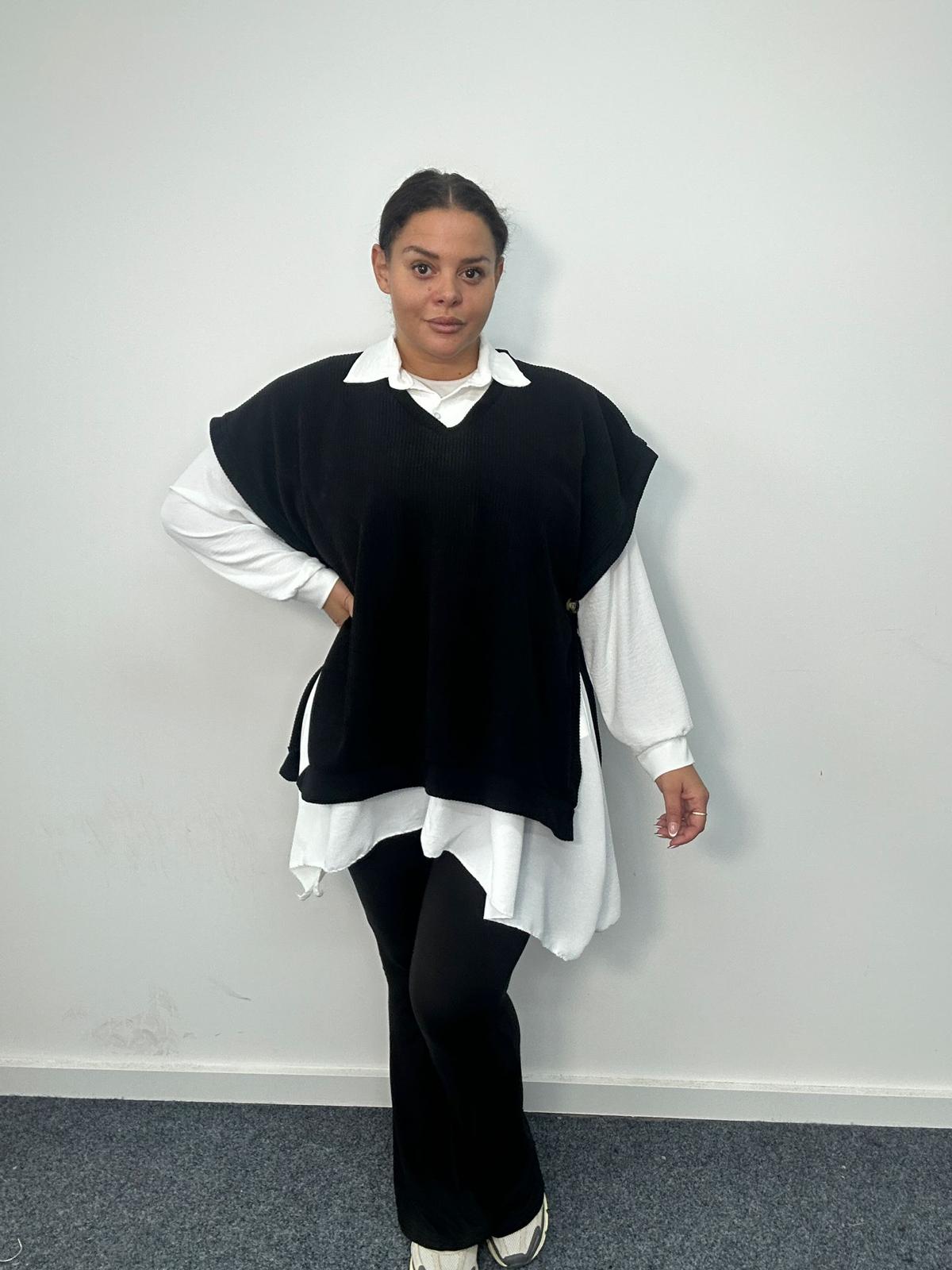 Refresh your plus-size top selection with this stylish layered-look design, combining a classic white longline shirt with a black vest overlay. This on-trend two-in-one top delivers effortless styling with zero fuss, ideal for customers who want a polished outfit with maximum comfort. The contrast between the soft knit vest and the flowy shirt hem creates a flattering silhouette that pairs beautifully with leggings, trousers, or denim. A must-have statement piece for boutiques, online retailers, and stores seeking versatile, fashion-forward plus-size tops.