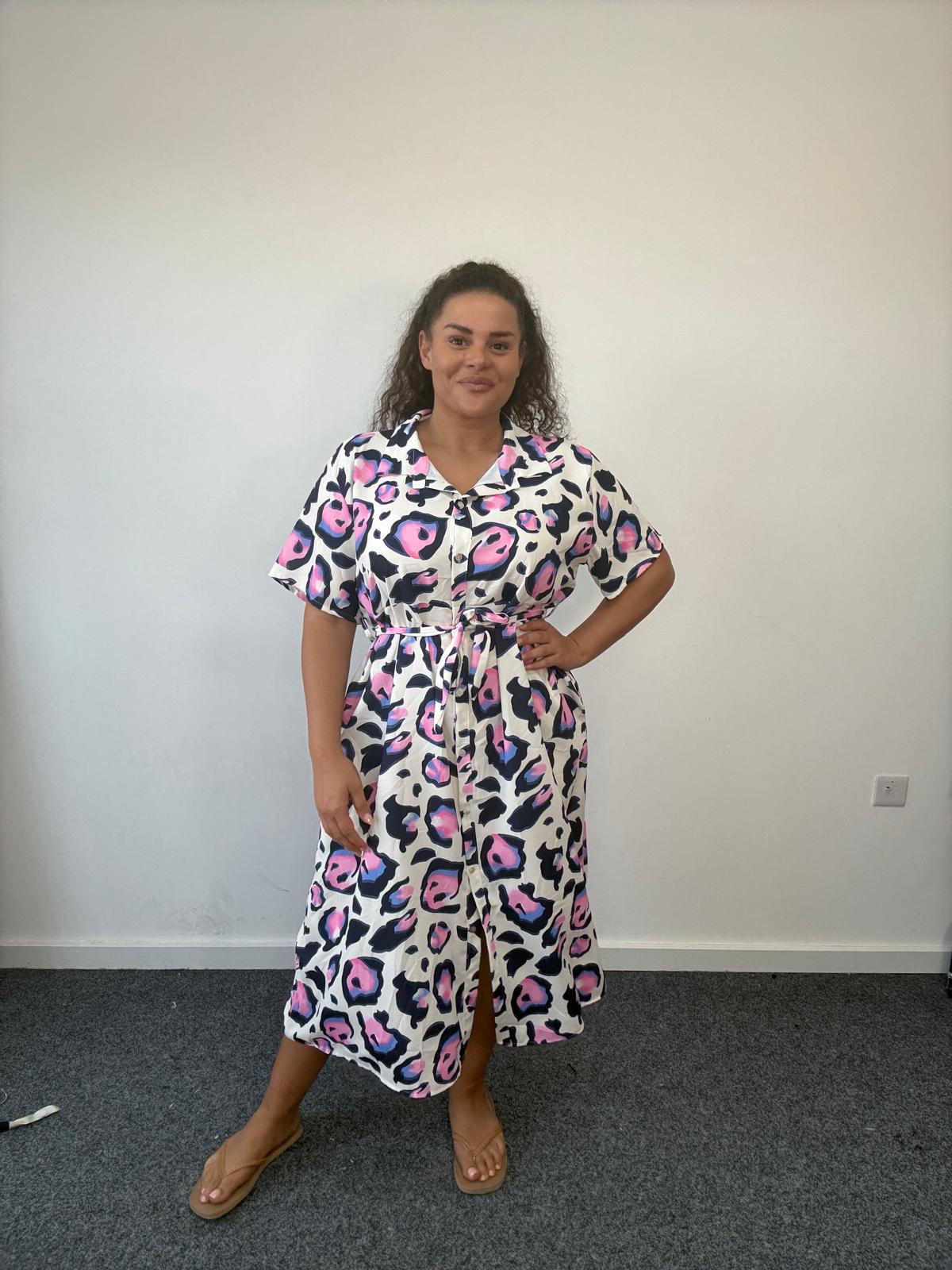 Plus Size Blue Abstract Animal Print Shirt Dress with Tie Waist x 2, 3 & 5 Pack Options