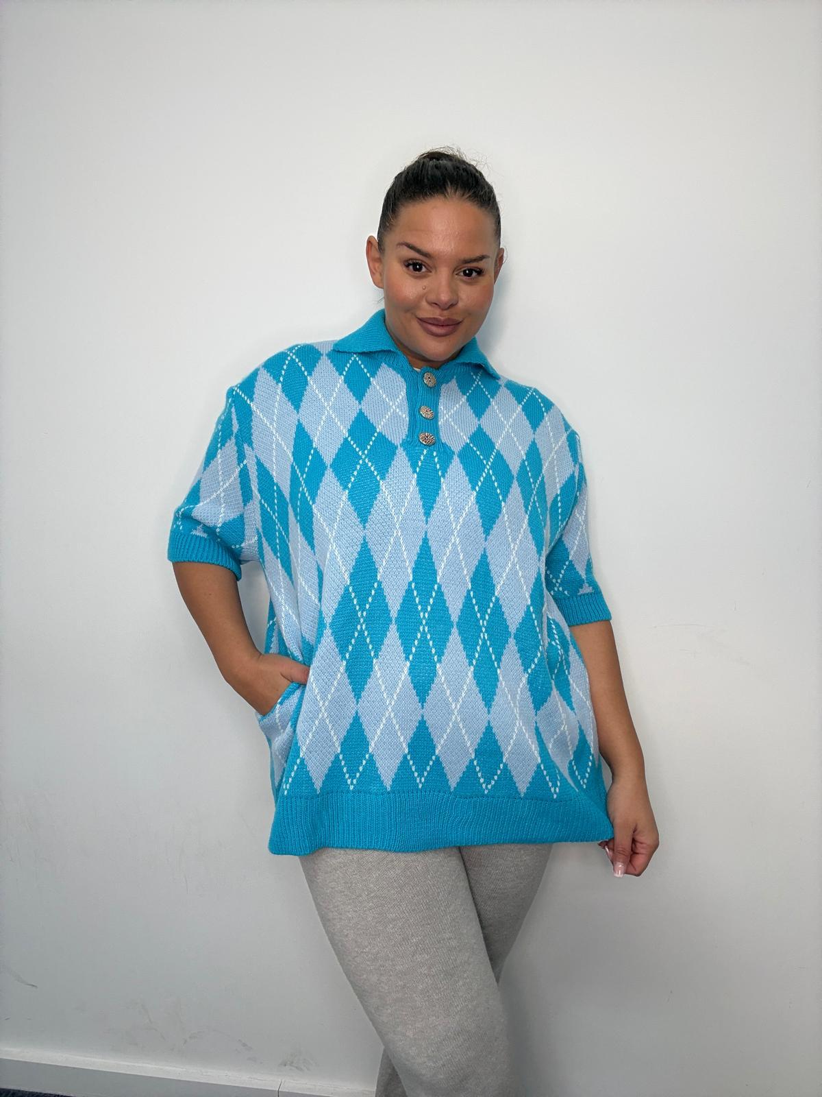 Plus Size Blue Argyle Collared Knitted Top x 2, 3 & 5 Pack Options