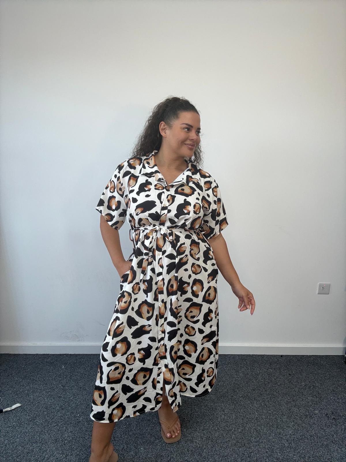 Plus Size Brown Abstract Animal Print Shirt Dress with Tie Waist x 2, 3 & 5 Pack Options