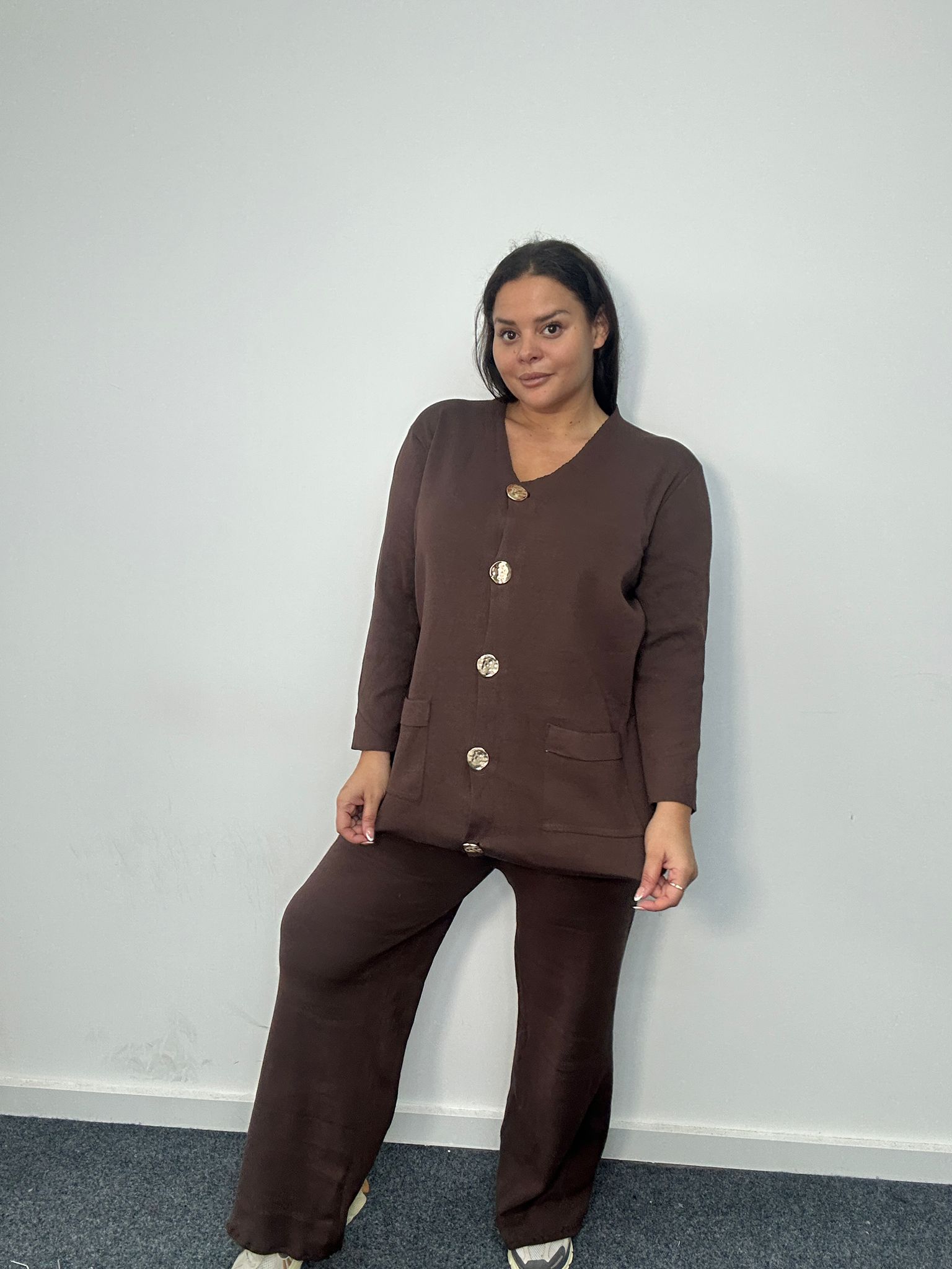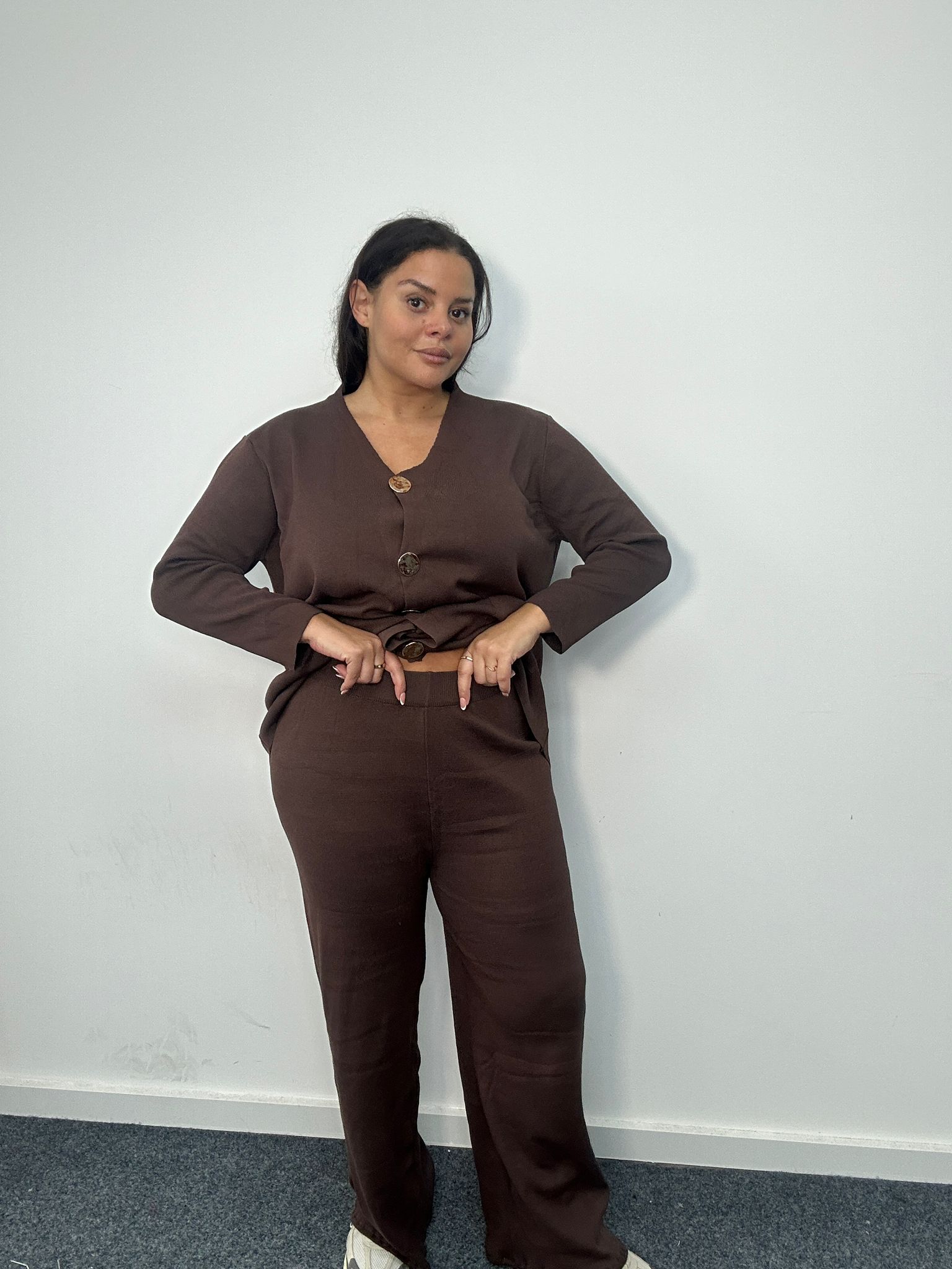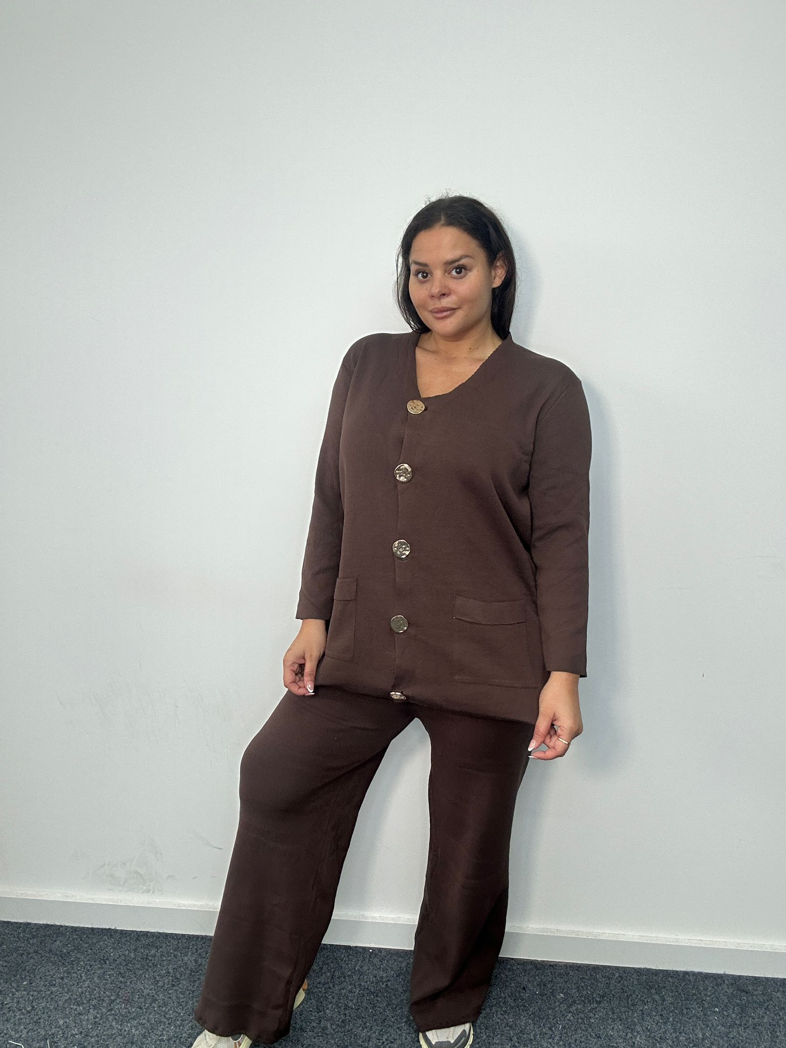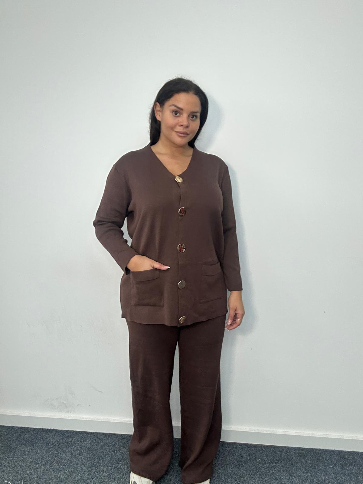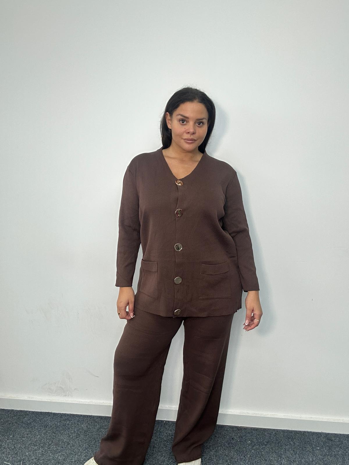 Upgrade your loungewear offering with this chic and comfortable two-piece set, designed for effortless everyday wear. Crafted from a soft, lightweight fabric, this set includes a relaxed long-sleeve top with oversized buttons and matching wide-leg trousers for a coordinated, modern look. Ideal for boutiques, online retailers, and lifestyle stores looking to expand their plus-size casualwear range.