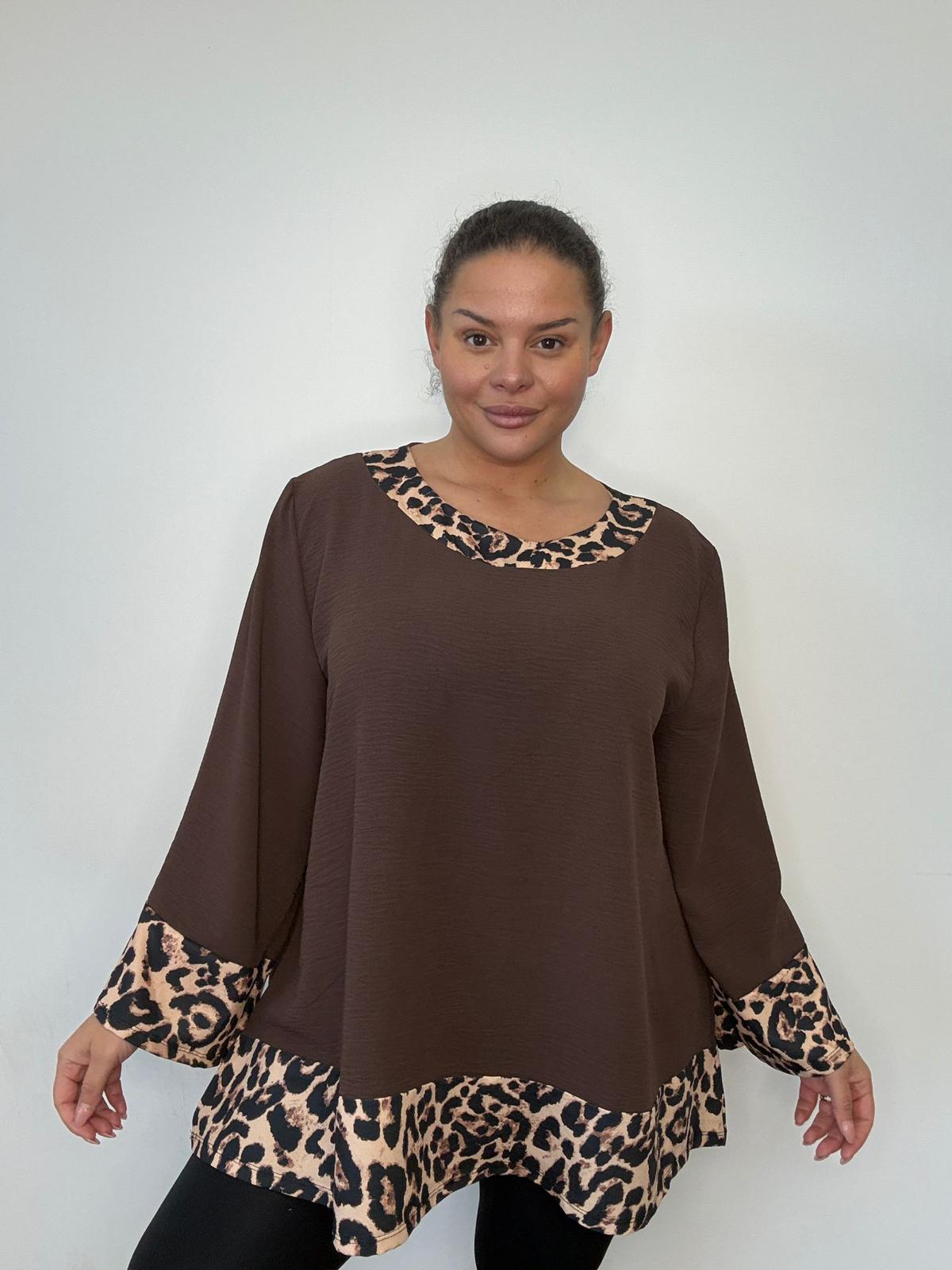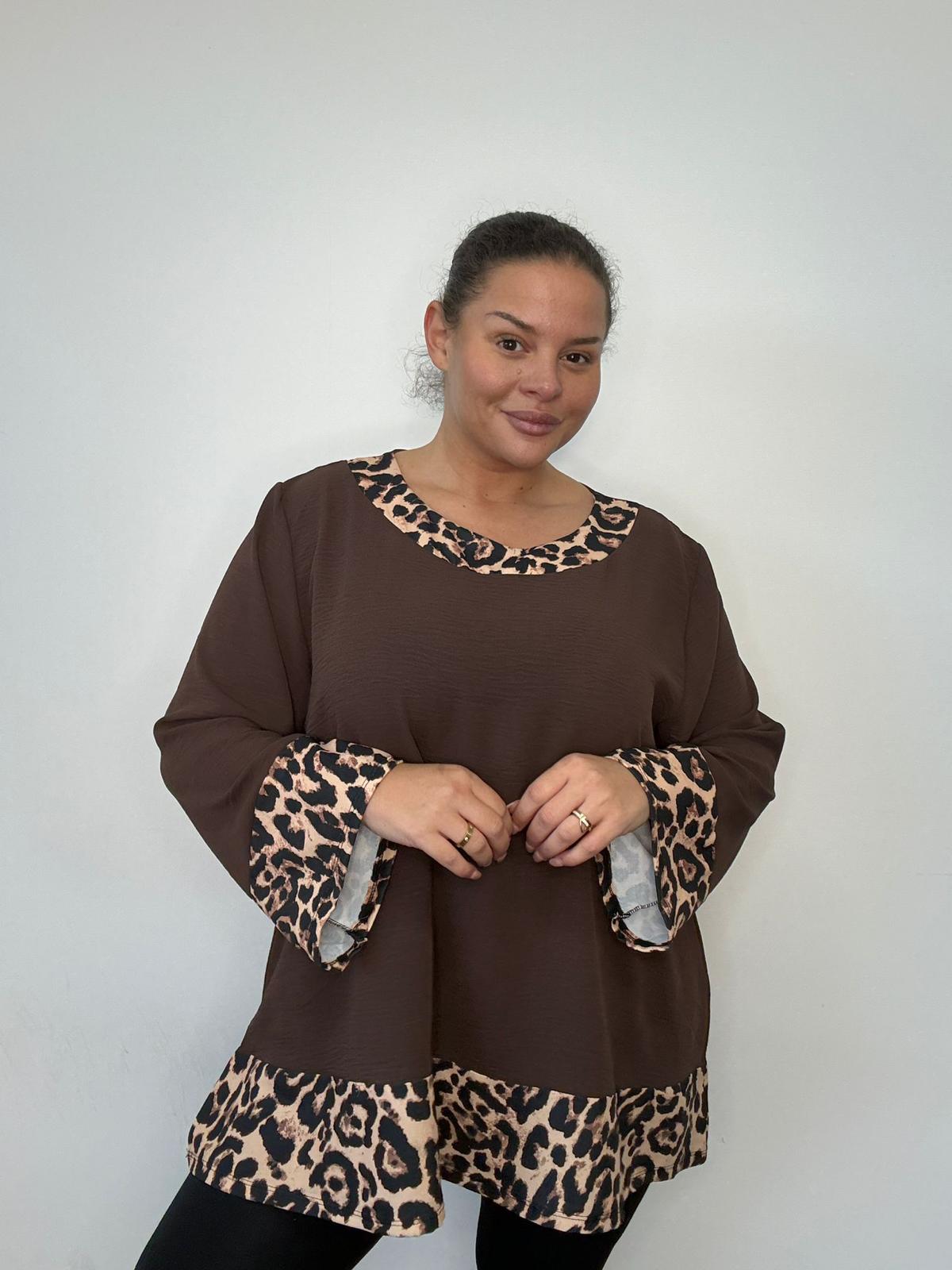 Plus Size Brown Leopard Trim Long Sleeve Swing Top x 2, 3 & 5 Pack Options