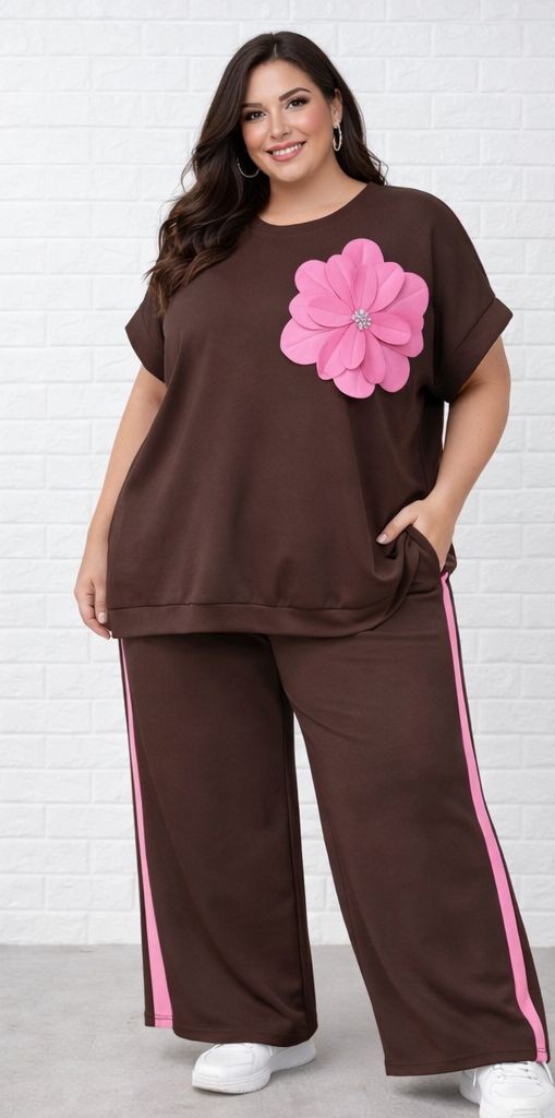 Plus Size Brown Lounge Co-Ord Set with 3D Flower Detail x 2, 3 & 5 Pack Options