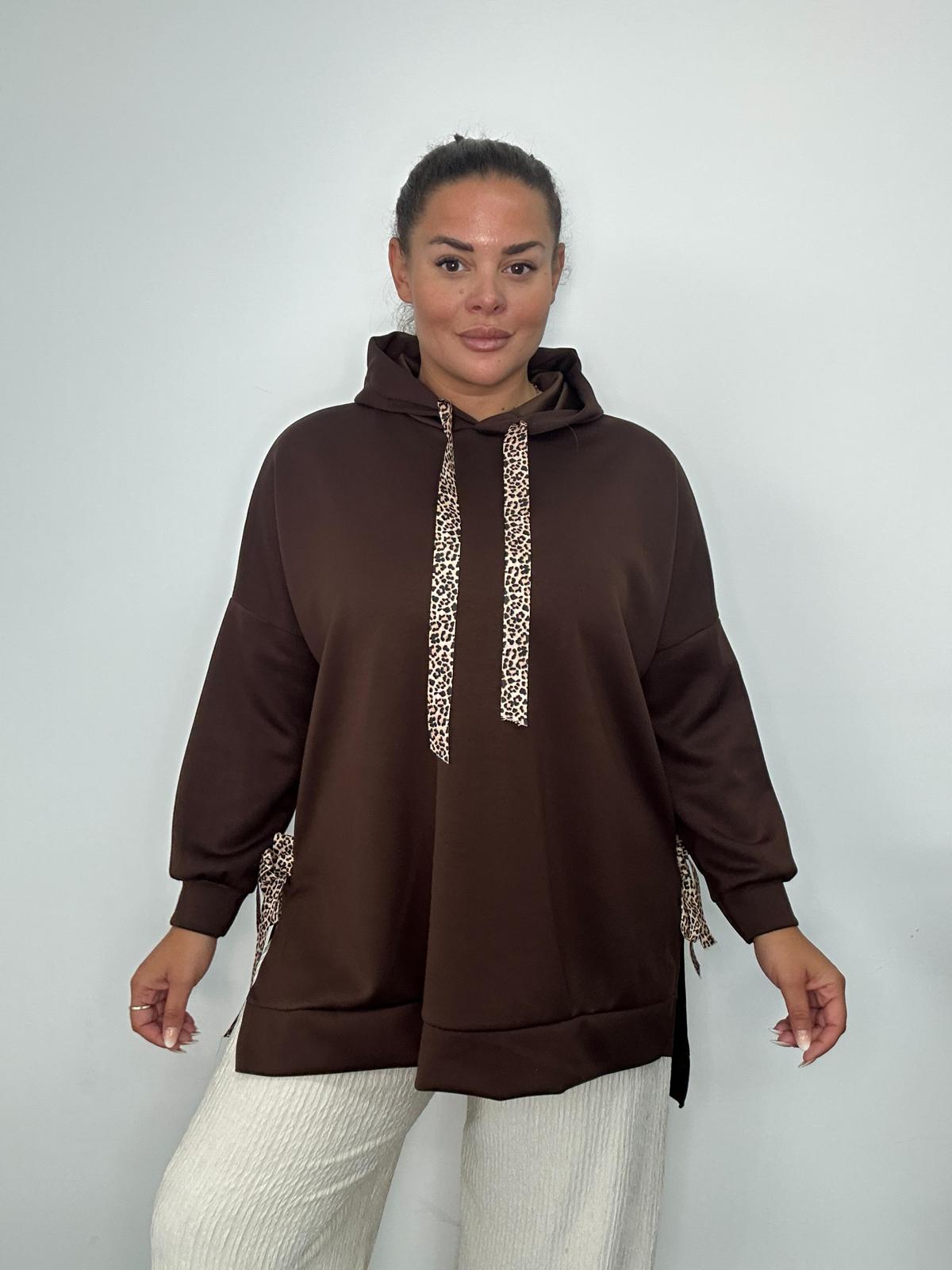 Plus Size Brown Oversized Hoodie with Leopard Print Ties Curve Casualwear x 2, 3 & 5 Pack Options