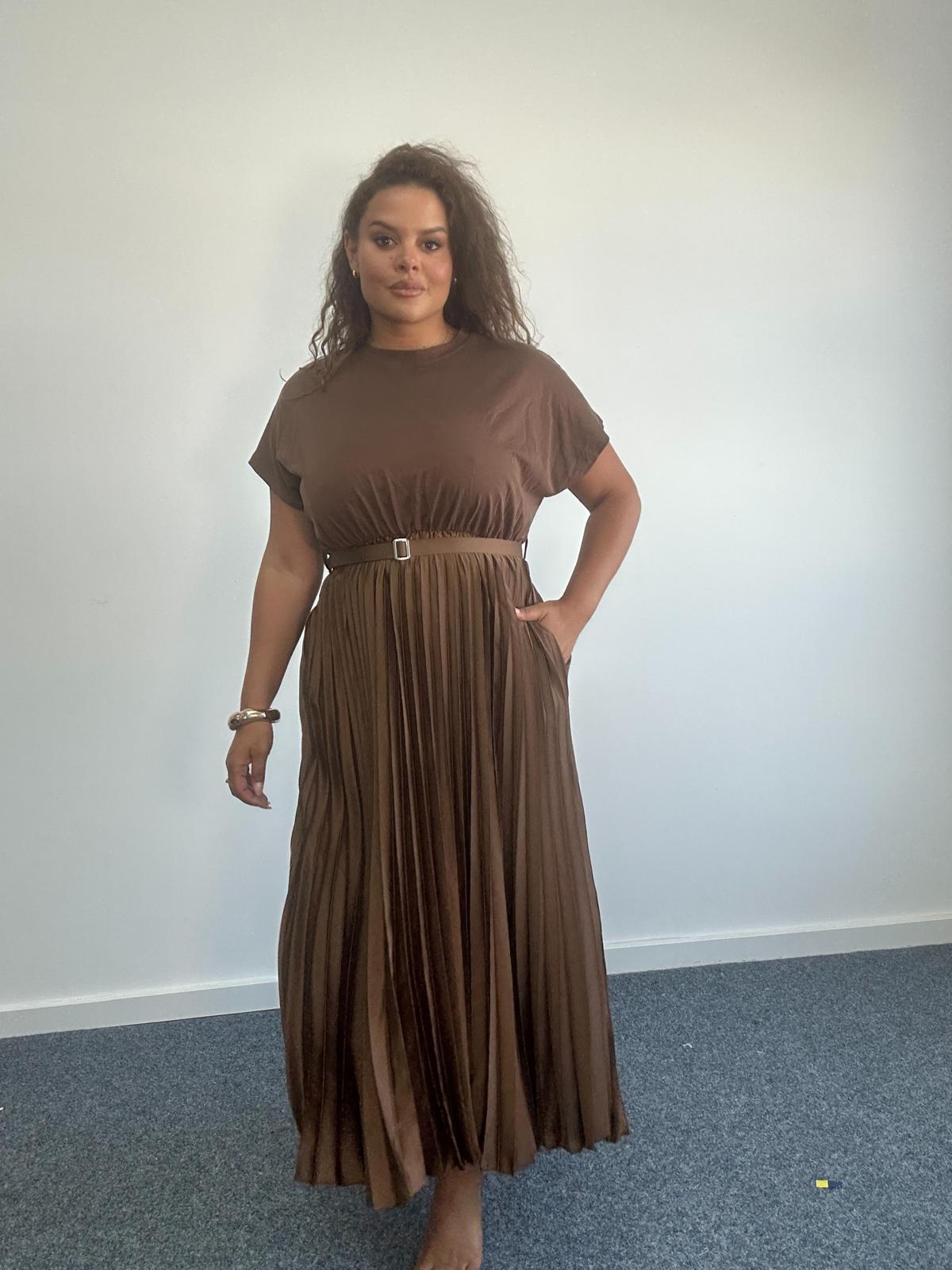Inject sophisticated movementinto your plus size collection with this stunning Pleated Belted Midi Dress. This dress features a soft jersey-style bodice with a high neckline, gently draped short sleeves, and a sharply pleated satin-look skirt that flows beautifully with every step. A matching belt cinches the waist to accentuate curves, creating a silhouette that’s both refined and comfortable. Finished with hidden pockets for practical elegance, it’s ideal for eventwear, brunches, or transitional day-to-night styling.
