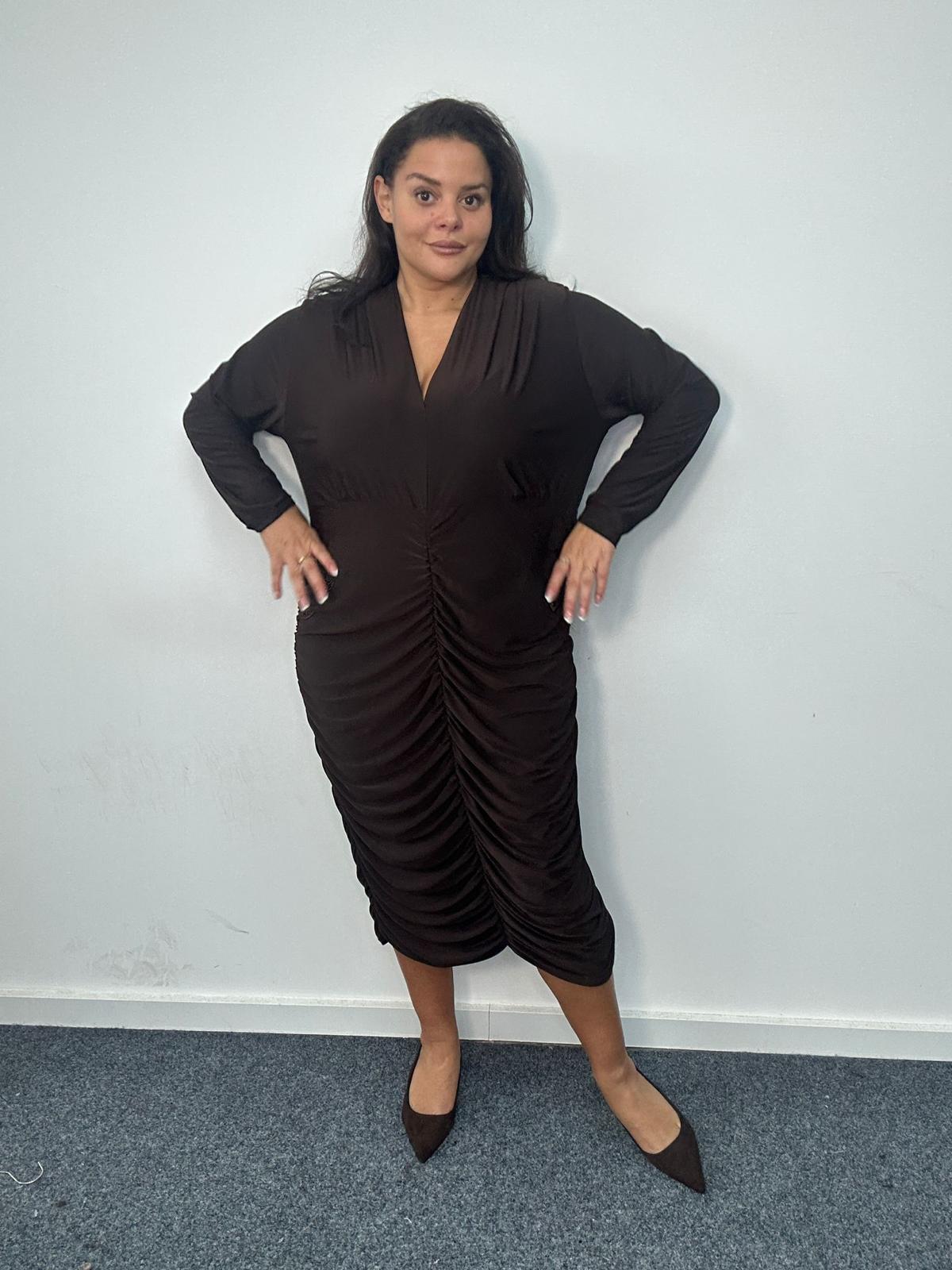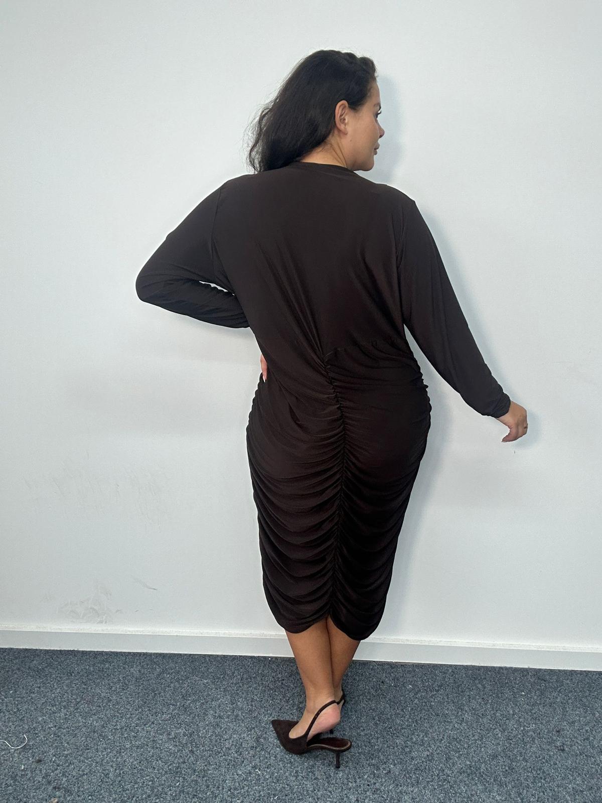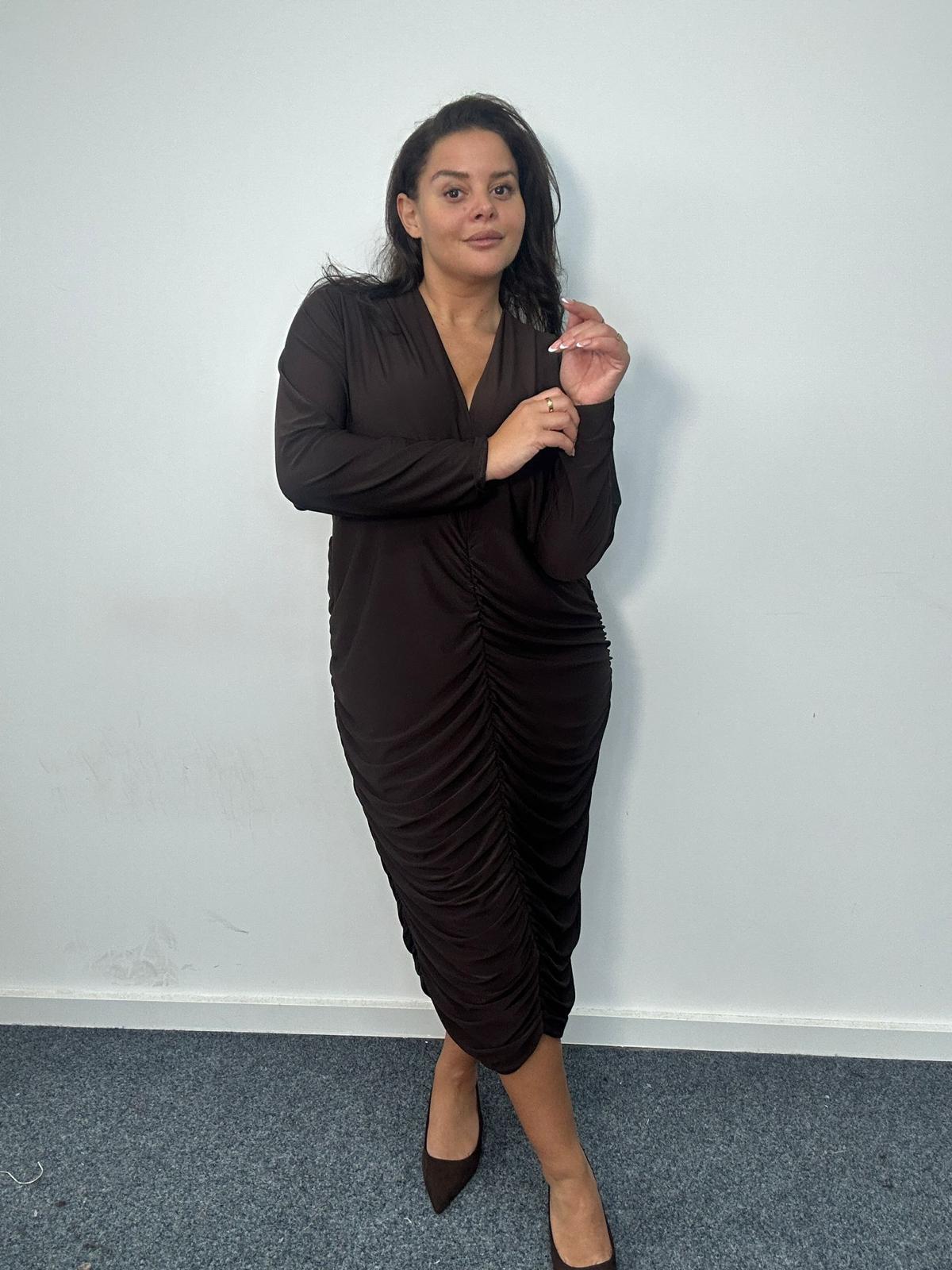 Elevate your partywear range with this stunning ruched midi dress, designed to flatter and celebrate every curve. Featuring a deep v-neck, long sleeves, and a beautifully gathered front and back seam, this dress creates a sculpted, elegant silhouette without compromising on comfort. The stretchy, soft-touch fabric provides ease of movement, making it ideal for parties, evening events, or special occasions. A standout, high-demand style for boutiques and online retailers looking to expand their plus-size eveningwear collections.