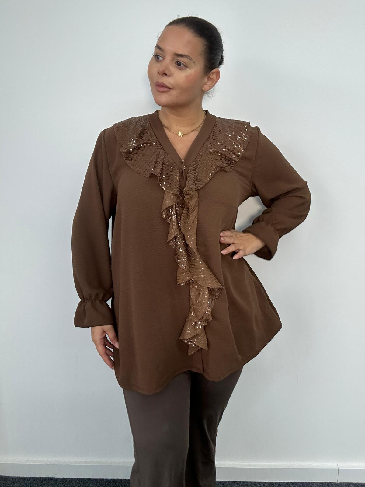 Make a bold statement with this Plus Size Sequin Ruffle Long Sleeve Blouse, a perfect blend of elegance and confidence. Designed with a shimmering sequin ruffle trim, this blouse offers an eye-catching look that flatters every curve. The relaxed, flowy silhouette ensures comfort, while the long sleeves with gathered cuffs add a touch of sophistication. Ideal for boutiques and online retailers looking to offer standout, occasion-ready pieces that celebrate plus-size femininity and style.