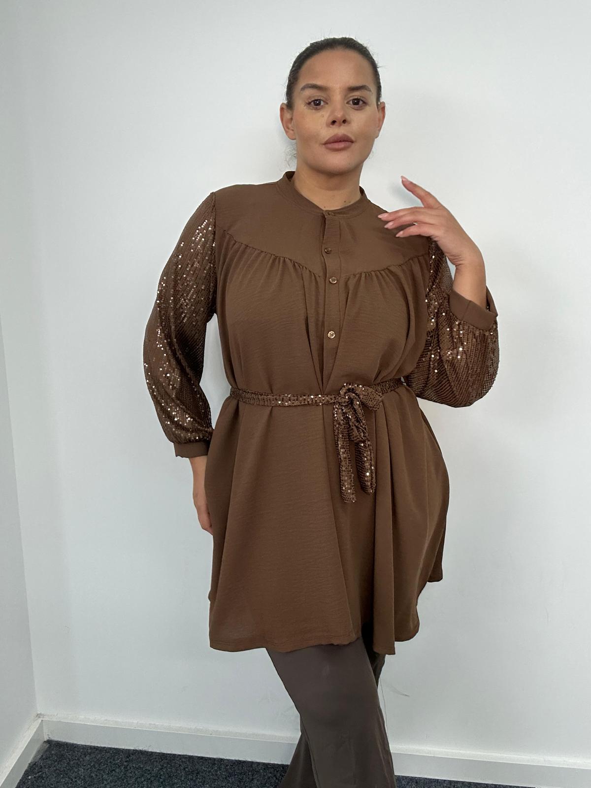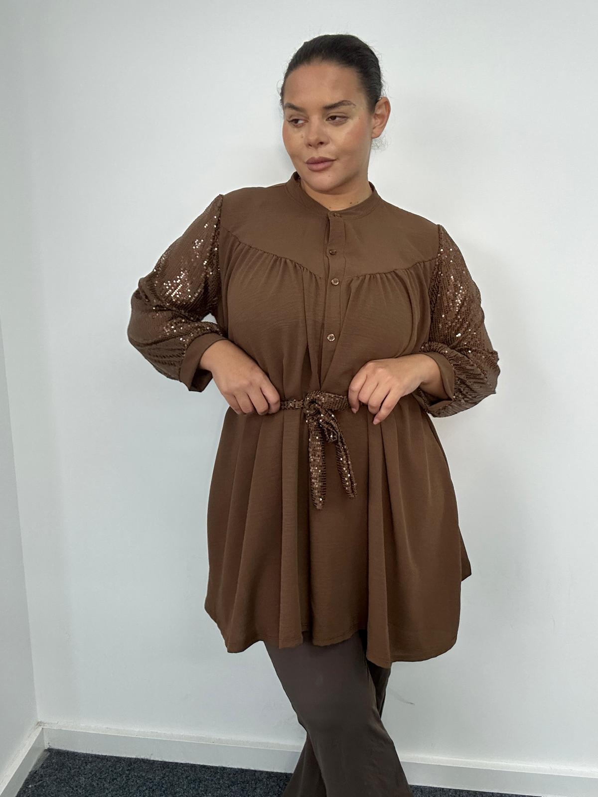 Plus Size Brown Sequin Sleeve Tunic Top with Tie Waist x 2, 3 & 5 Pack Options