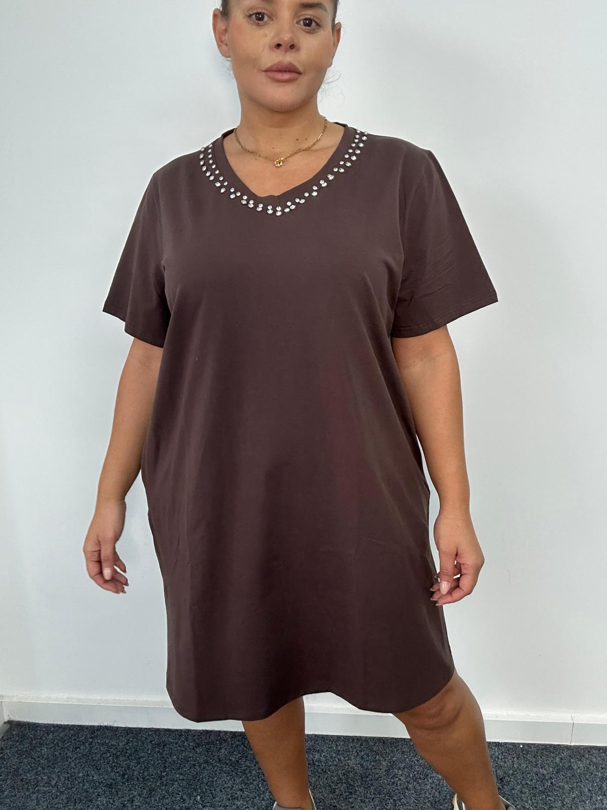 Plus Size Brown Studded Neckline T-Shirt Dress with Pockets x 2, 3 & 5 Pack Options