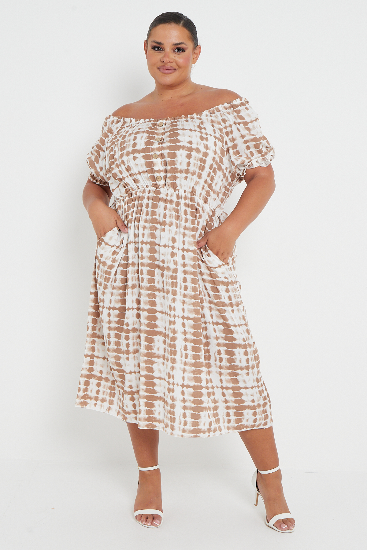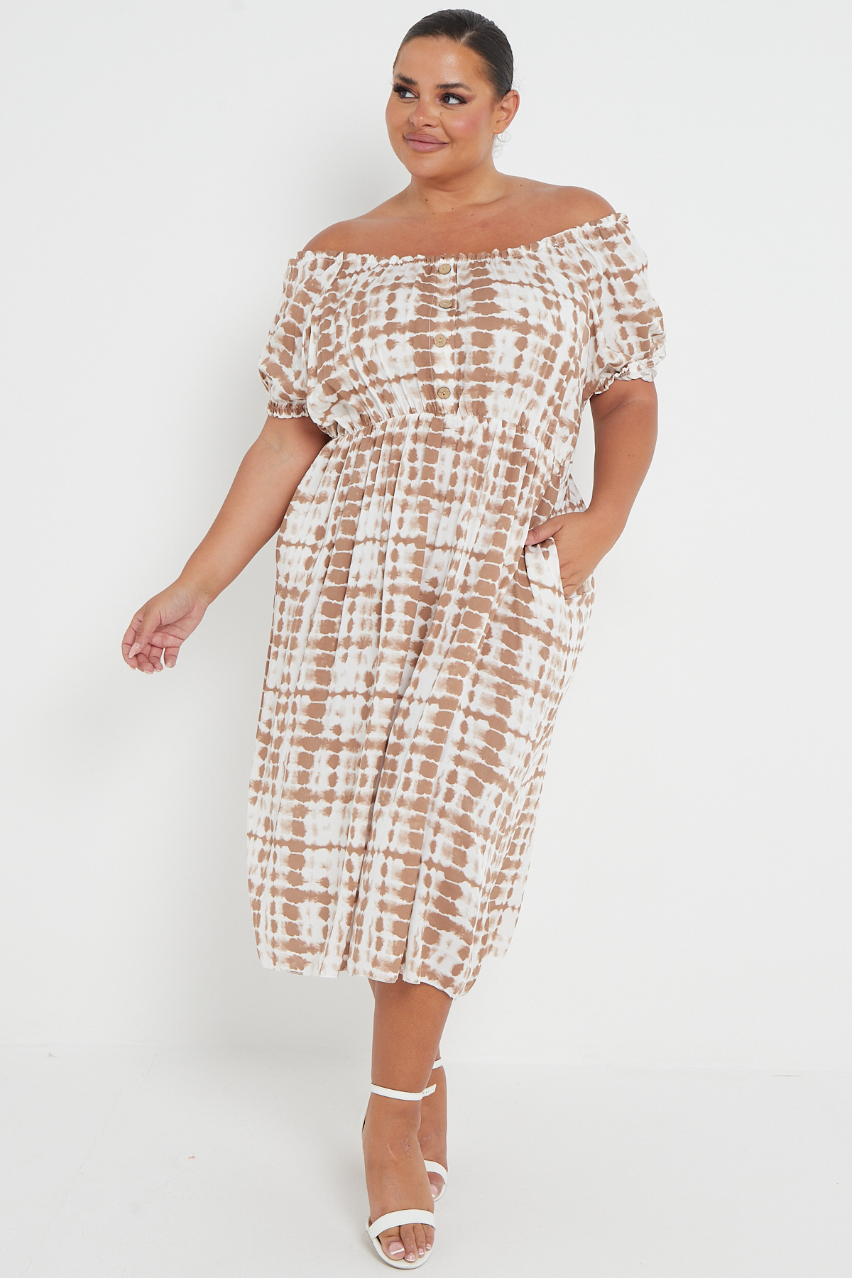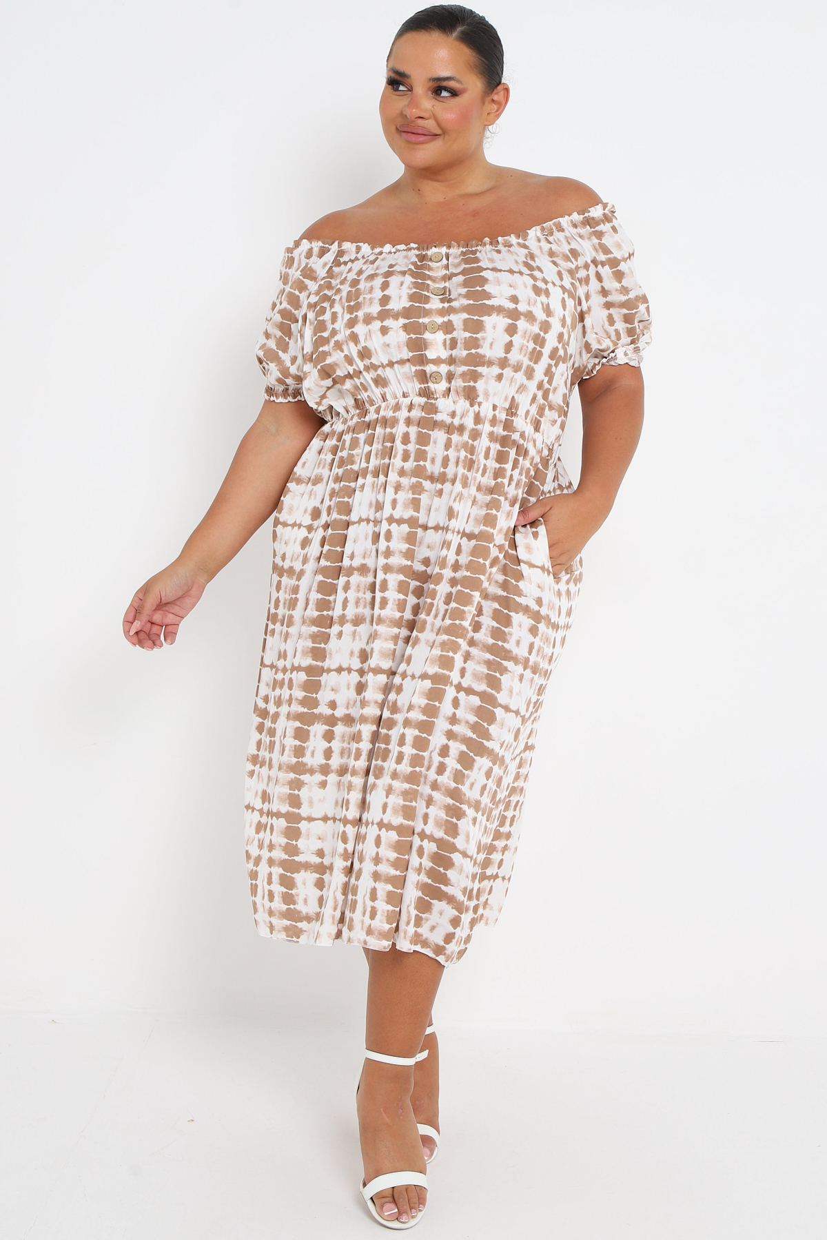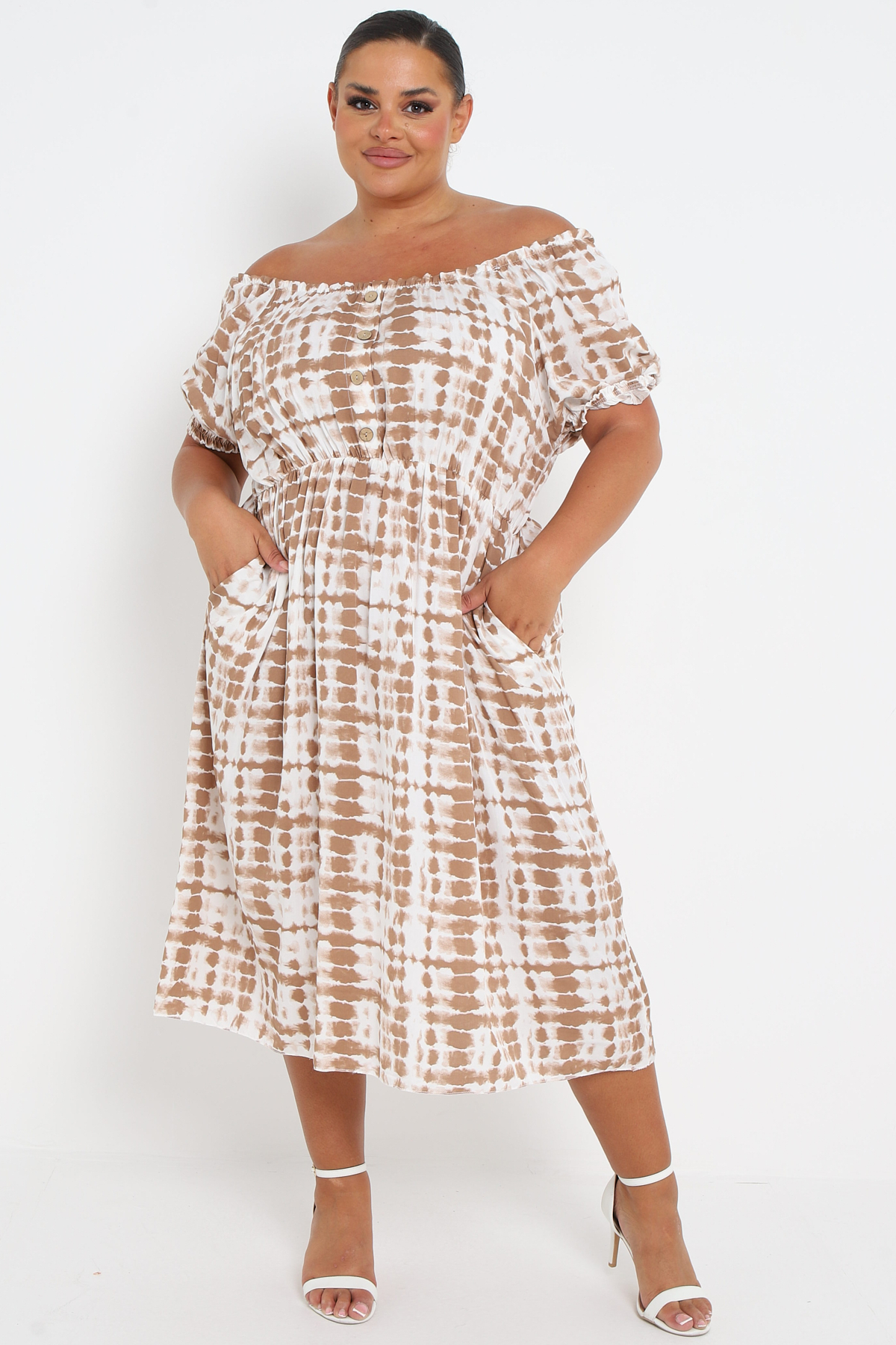 Plus Size Brown Tie Dye Bardot Button Through Dress With Pockets x 5