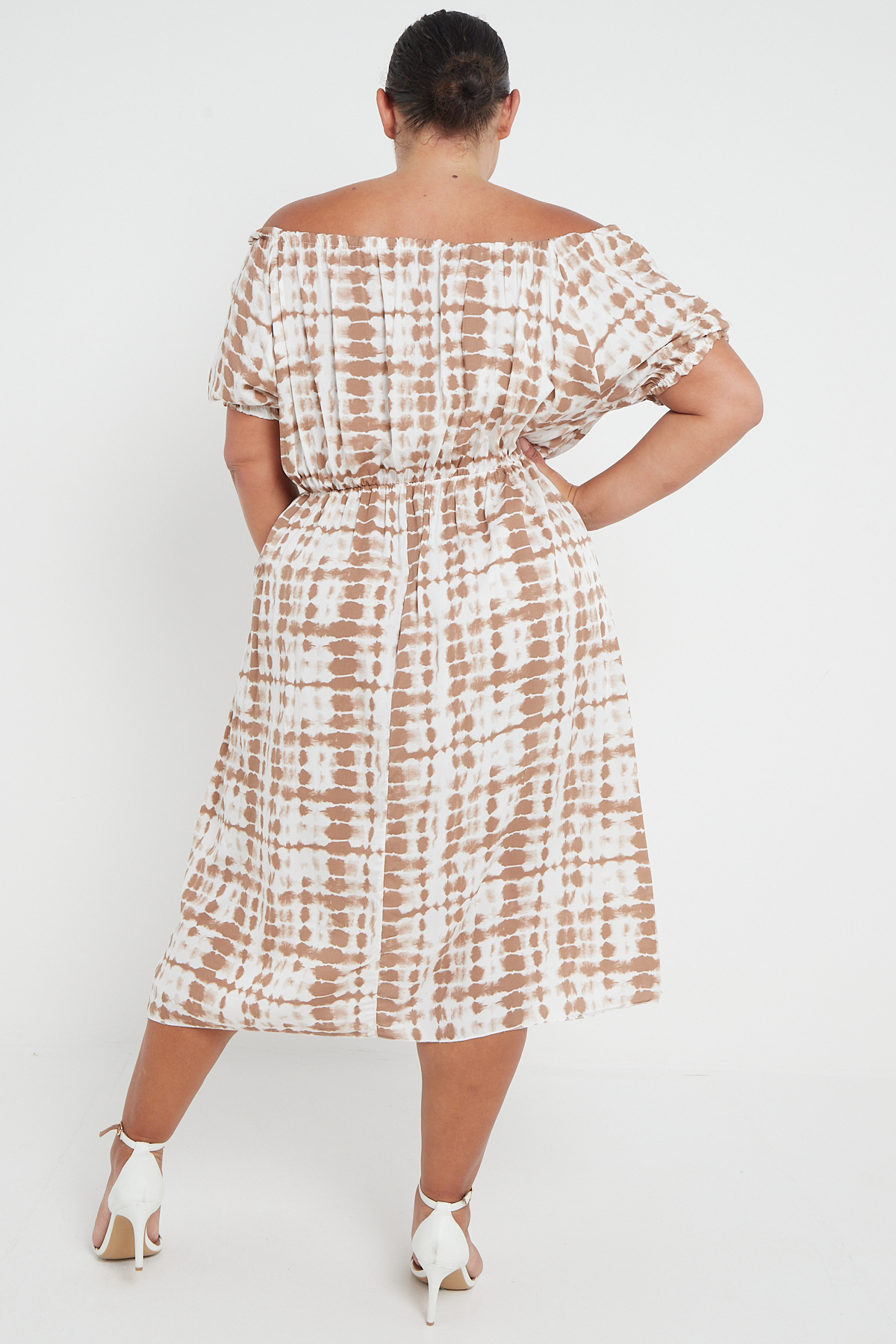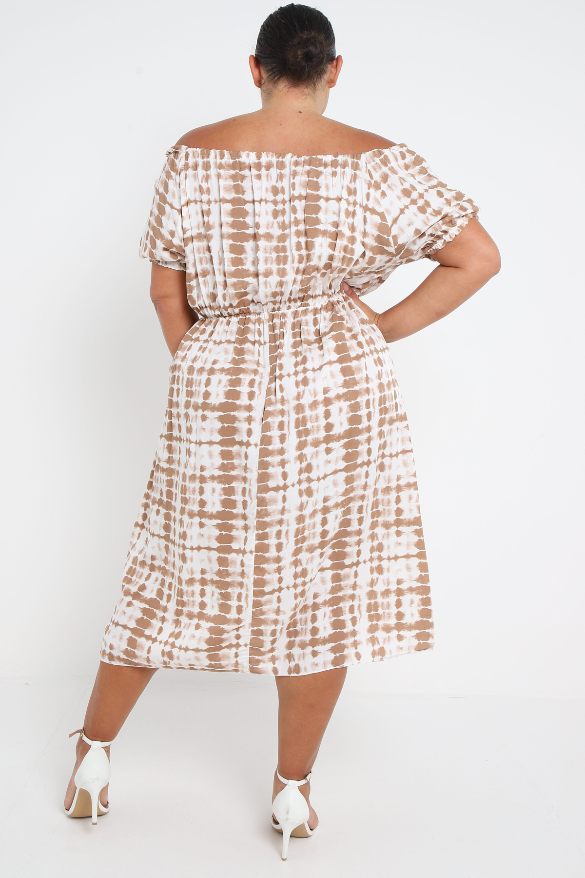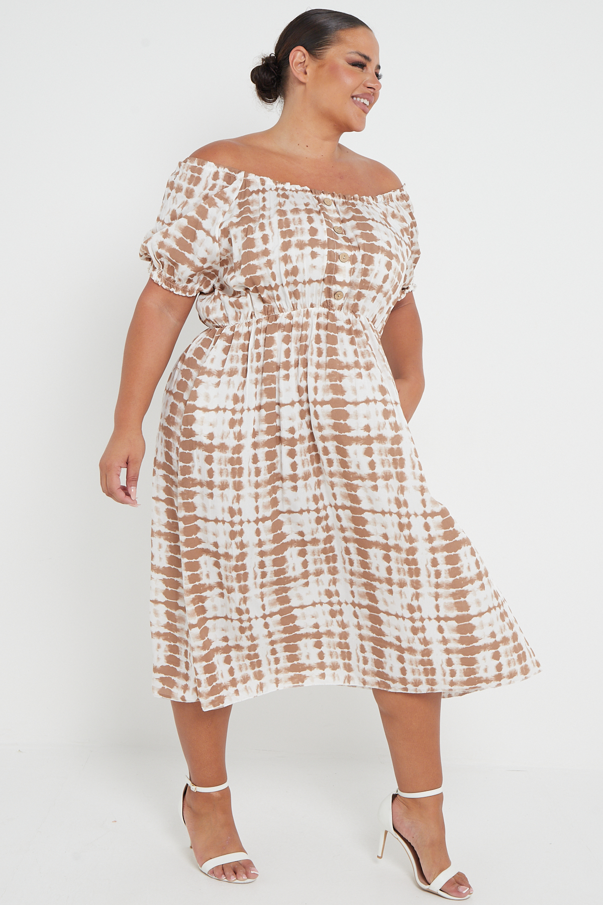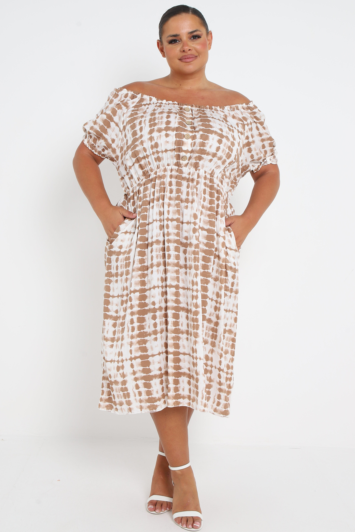 Plus Size Brown Tie Dye Bardot Button Through Dress With Pockets x 5