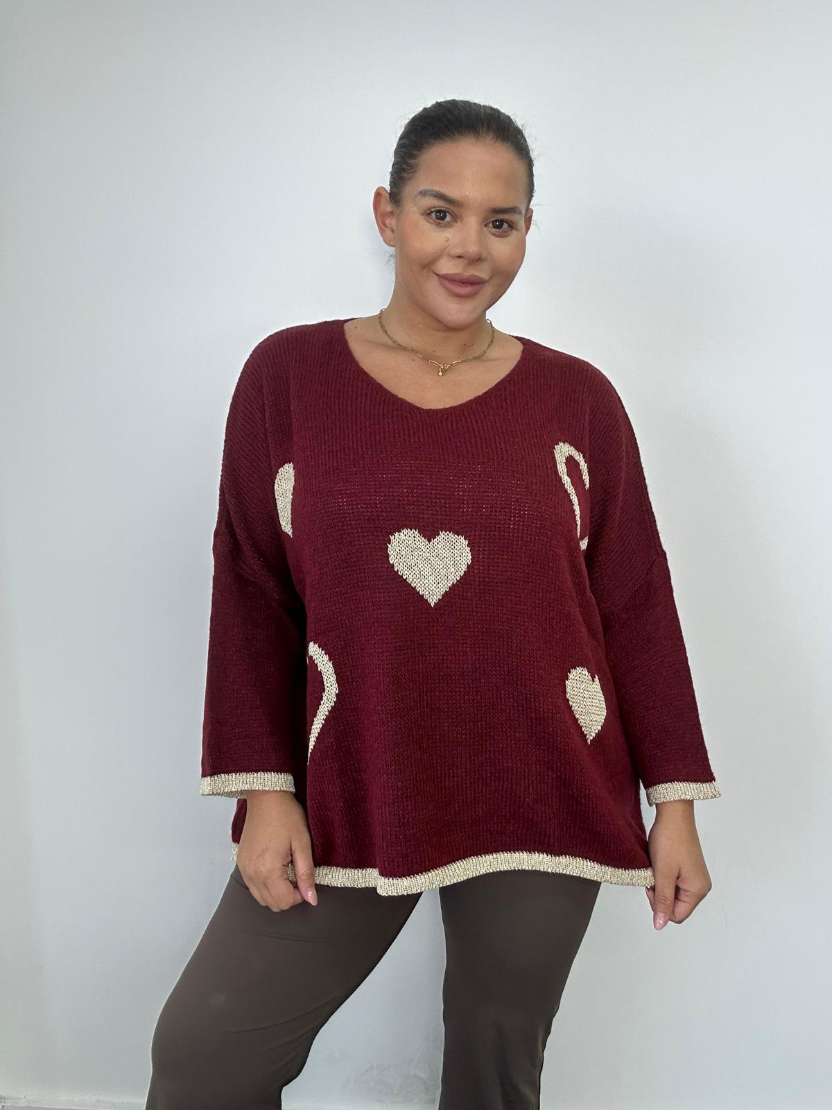 Stock up your boutique’s knitwear collection with this Plus Size Metallic Heart Knit Sweater a fun, feminine, and cosy statement piece your customers will love. Made from a soft, lightweight knit fabric, it features metallic gold heart motifs and shimmer-trimmed cuffs and hem for a touch of sparkle. With a relaxed, oversized silhouette and comfortable v-neck, this sweater offers effortless style that flatters every curve. Perfect for casual days, Valentine’s collections, or festive displays.
