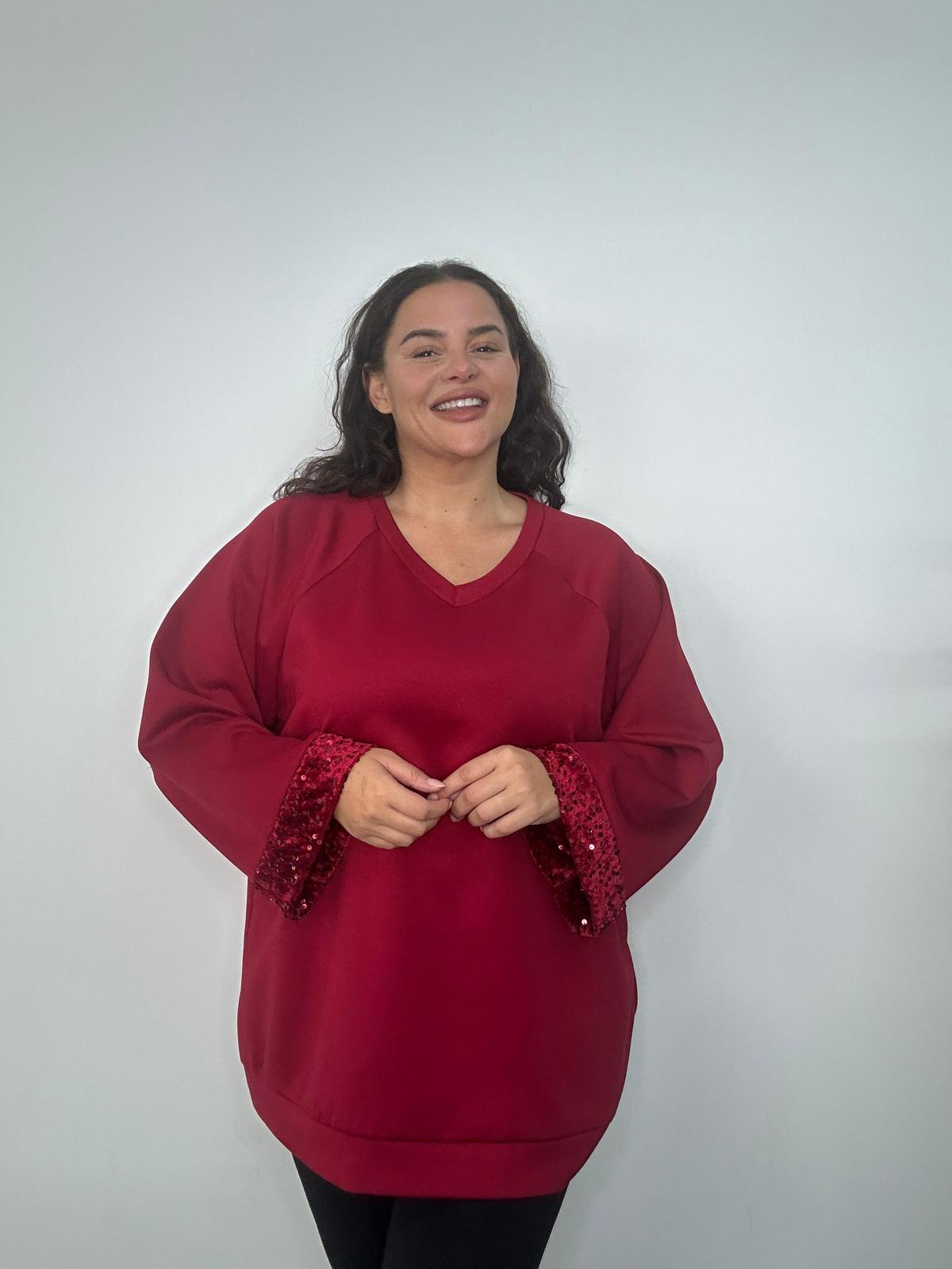 Bring a touch of sparkle to your plus size collection with this chic sequin cuff jumper. Crafted for both comfort and style, it features a soft, relaxed fit with eye-catching sequin trim on the wide sleeves adding a hint of glamour to everyday wear. The v-neck and easy pull-on design make it a versatile piece that can be dressed up or down. Perfect for boutiques and online retailers looking to stock fashionable plus size knitwear that combines elegance with wearability.
