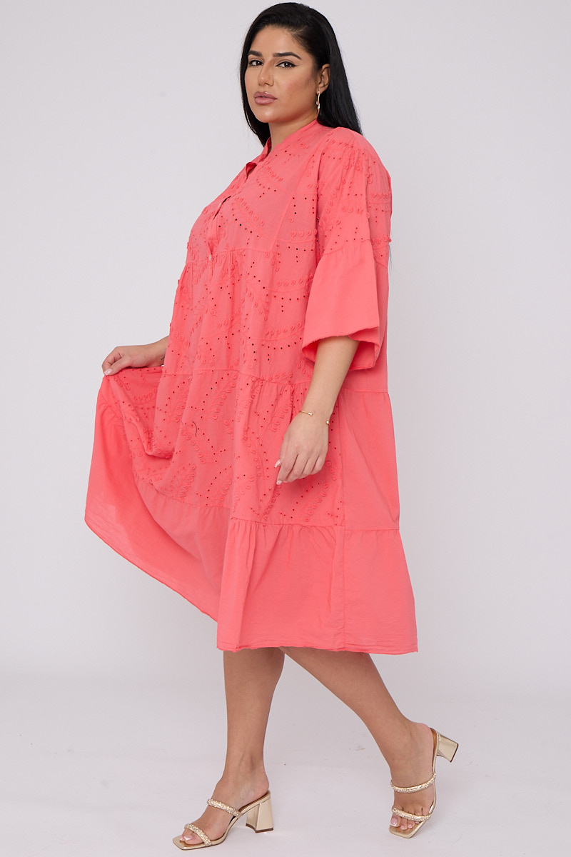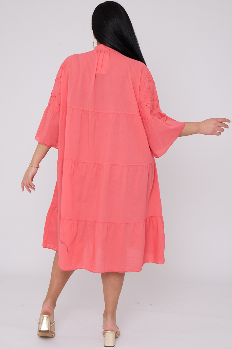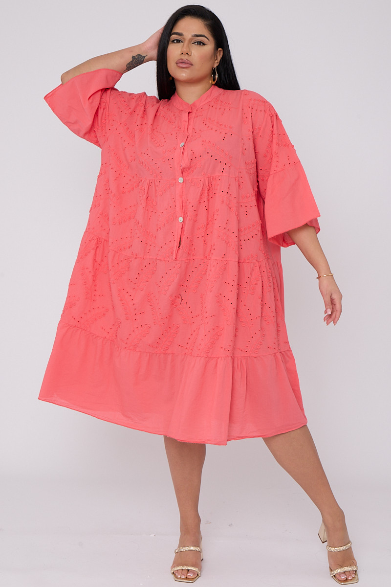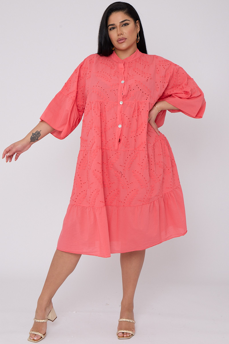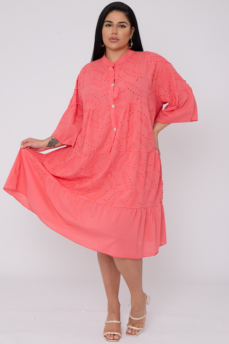 Plus Size Coral Broderie Button Top 3/4 Sleeves Dress x 5
