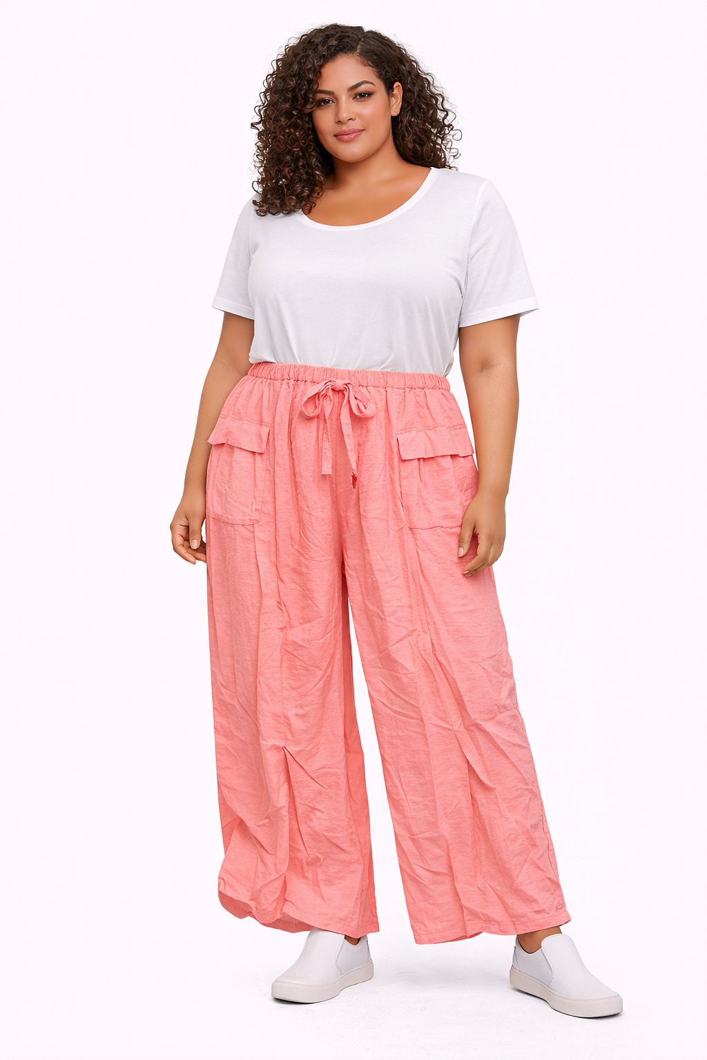 • Bring relaxed comfort to your curve collection with these plus size wide leg cargo trousers. Designed with a loose flowing silhouette, this lightweight style offers effortless wearability while delivering strong trend appeal for modern plus size customers. Featuring an elasticated drawstring waistband for an adjustable fit, these trousers combine practicality with fashion-forward styling. The oversized cargo-style patch pockets add a contemporary edge, while the airy fabric ensures comfort throughout the day, perfect for warmer seasons or casual layering. A standout piece for UK wholesale buyers, these curve trousers are ideal for boutiques and online retailers looking to introduce statement colour into their plus size casualwear ranges.