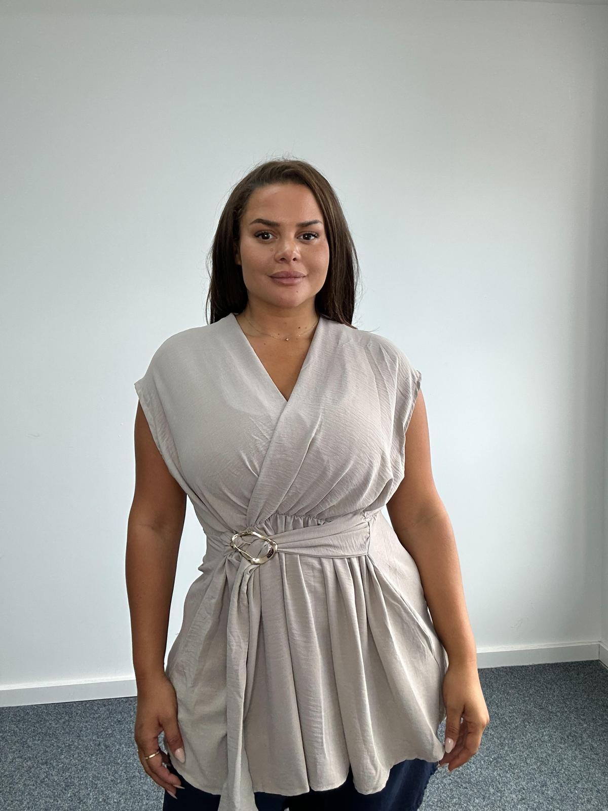 Elevate your curve collection with this chic beige wrap front top, designed specifically for plus-size fashion. Crafted from lightweight, breathable fabric, this sleeveless top features a flattering wrap neckline, a peplum silhouette, and an adjustable gathered waist with a gold-tone buckle detail for a stylish finish. Perfect for transitioning from workwear to weekend, this versatile piece adds elegance and comfort to any wardrobe.