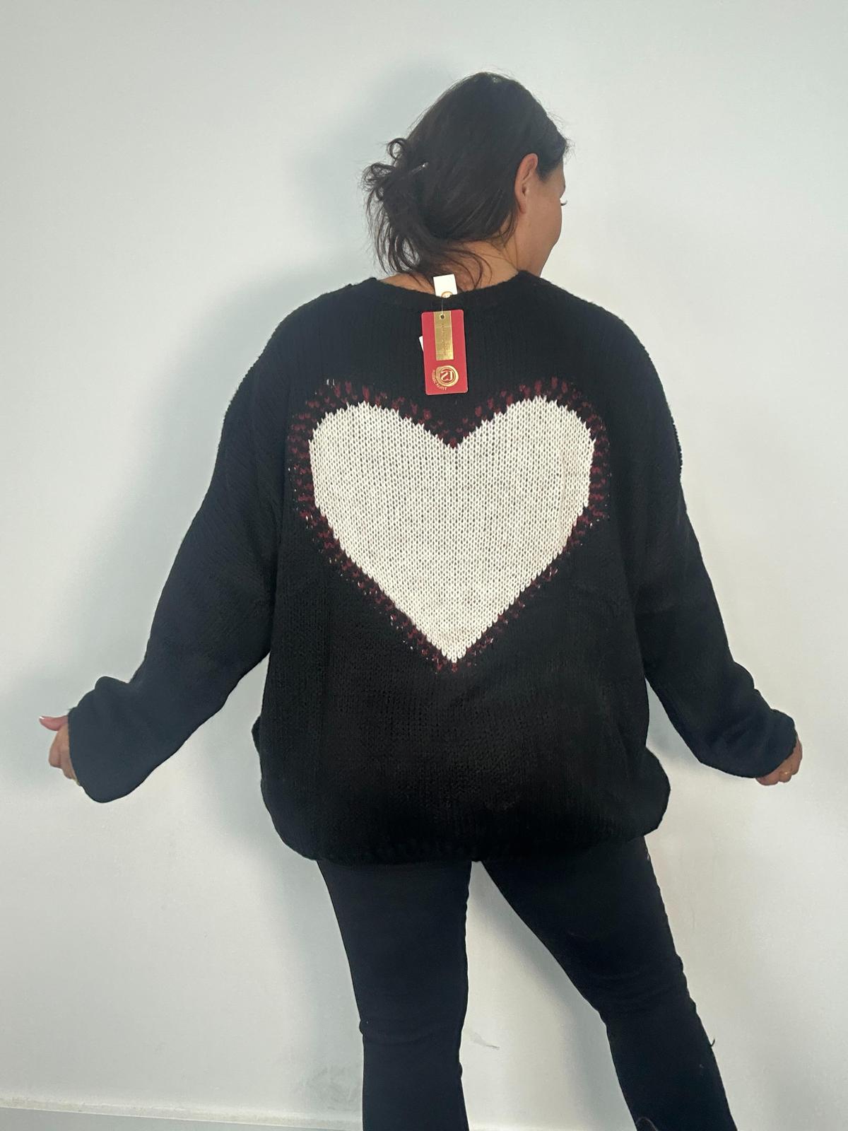 Add playful charm to your wholesale knitwear line with this plus size knit jumper featuring a bold white heart motif on the front and back. Designed in a relaxed oversized fit, it offers comfort and style for curvy women. This cosy sweater is perfect for casual outfits, giving your customers a fun statement piece while keeping them warm and stylish.