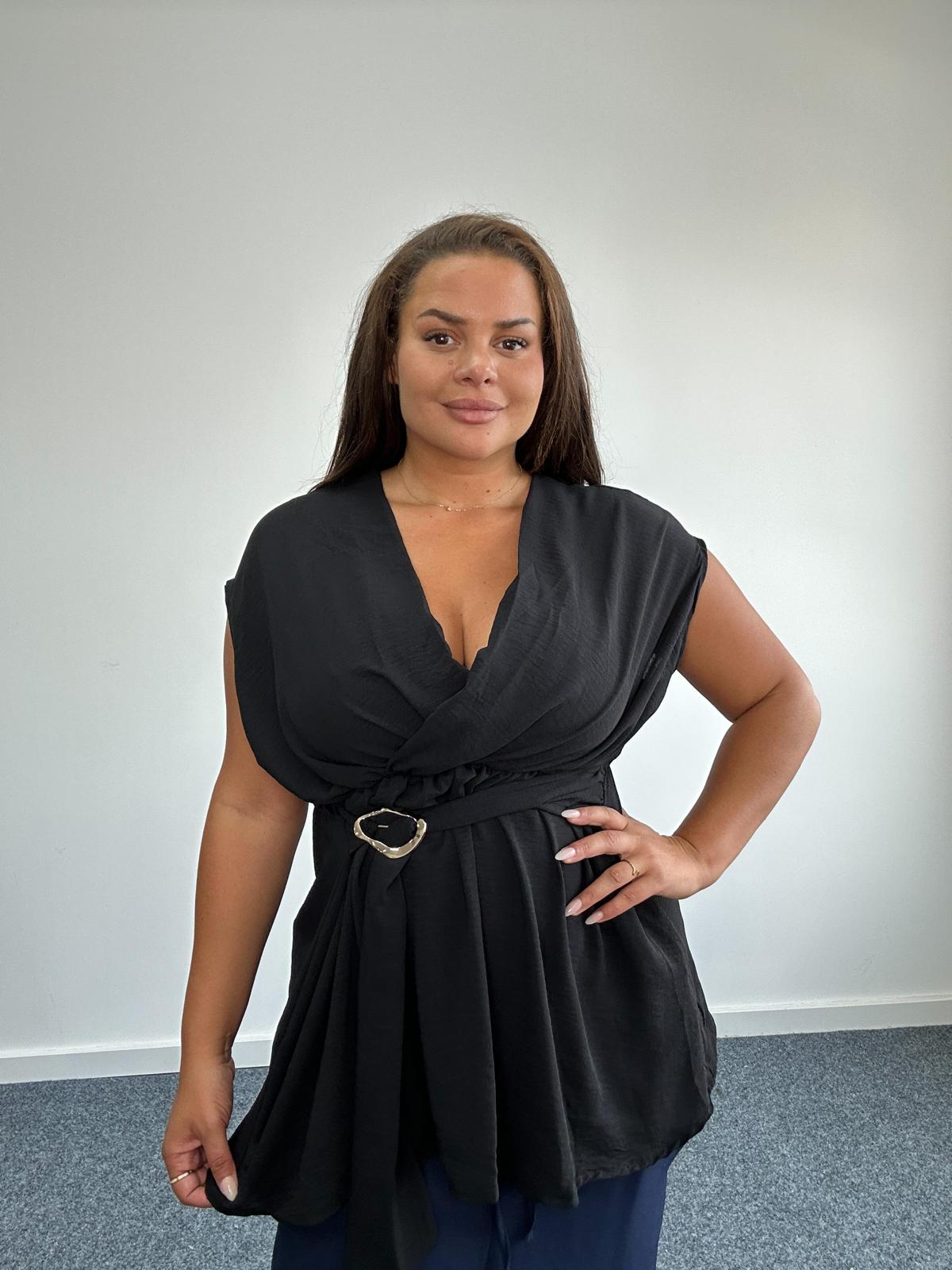 Elevate your curve collection with this chic black wrap front top, designed specifically for plus-size fashion. Crafted from lightweight, breathable fabric, this sleeveless top features a flattering wrap neckline, a peplum silhouette, and an adjustable gathered waist with a gold-tone buckle detail for a stylish finish. Perfect for transitioning from workwear to weekend, this versatile piece adds elegance and comfort to any wardrobe.