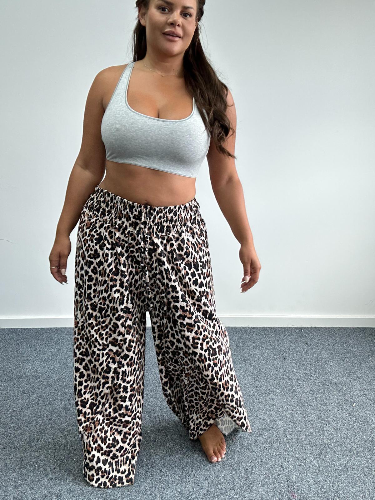 Add bold energy to your curve collection with these animal print trousers. Designed in a relaxed wide-leg silhouette with a soft, fluid drape, they feature an elasticated waistband with a drawstring tie for easy pull-on comfort. The eye-catching leopard-style print makes these trousers a standout piece for casual, lounge, or holiday collections.