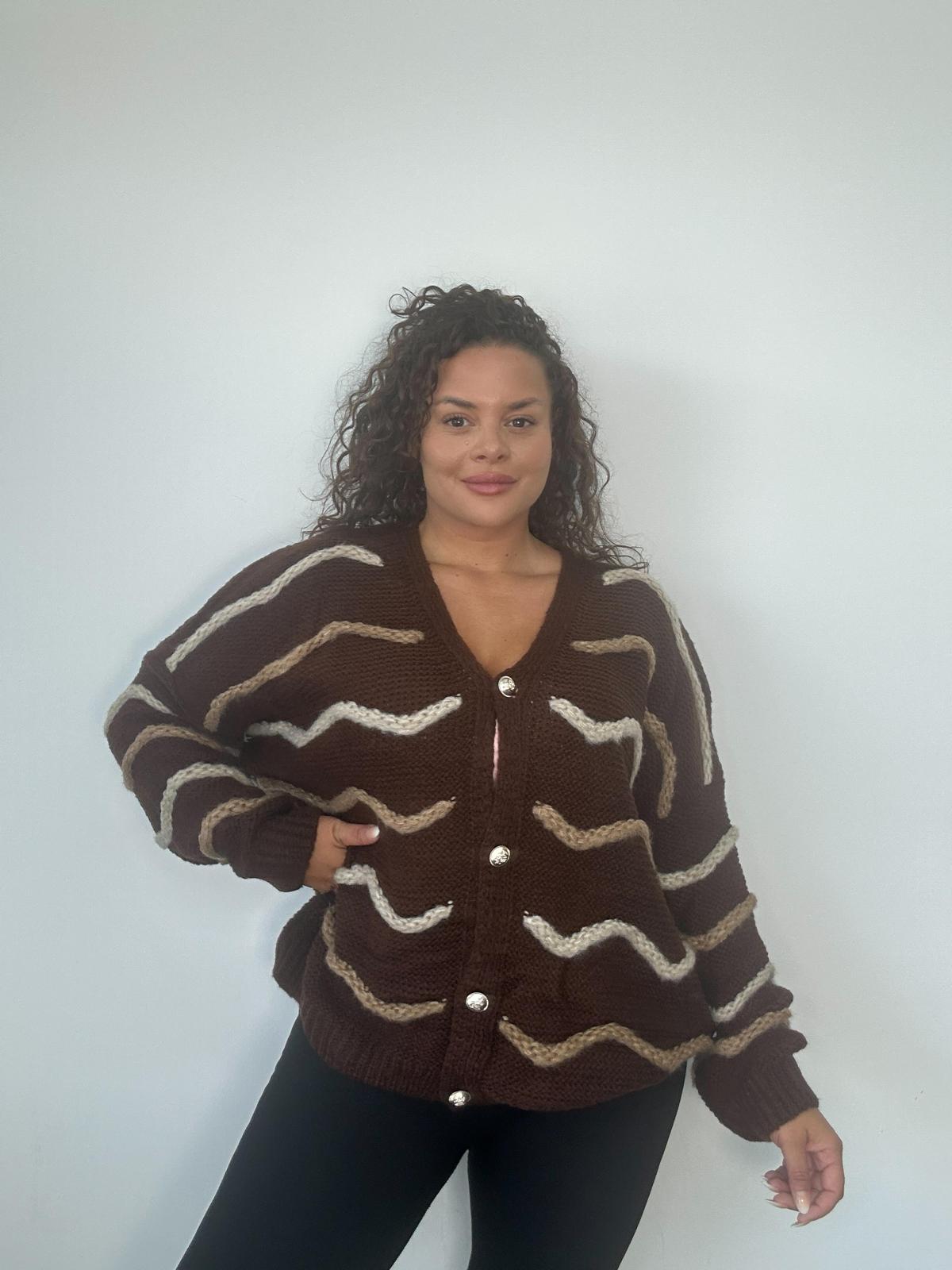 Plus Size Curve Brown Knitted Cardigan with Wave Stripe Design x 2, 3 & 5 Pack Options