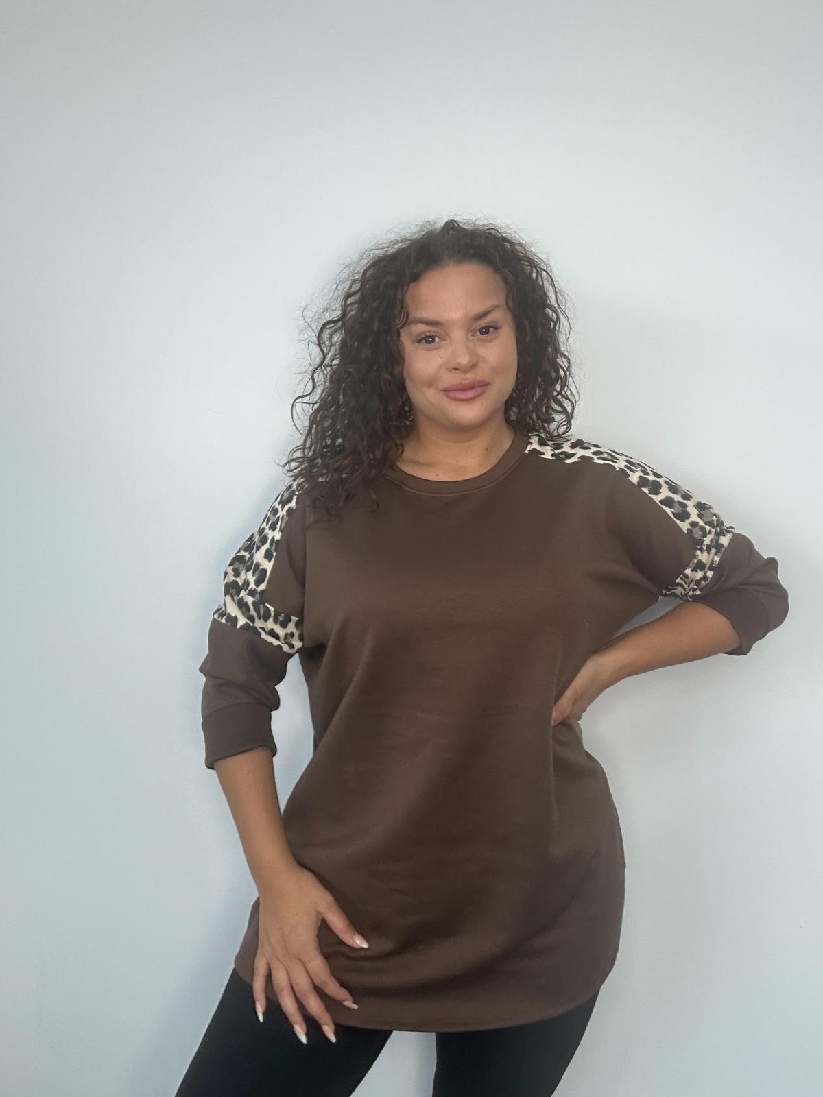 Plus Size Curve Brown Longline Top with Leopard Print Sleeve Detail x 2, 3 & 5 Pack Options