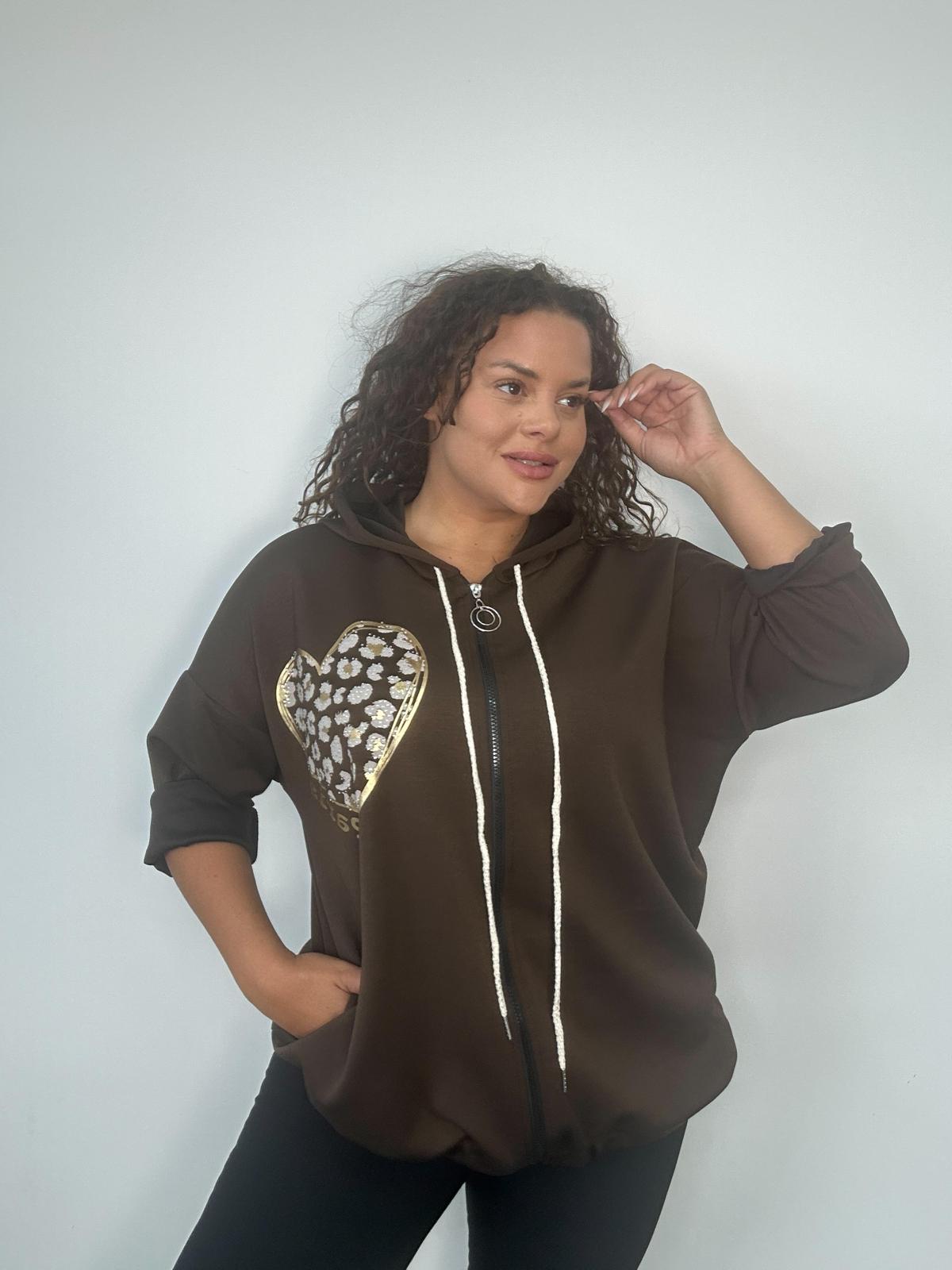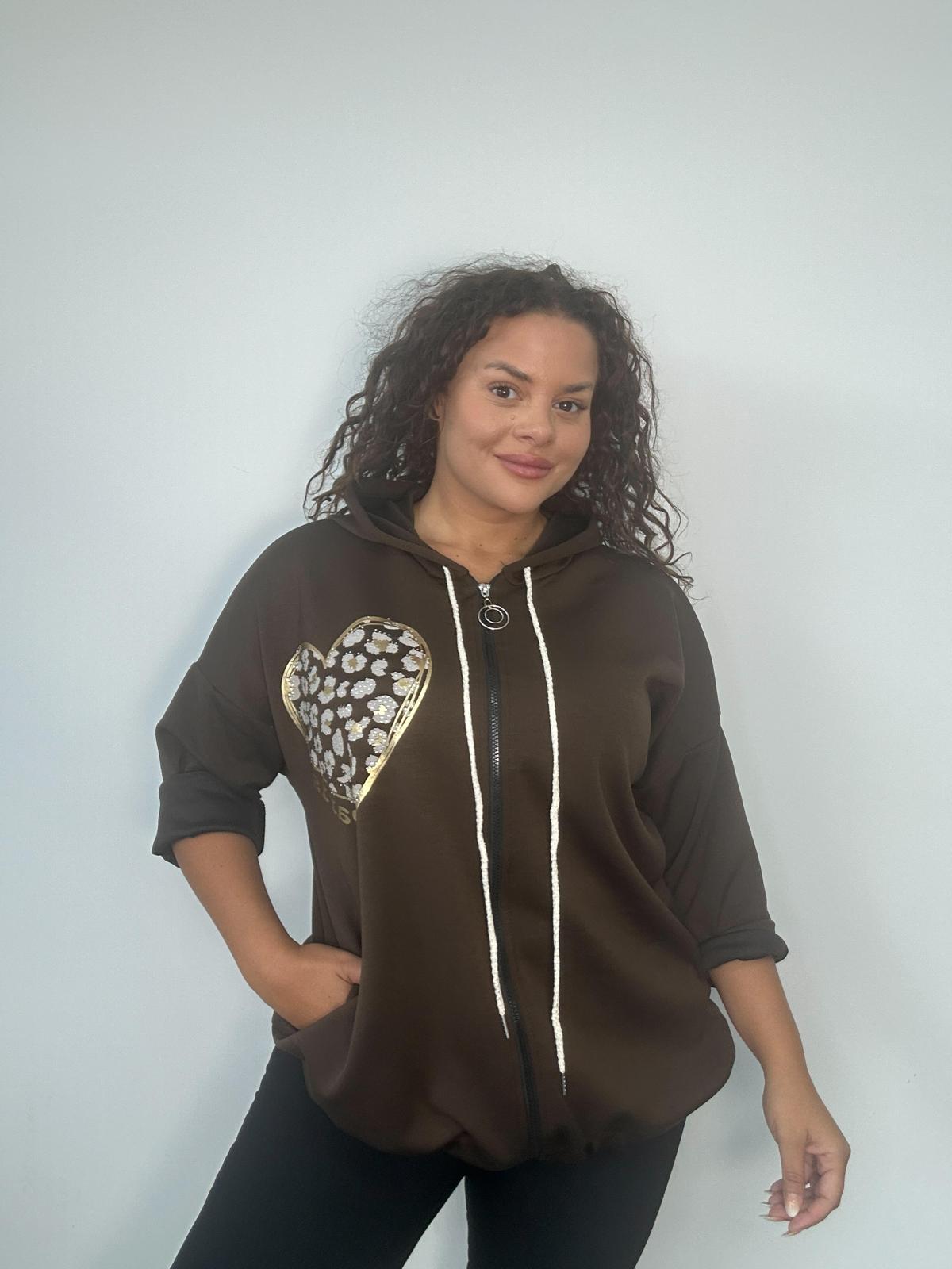 Plus Size Curve Brown Zip Up Hoodie with Leopard Heart Print x 2, 3 & 5 Pack Options