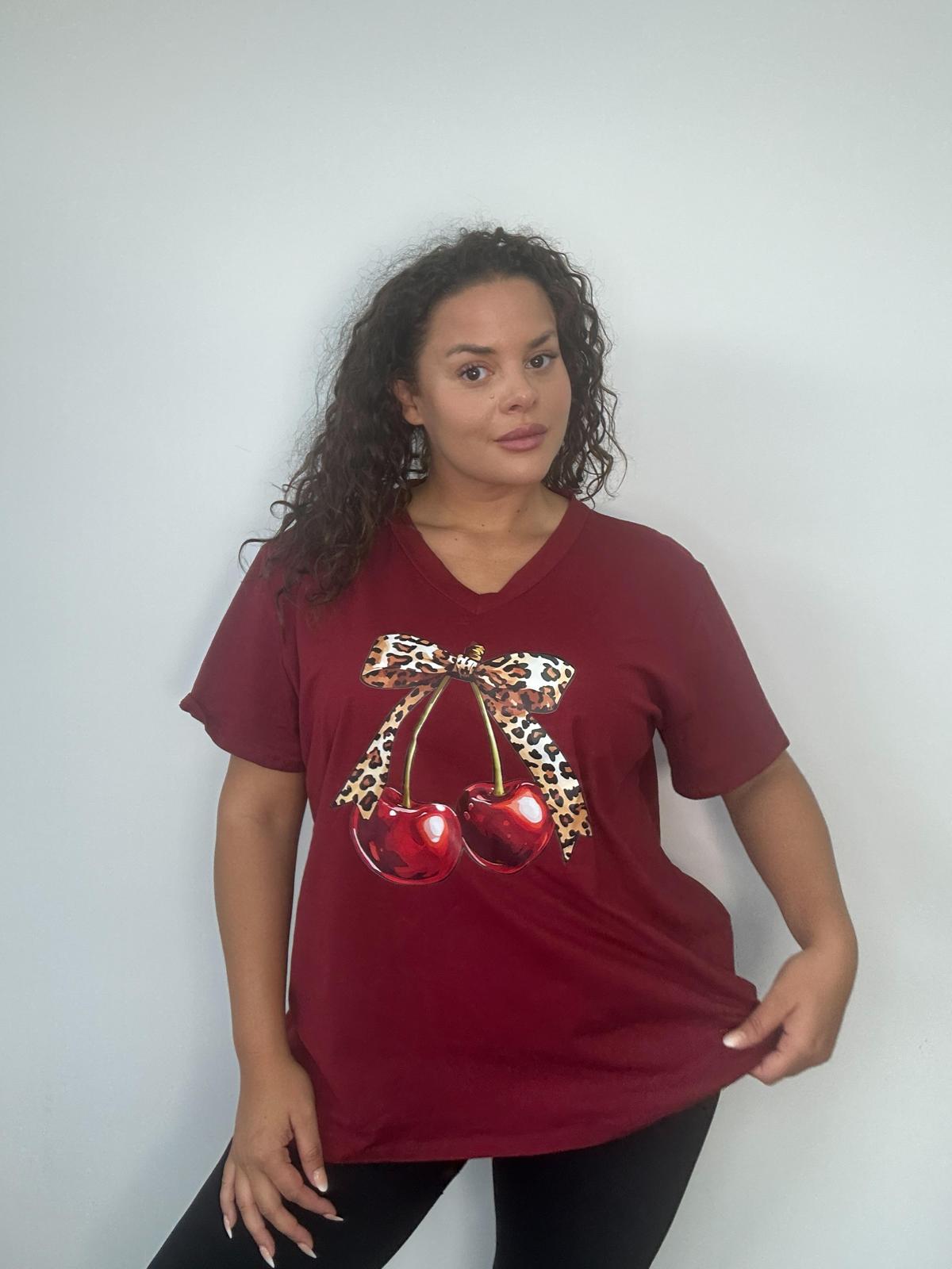 Plus Size Curve Burgundy Cherry Print T Shirt with Leopard Bow x 2, 3 & 5 Pack Options