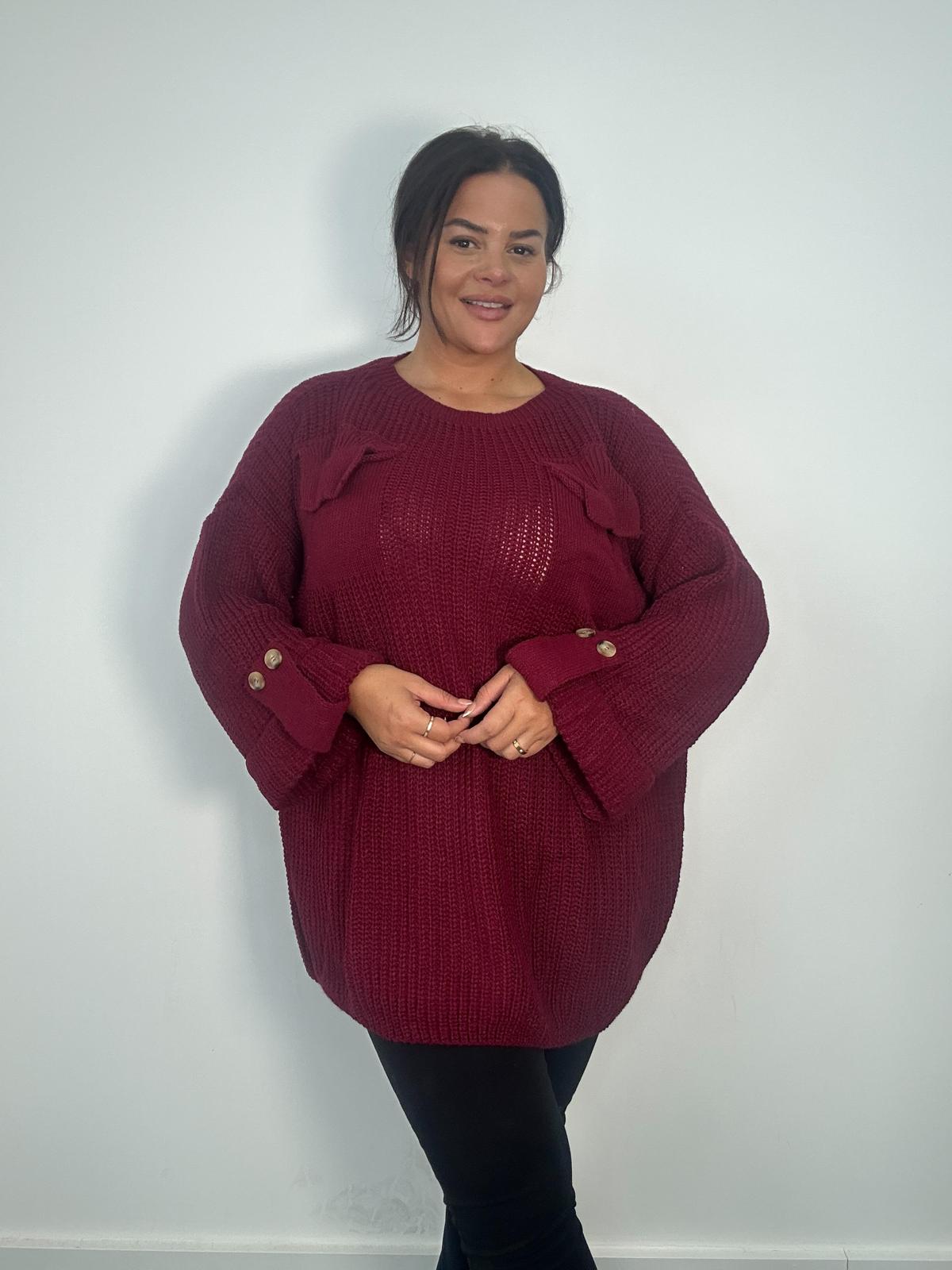 Plus Size Curve Burgundy Knit Jumper with Bow Detail & Button Cuff x 2, 3 & 5 Pack Options