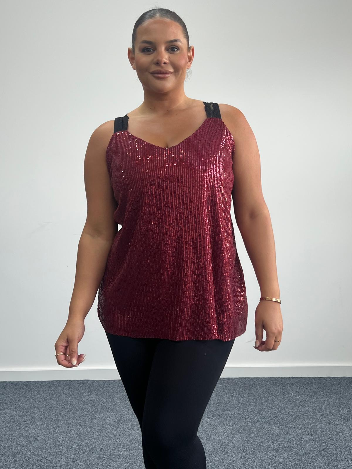 Plus Size Curve Burgundy Sequin Cami Top with Lace Straps x 2, 3 & 5 Pack Options