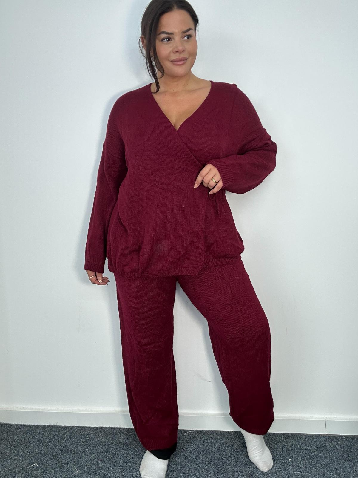 Plus Size Curve Burgundy Wrap Knit 2 Piece Co Ord Lounge Set x 2, 3 & 5 Pack Options